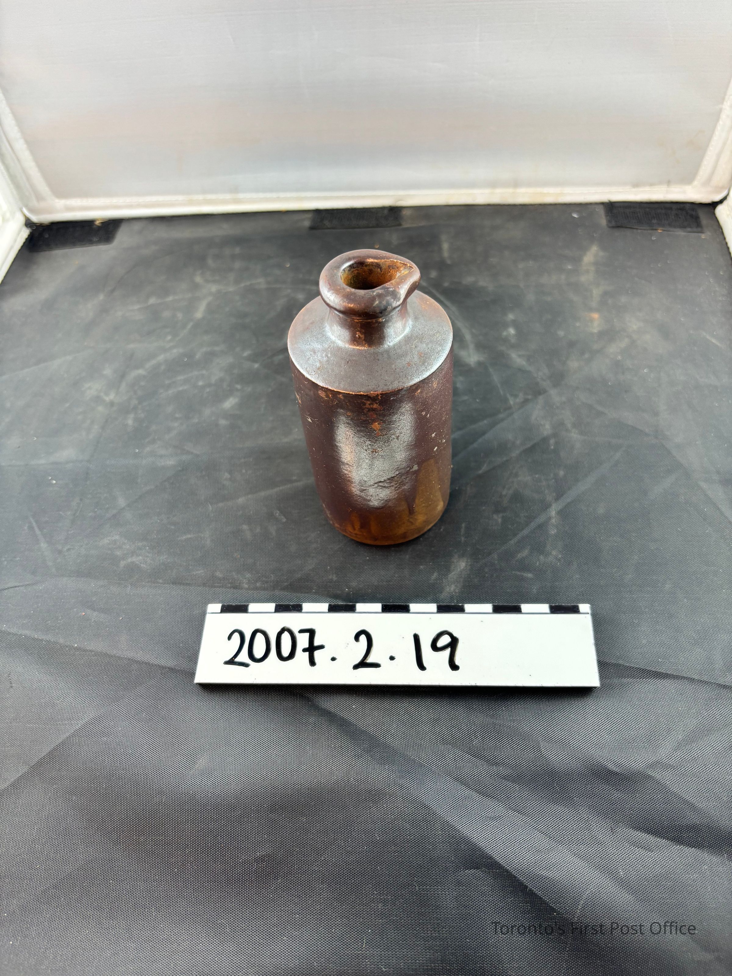 Ink bottle; dark brown earthenware with glazed basalt finish; pouring lip; c. 19th century.Dimensions