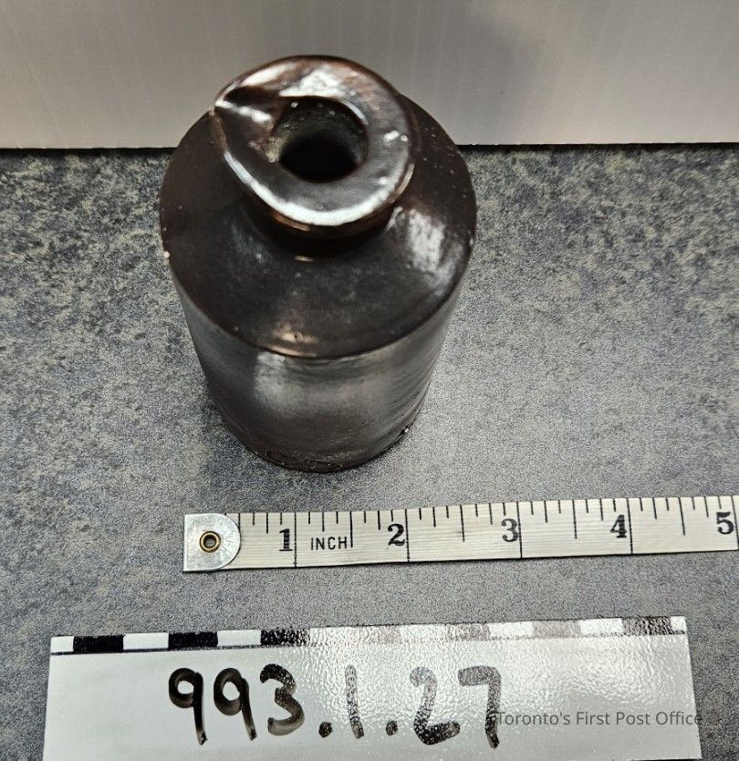 Ink bottle; stoneware; dark brown; pouring lip; cork inside; impressed near base: "Boulton 20 Lambeth"; circa 19th C.Dimensions
