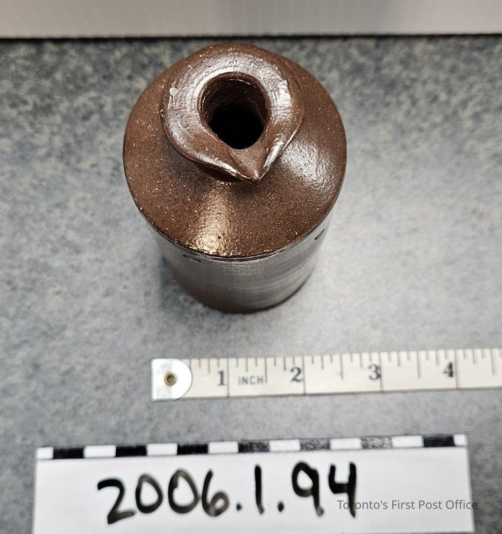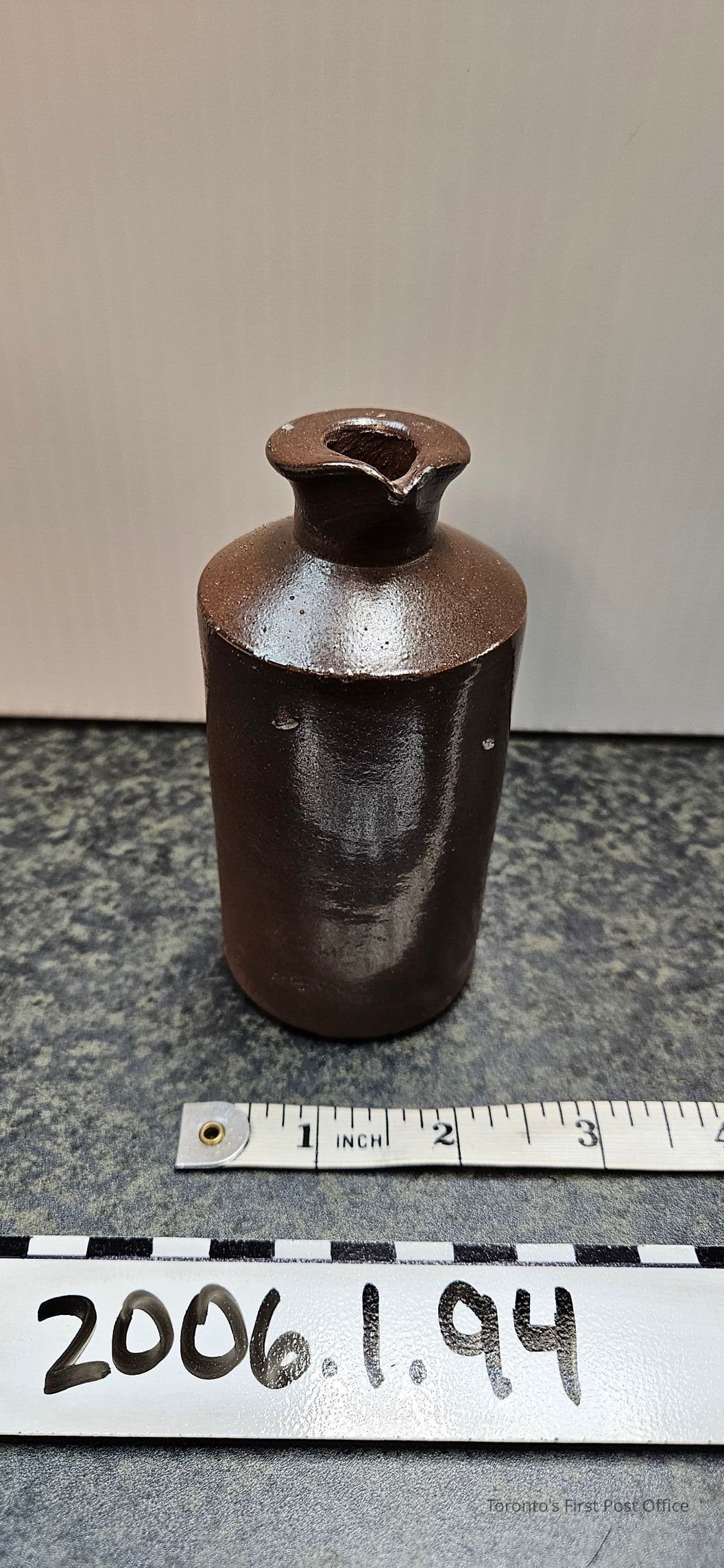 Ink bottle with pouring lip; pottery; stamped "LOVATT & LOVATT LANGLEY MILL NOTTS."; dark brown glaze.Dimensions