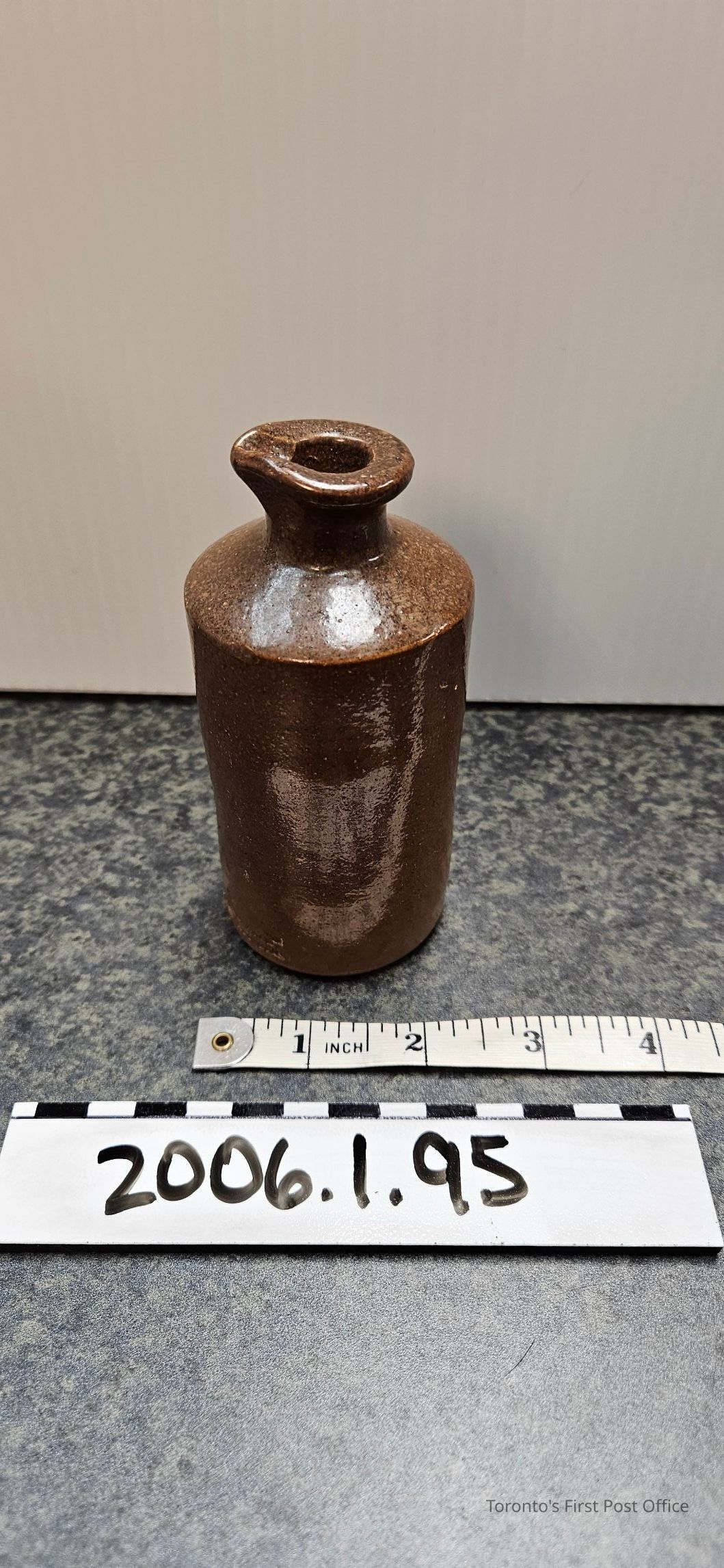 Ink bottle with pouring lip; pottery; stamped "LOVATT & LOVATT, LTD.."; light brown glaze.Dimensions