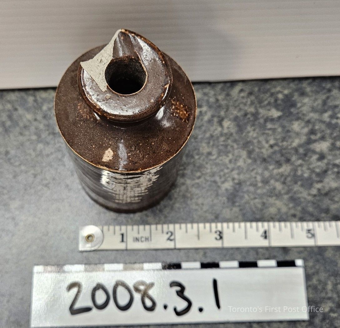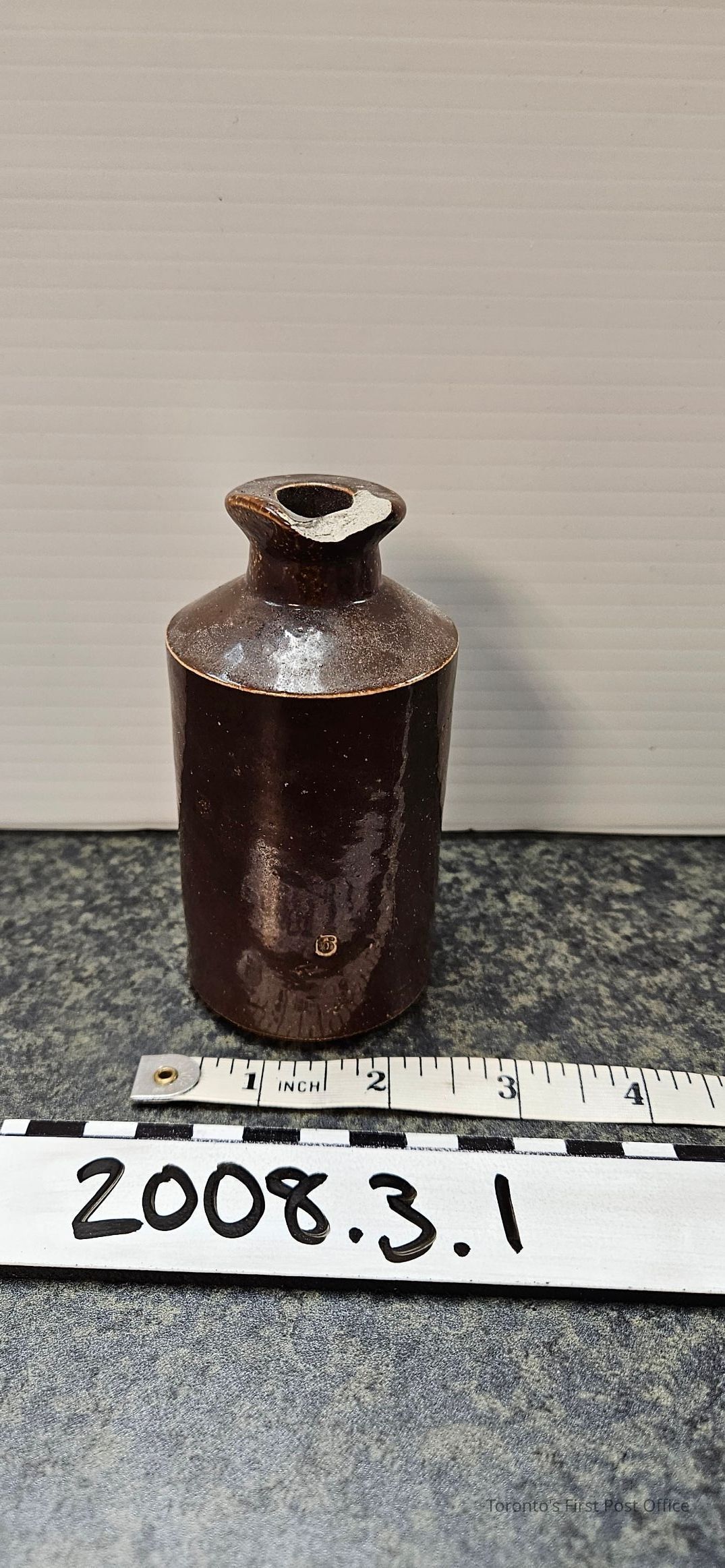 Ink bottle, earthenware with dark brown glaze; pouring lip; marked "6" (stamped heavily); a "20" within circle of letters (unreadable); c. 1900.Dimensions