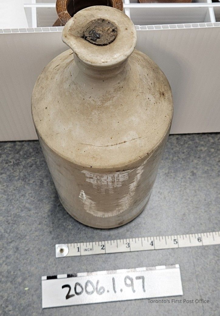 Ink bottle with pouring spout; pottery with white glaze; corked; stamped "… VANCROFT GLASGOW 5" and "40".Dimensions