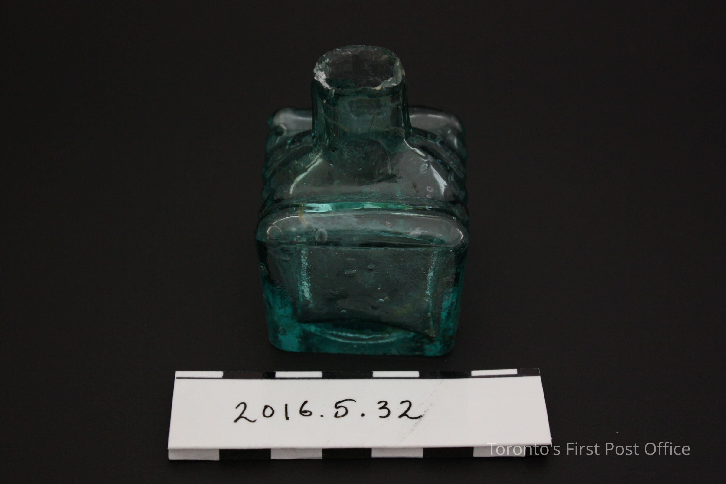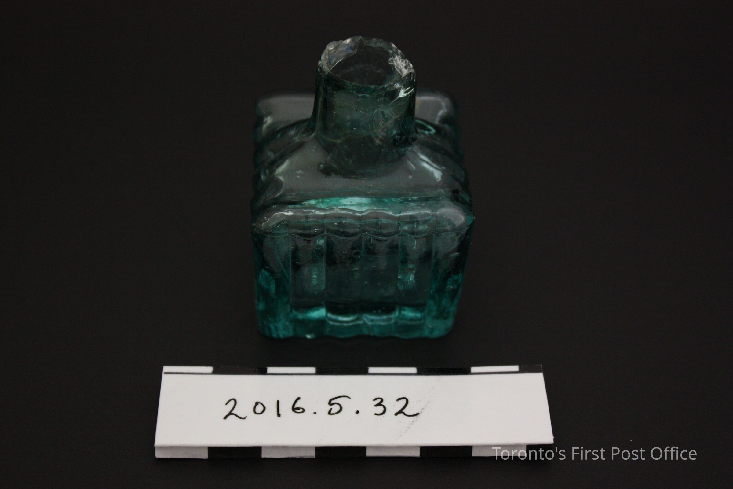 Rectangular molded blue glass ink bottle. Ridged sides.