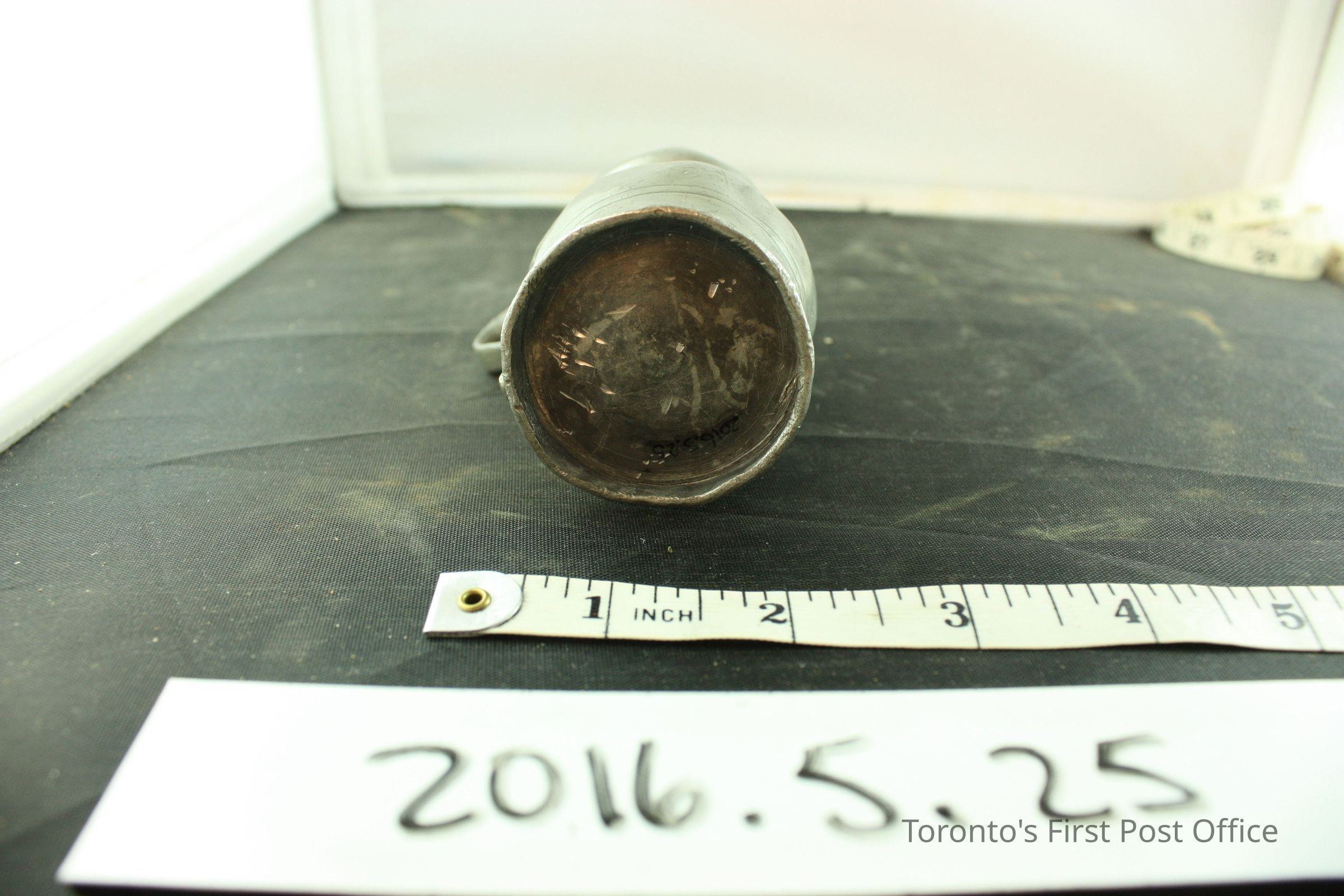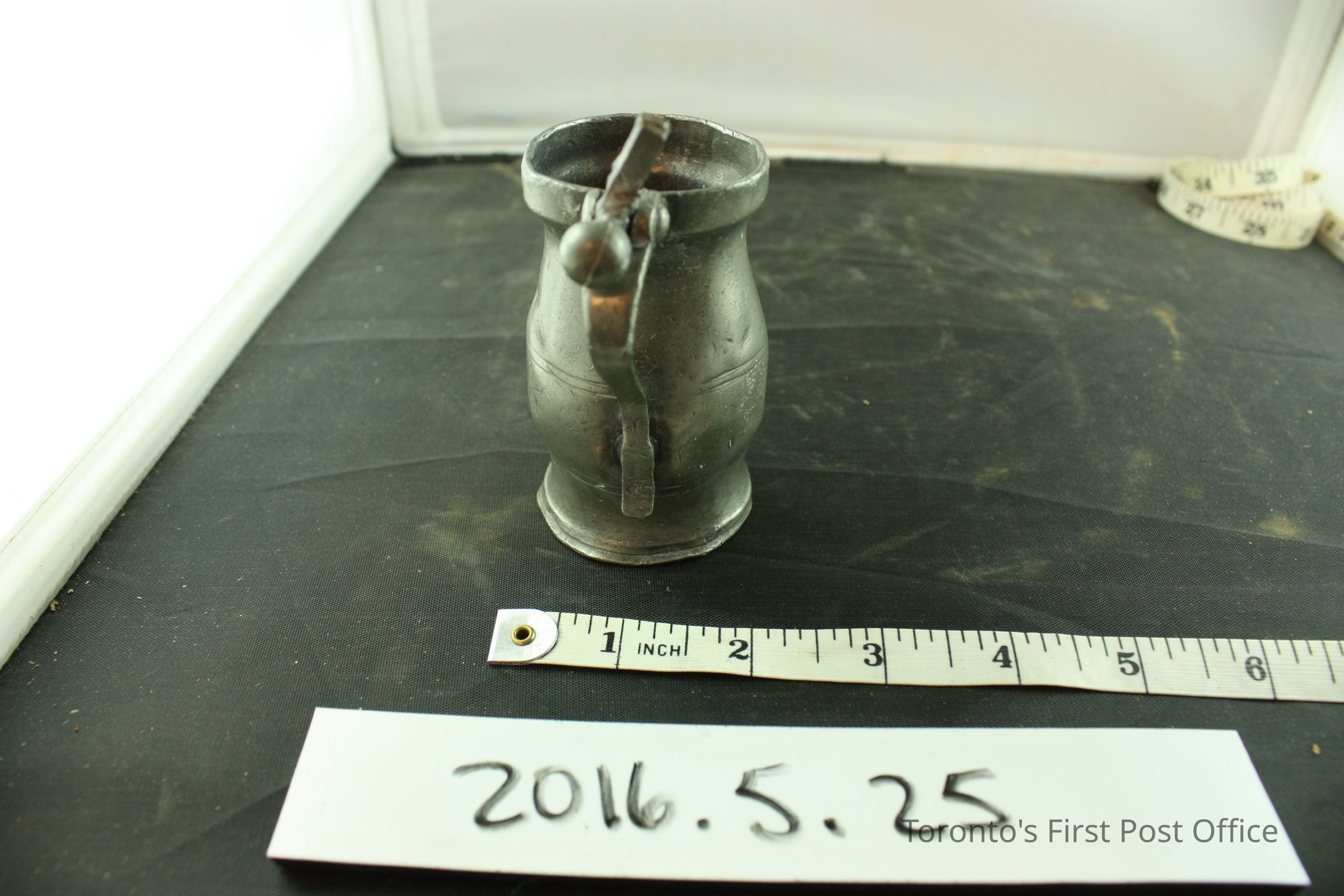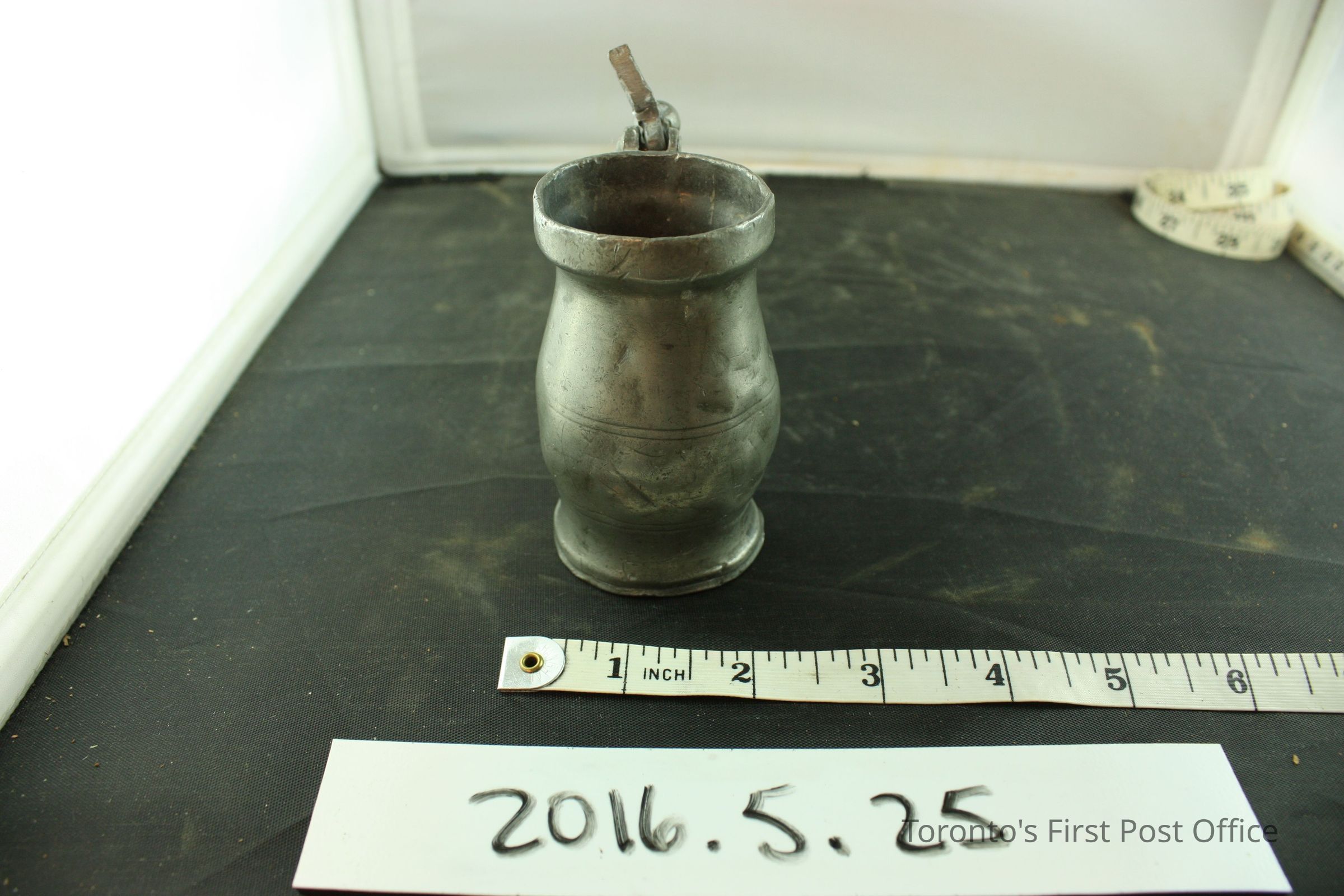 Pewter ink jar with handle and hinge with knob (lid missing). Four incized decorative lines around body.Dimensions