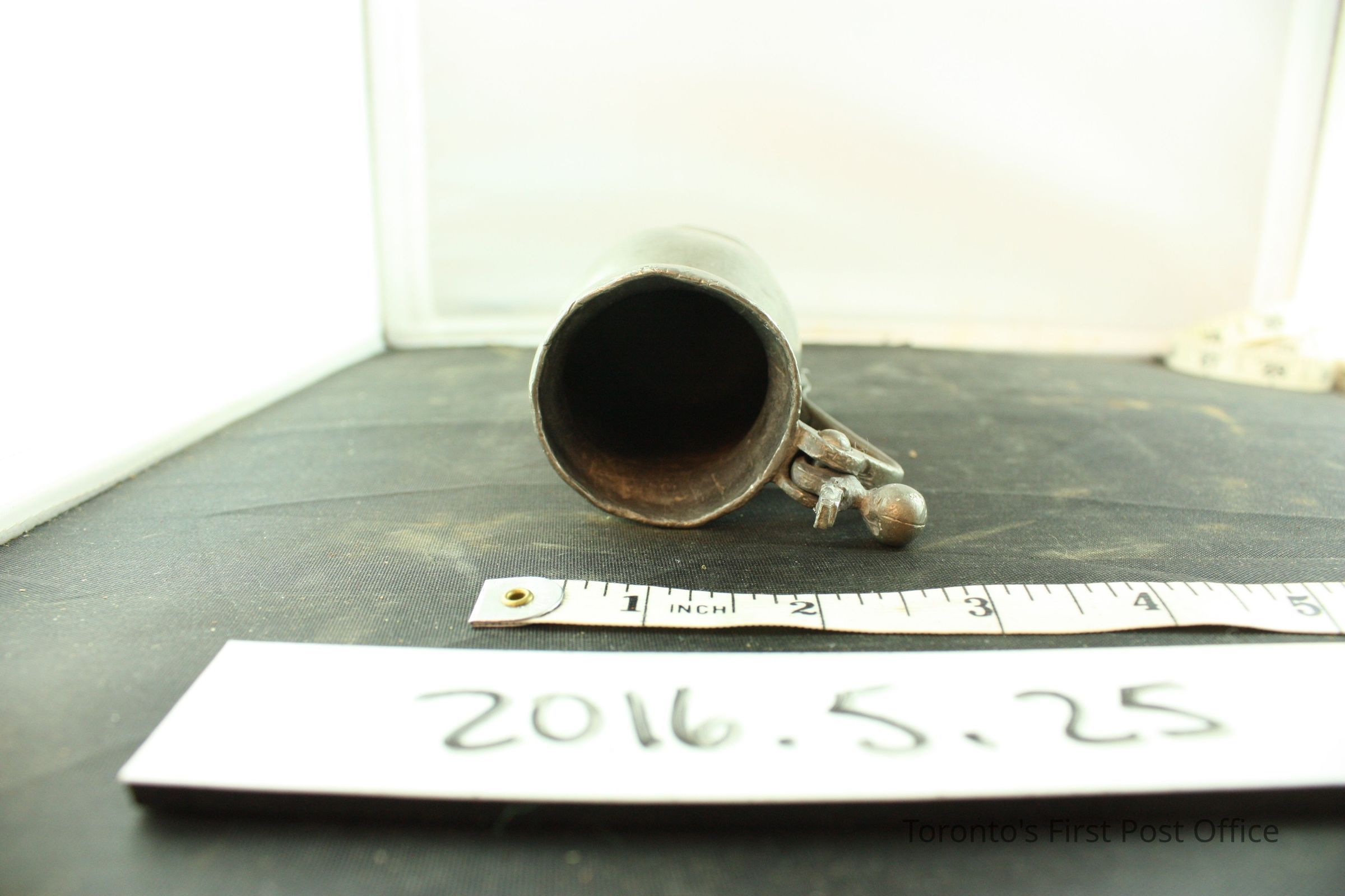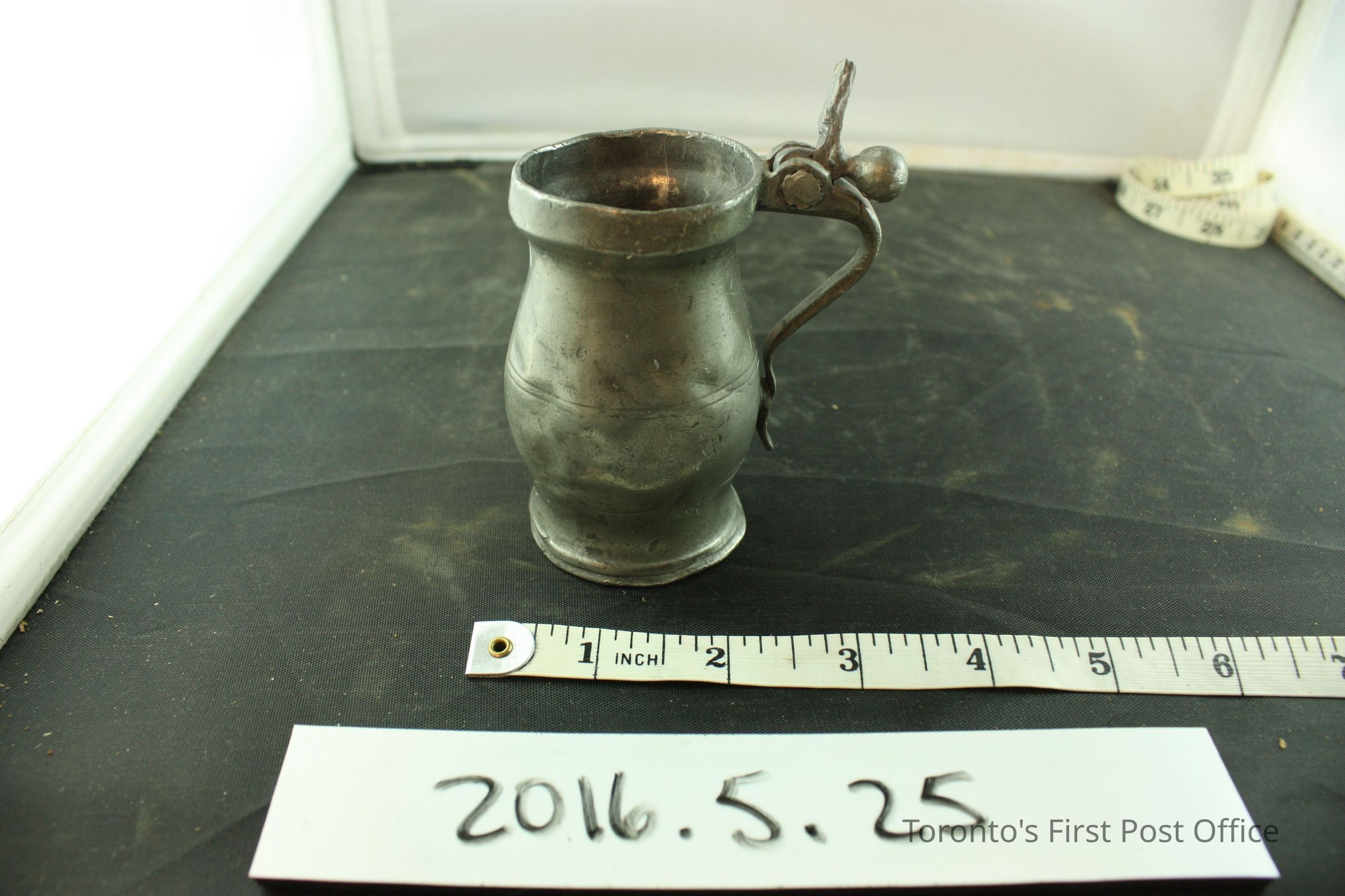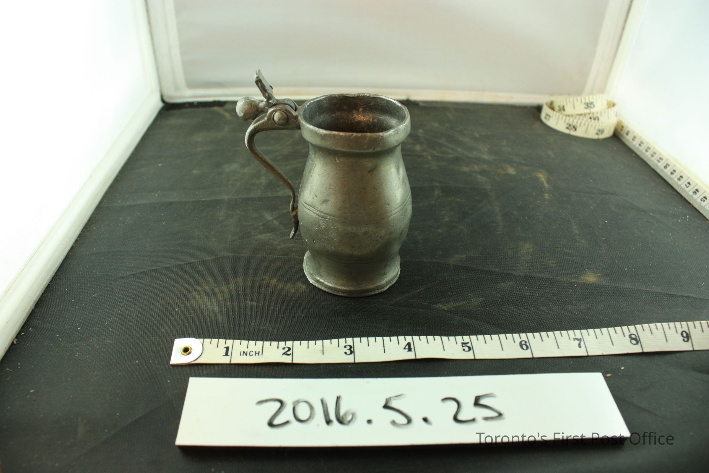 Pewter ink jar with handle and hinge with knob (lid missing). Four incized decorative lines around body.Dimensions