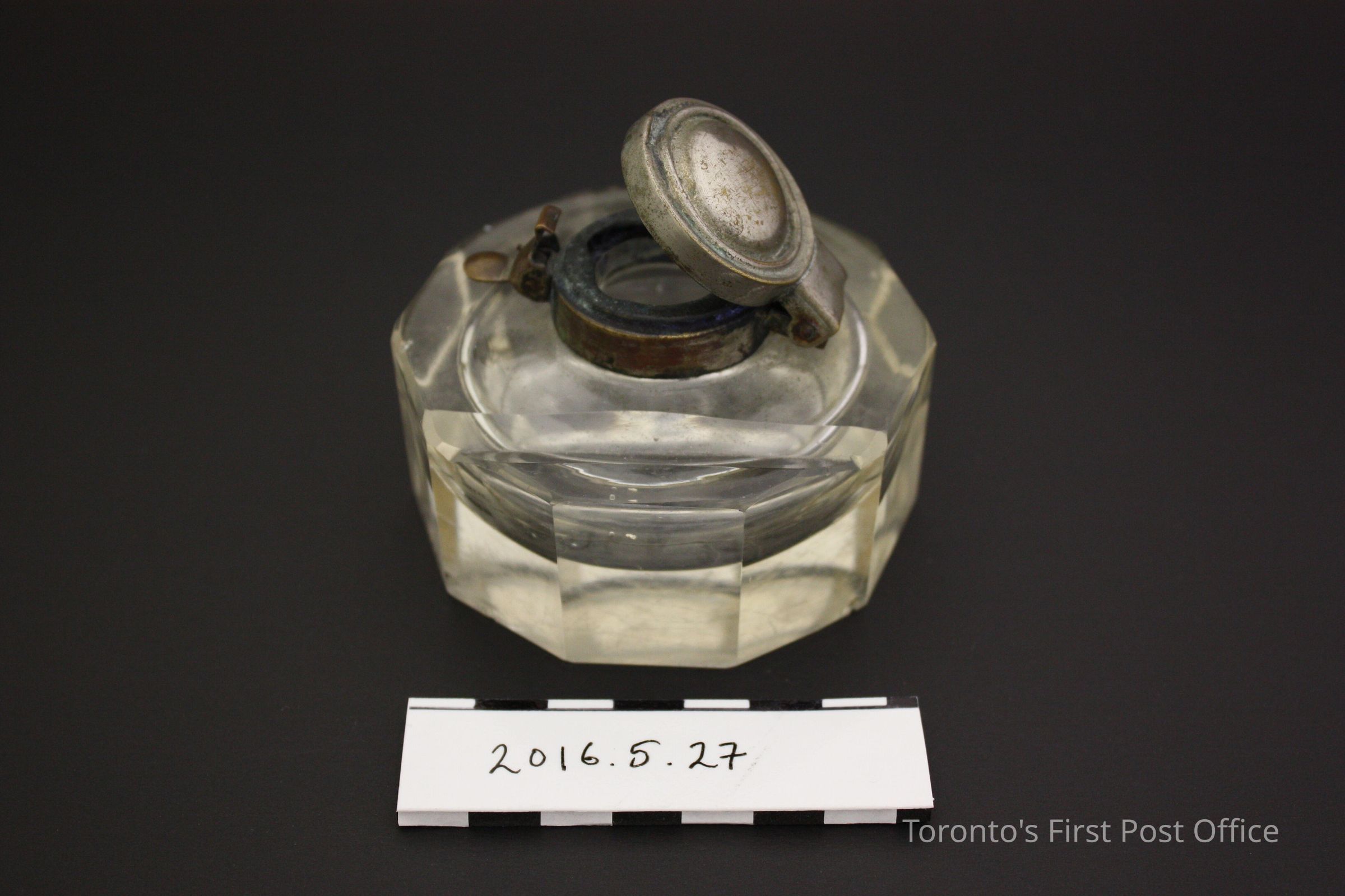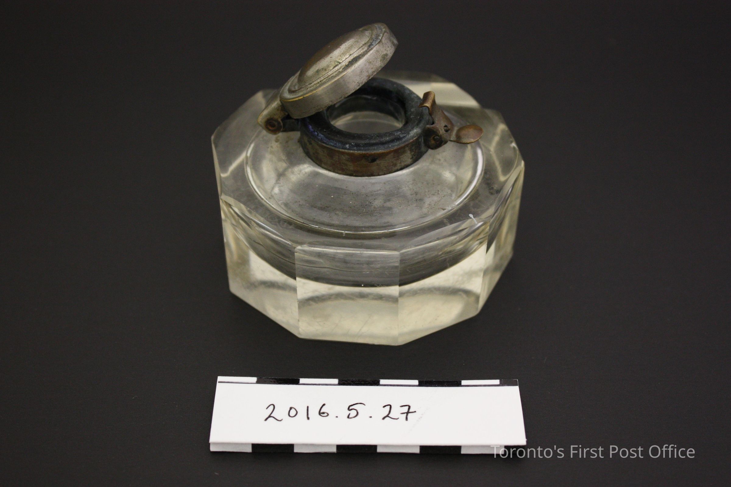 Decogonal, cut glass, ink well with a metal hinged lid. Ink well has cut-in channel for a pen to rest in. Hinged lid has a clip locking mechanism.Dimensions