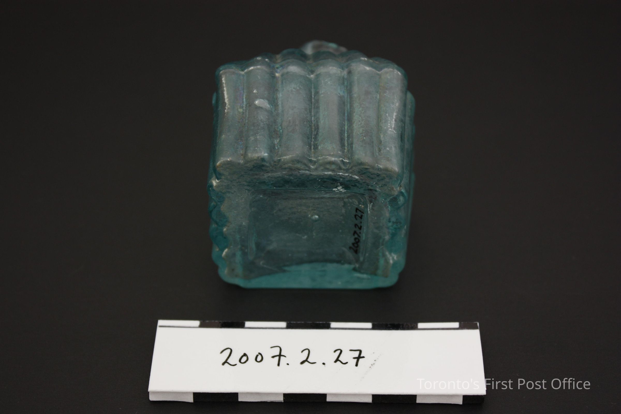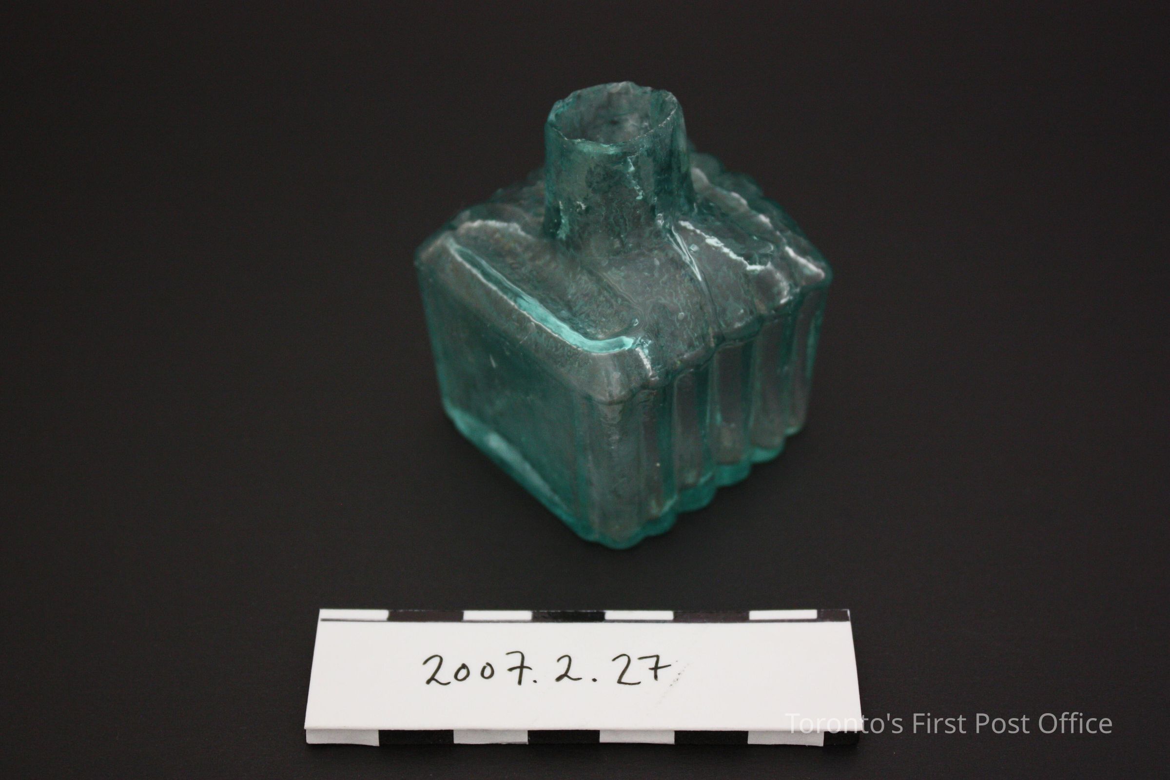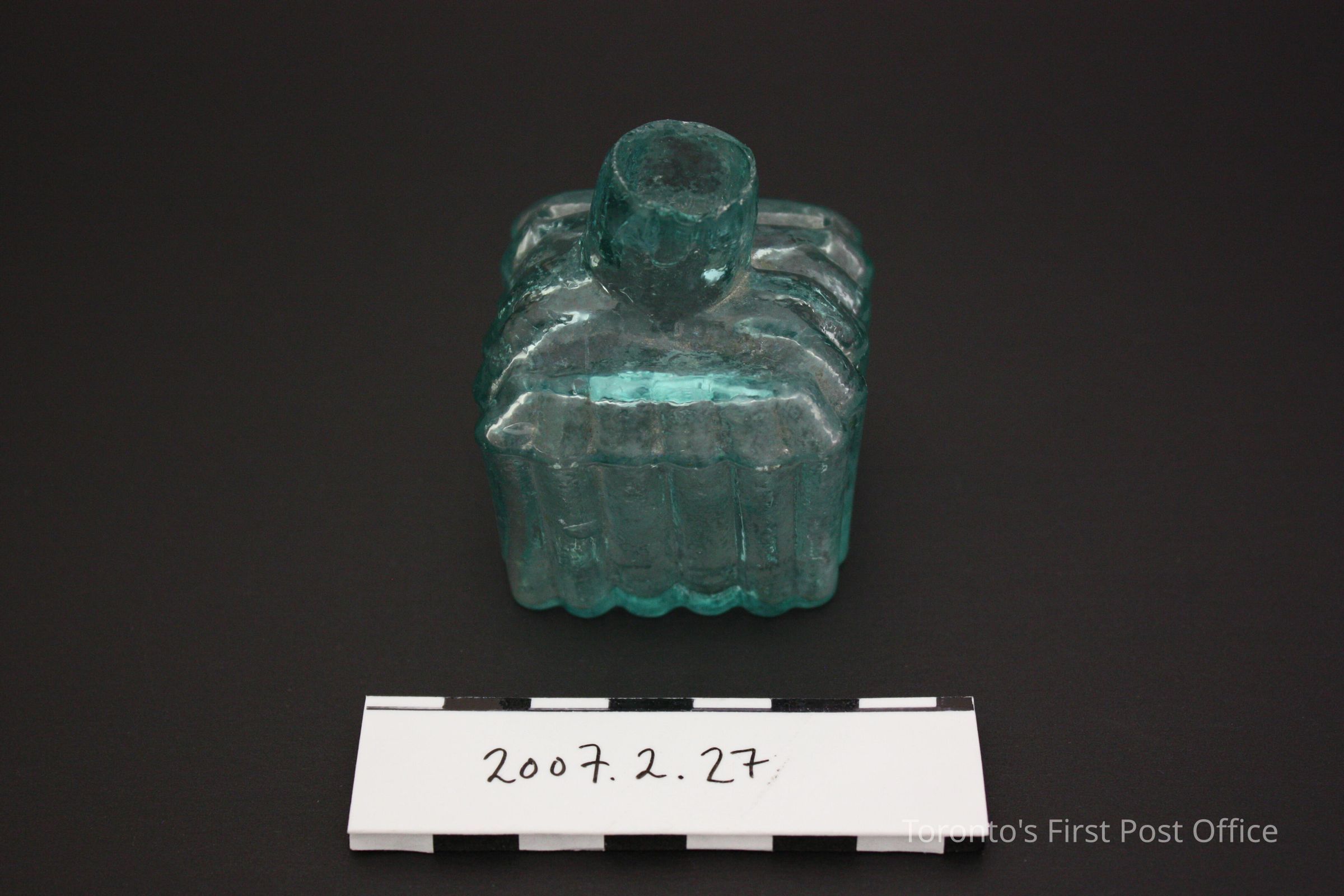 Glass inkwell; mould-blown; two seams; two part construction; round mouth and neck; square base with double square indentation; ridges on three sides of inkwell and on top; one side is flat; jagged mouth edge; turquoise-coloured glass; neck seems to lean to one side; c. 1880-1910.Dimensions