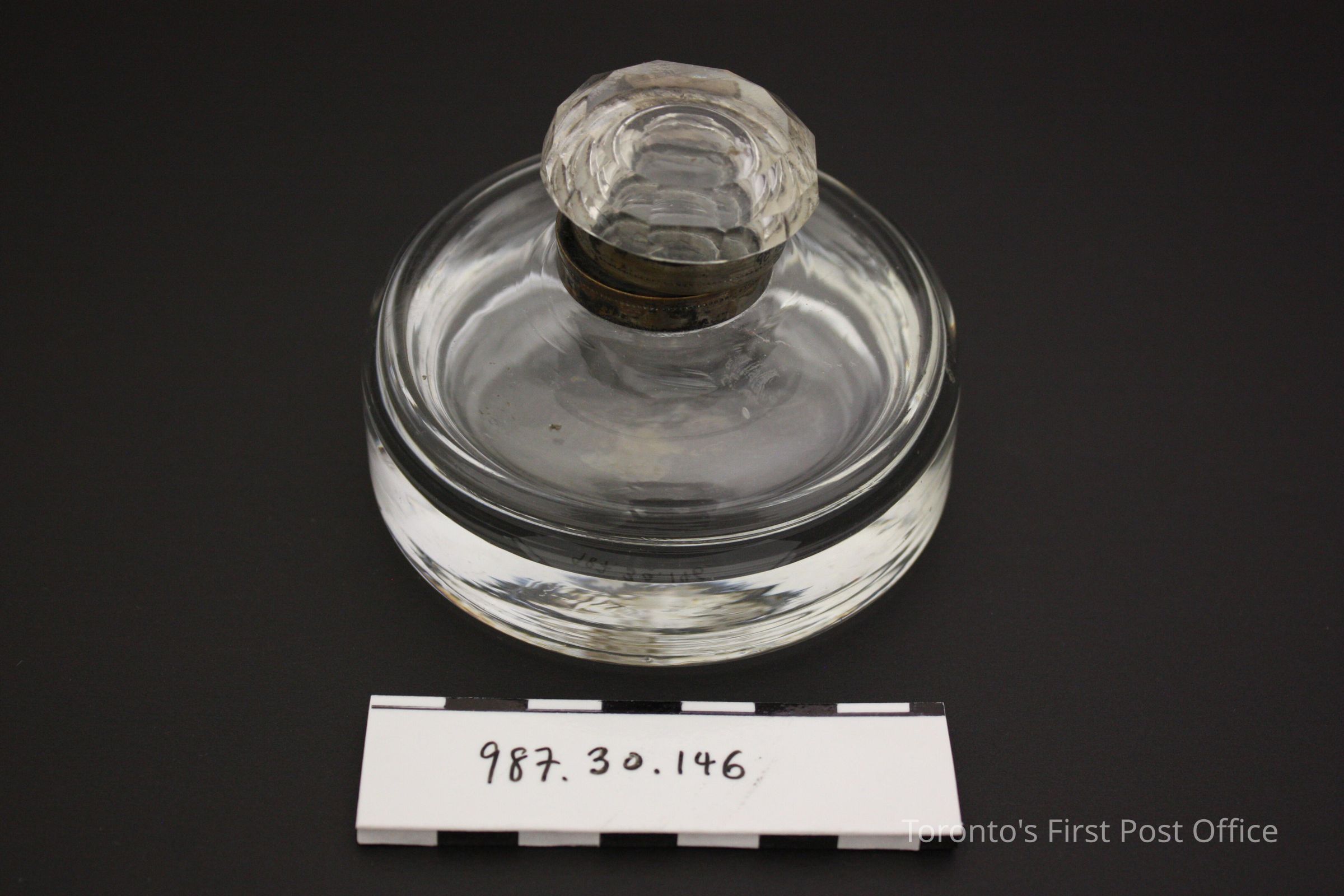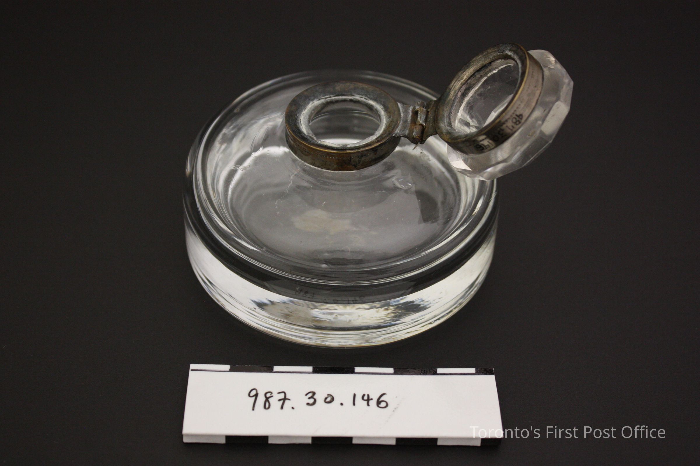 Glass, blown inkwell; glass lid attached to base by circular brass fitting attached to bottom of lid and top of container; circa mid-19th century.Dimensions