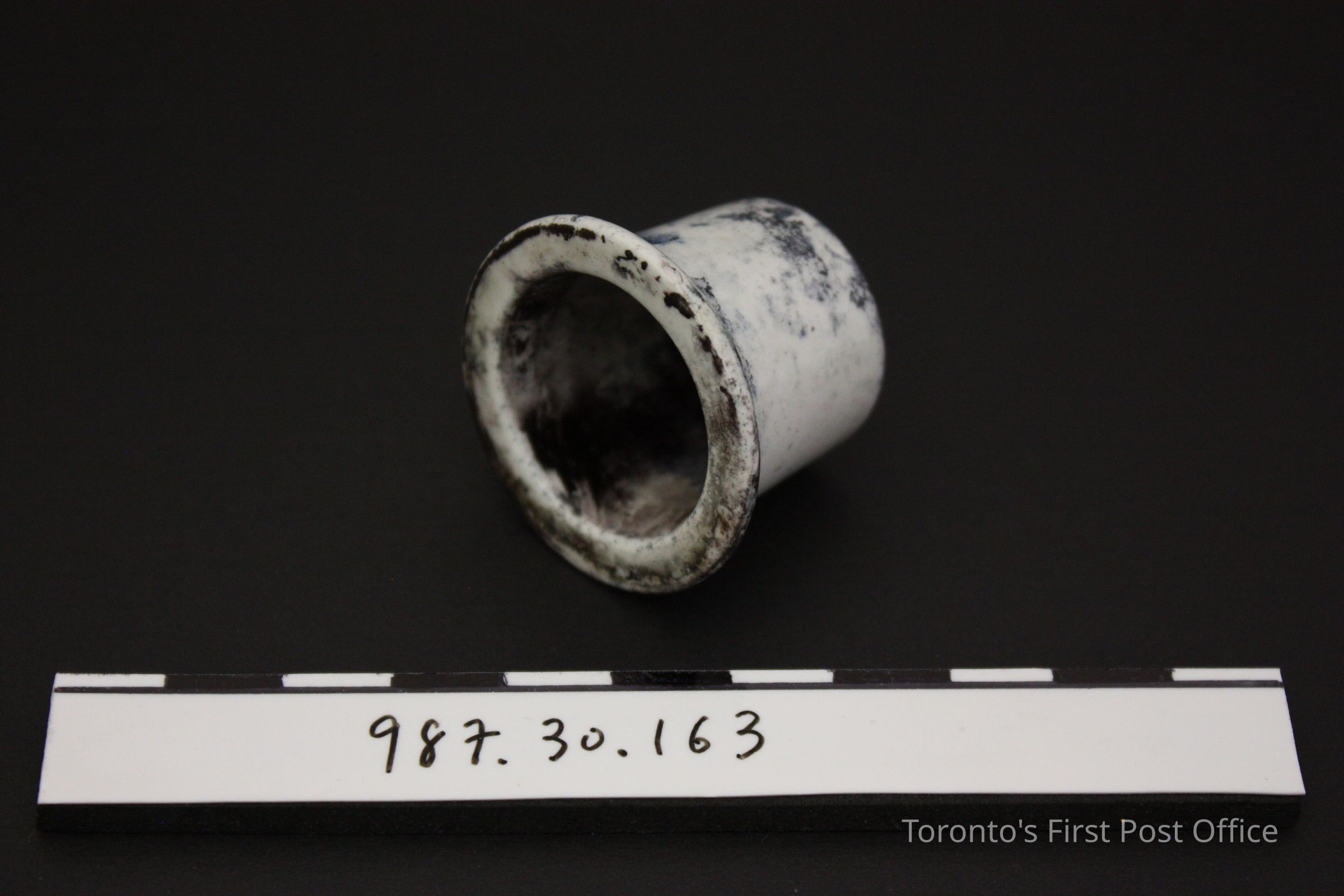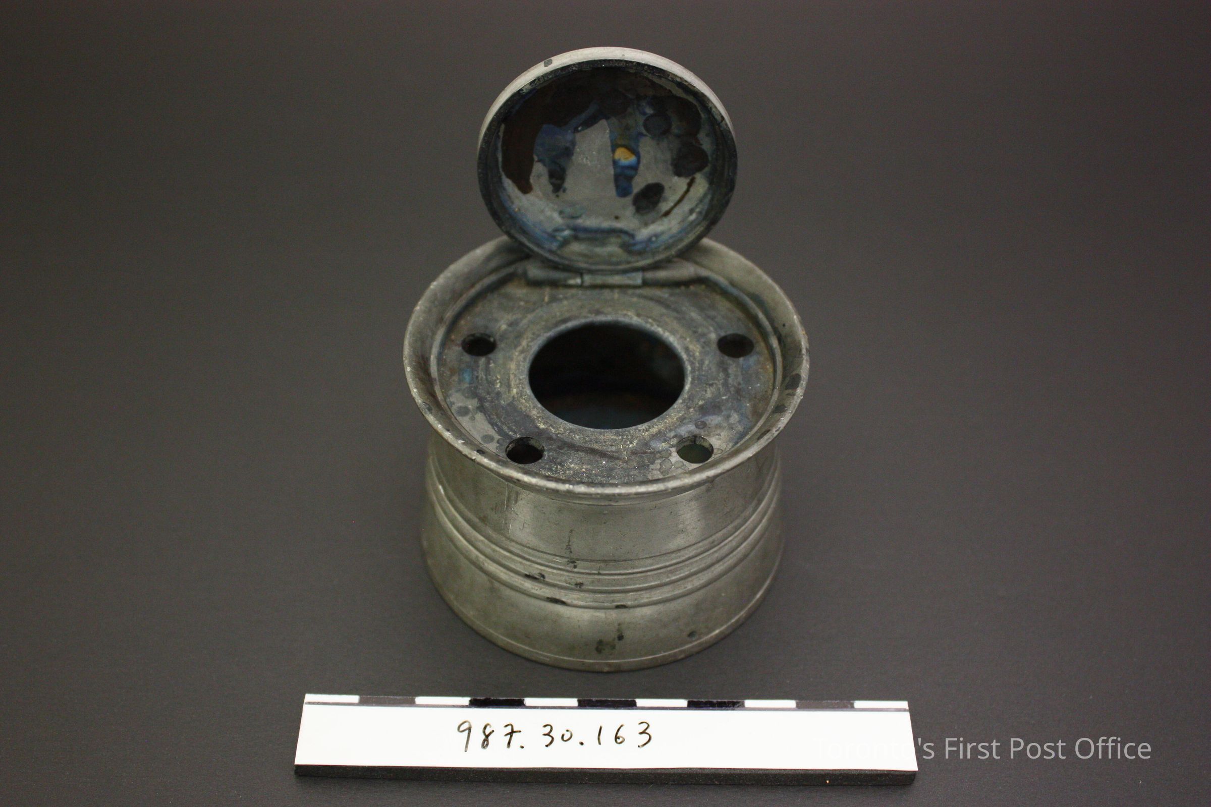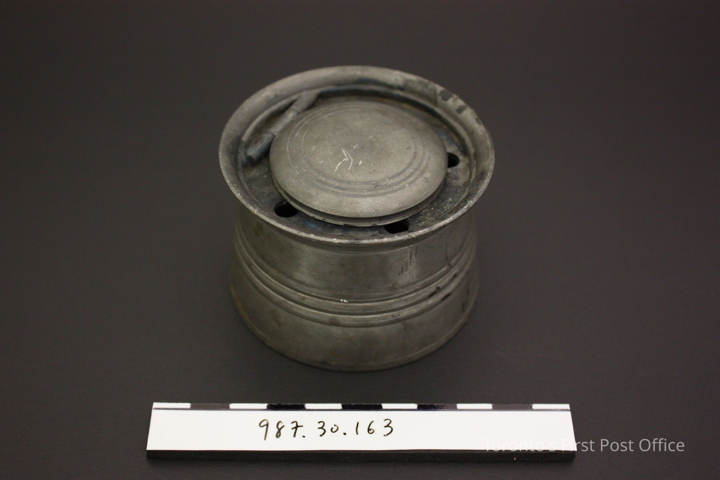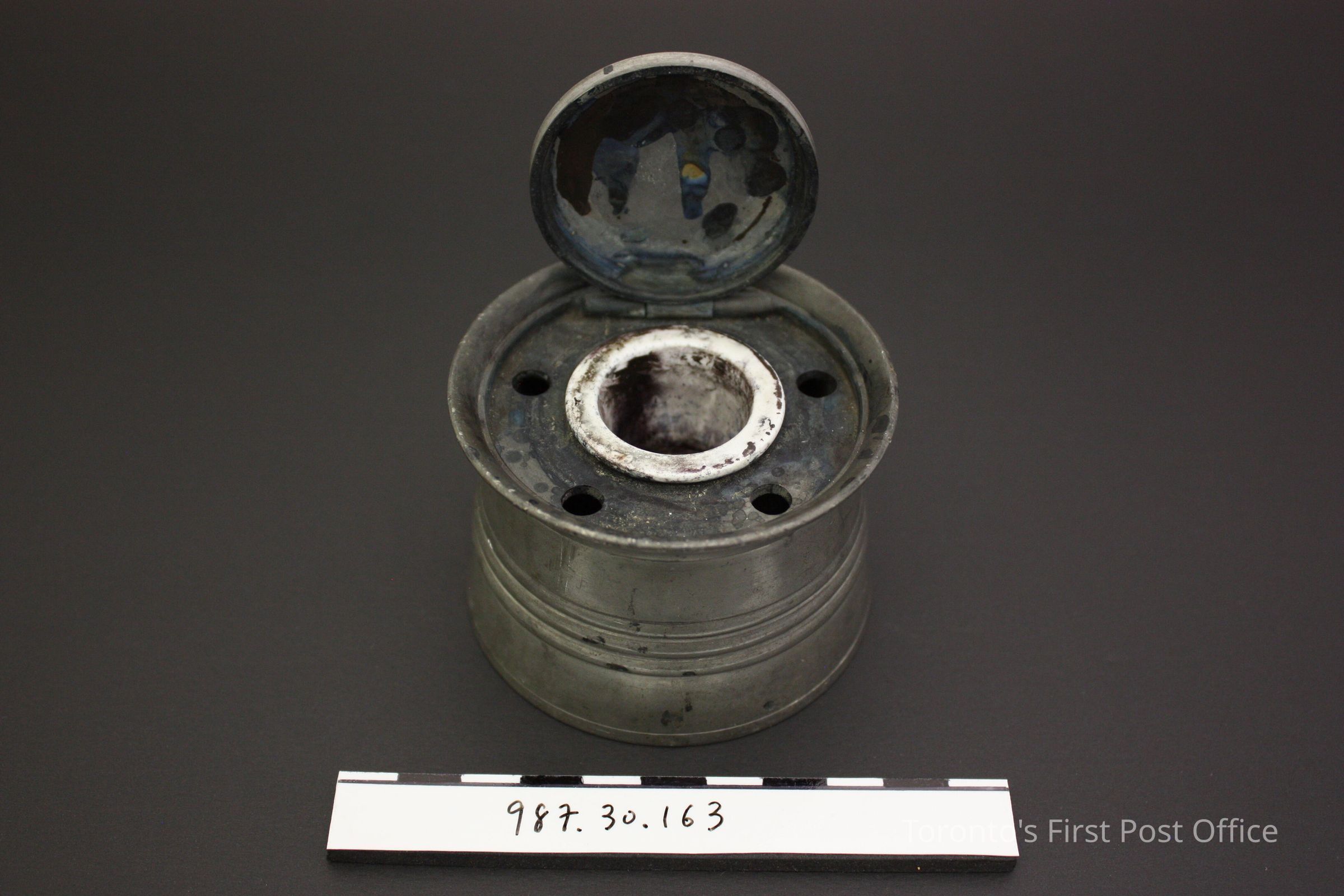Pewter inkwell with lid; four holes for quills; design of three horizontal raised circles around body; lid has three incised ring pattern; insert is white porcelain, sits inside inkwell.Dimensions