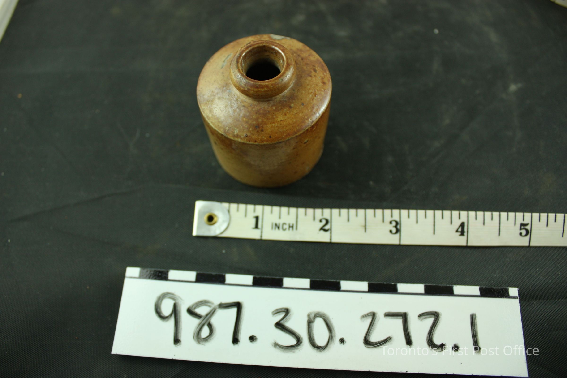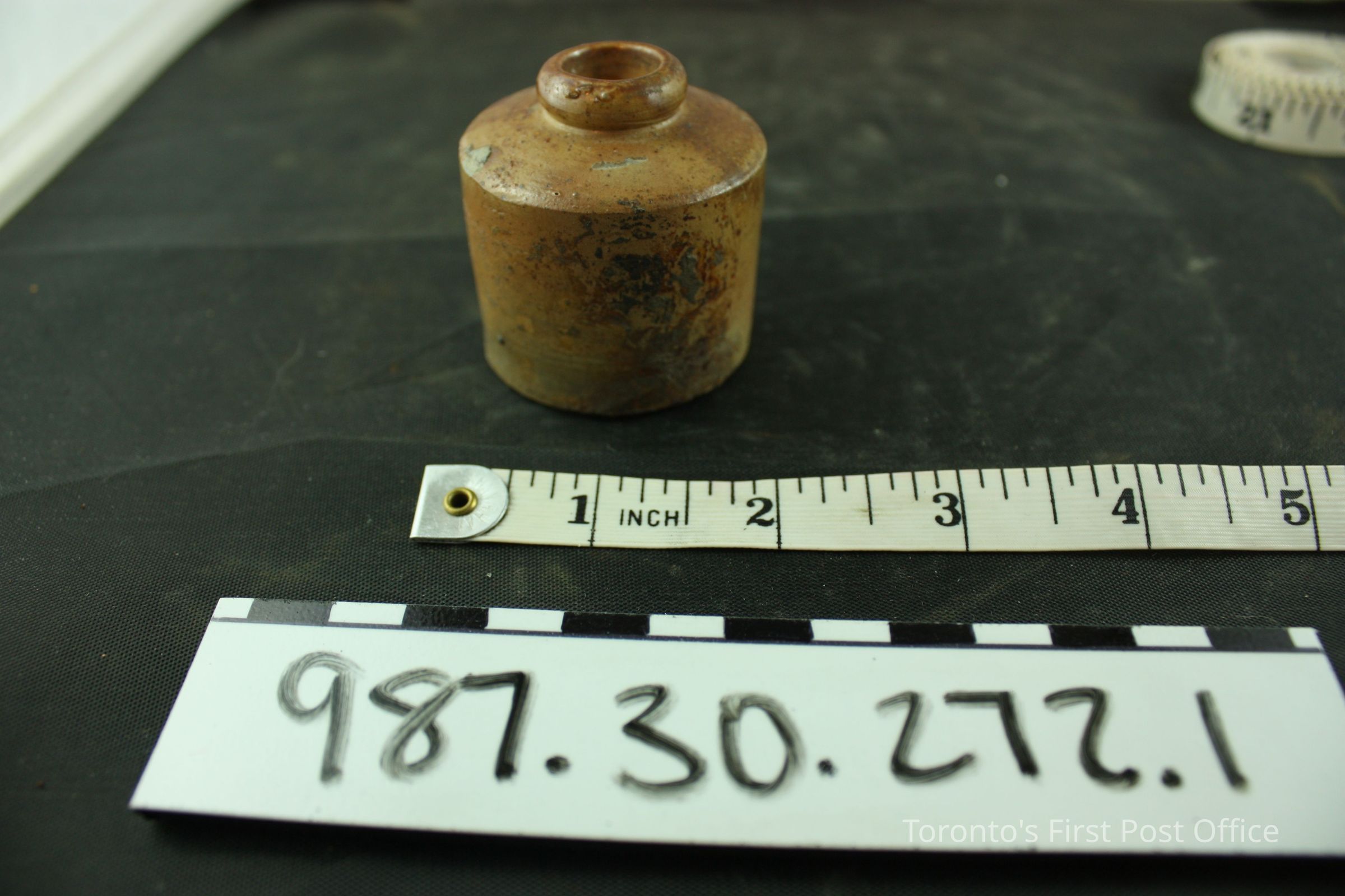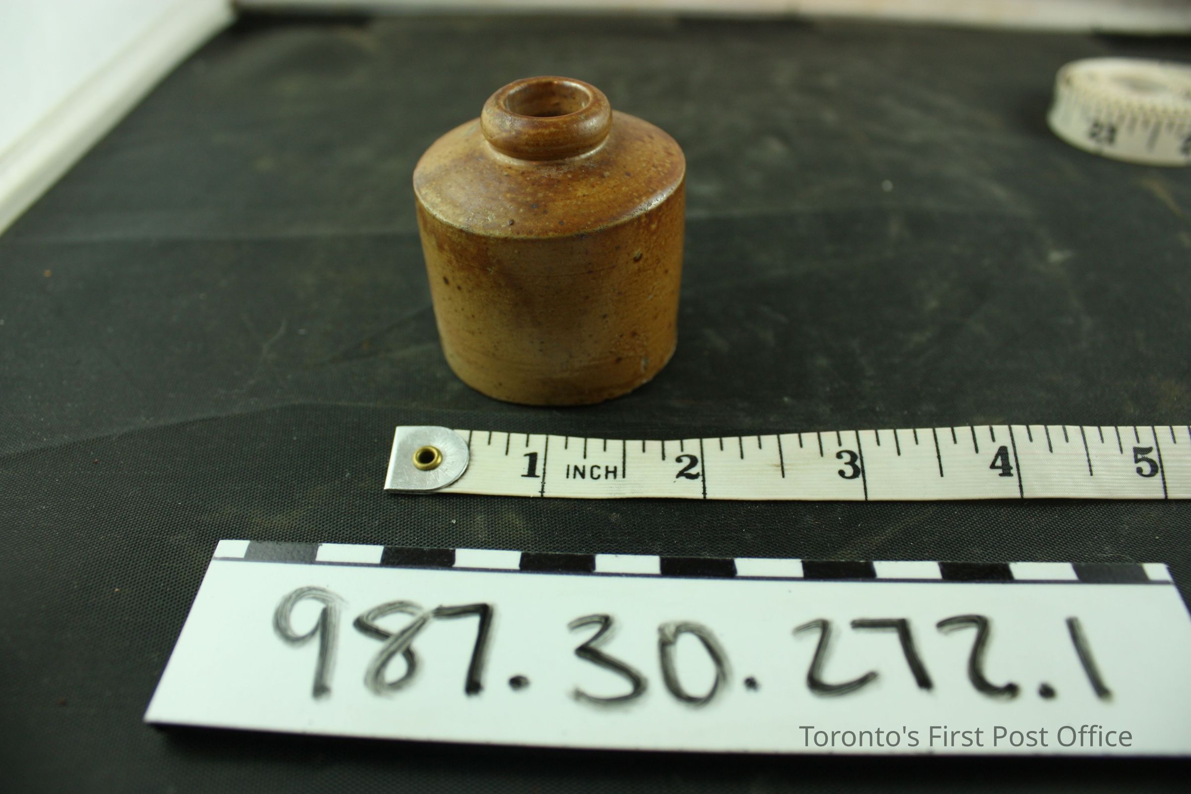 Inkwell with brown glaze; pottery; circa 1830.