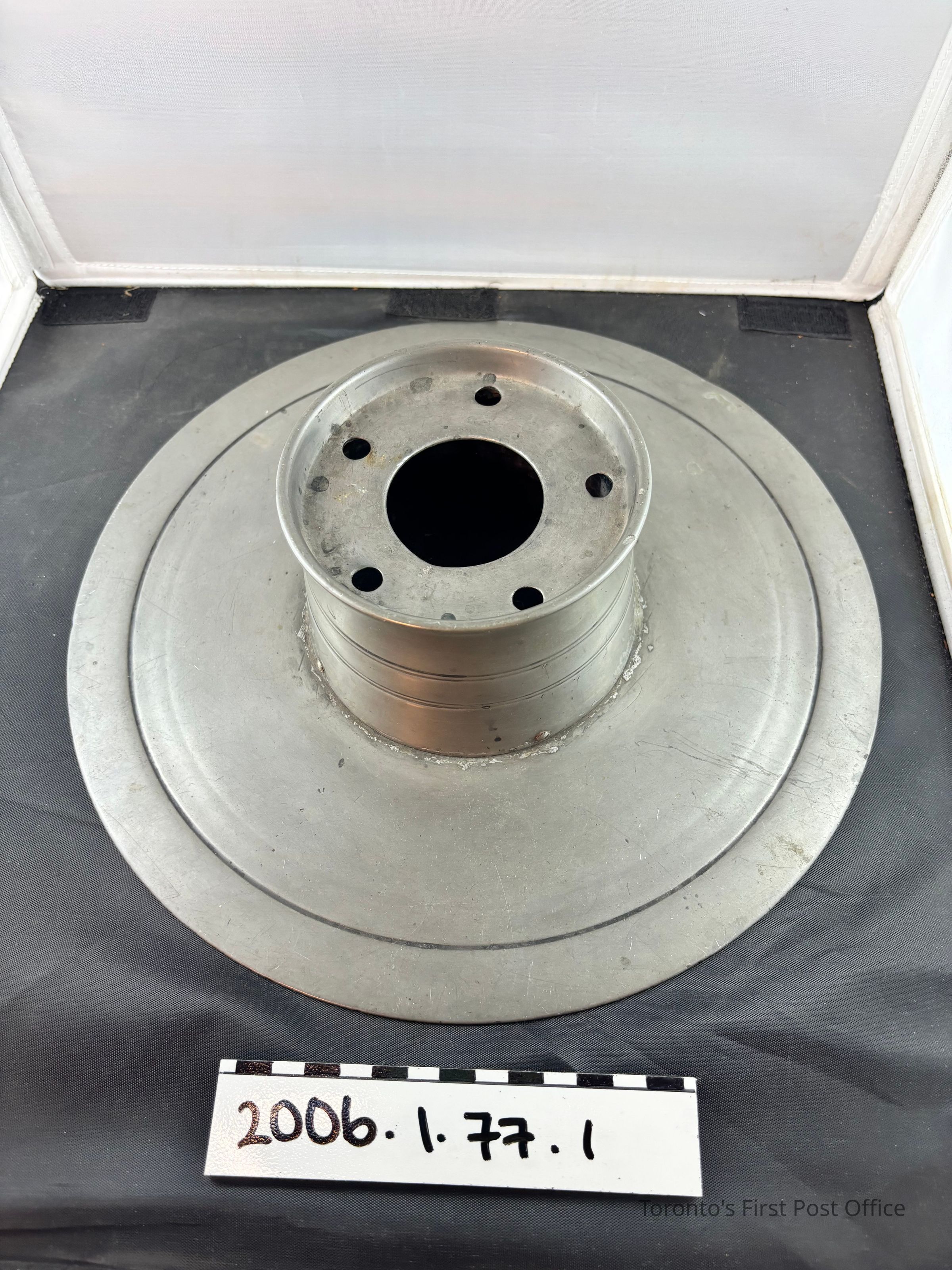 Pewter inkwell with wide flat skirt around central inkwell; five quill holes in inkwell; design is one plain line approx. 3 cm from outer circumference in skirt and two double lines around inkwell; plain glass insert sits on wooden base in well; circa 1830-1860.Dimensions