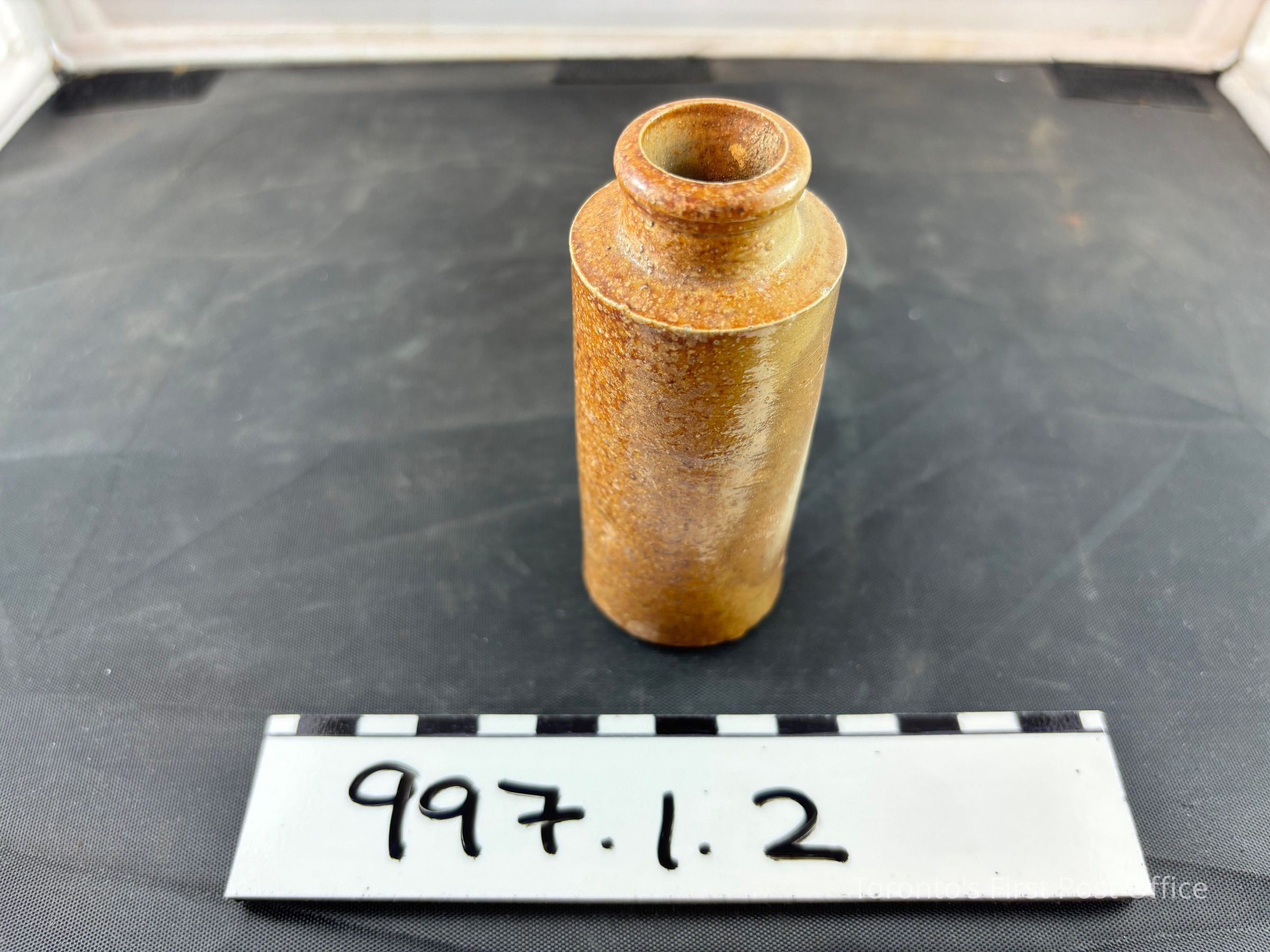 Inkwell; earthenware brownstone; golden brown glaze; tall and narrow shape.Dimensions