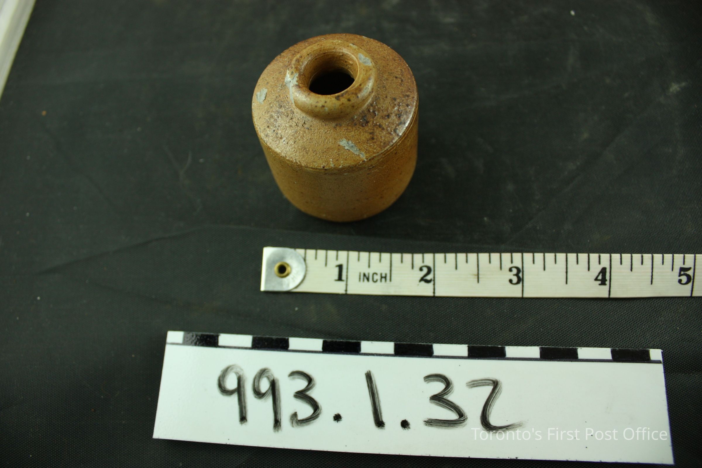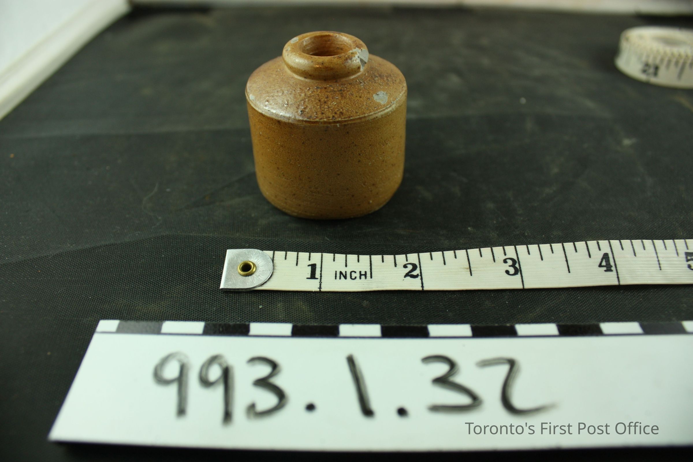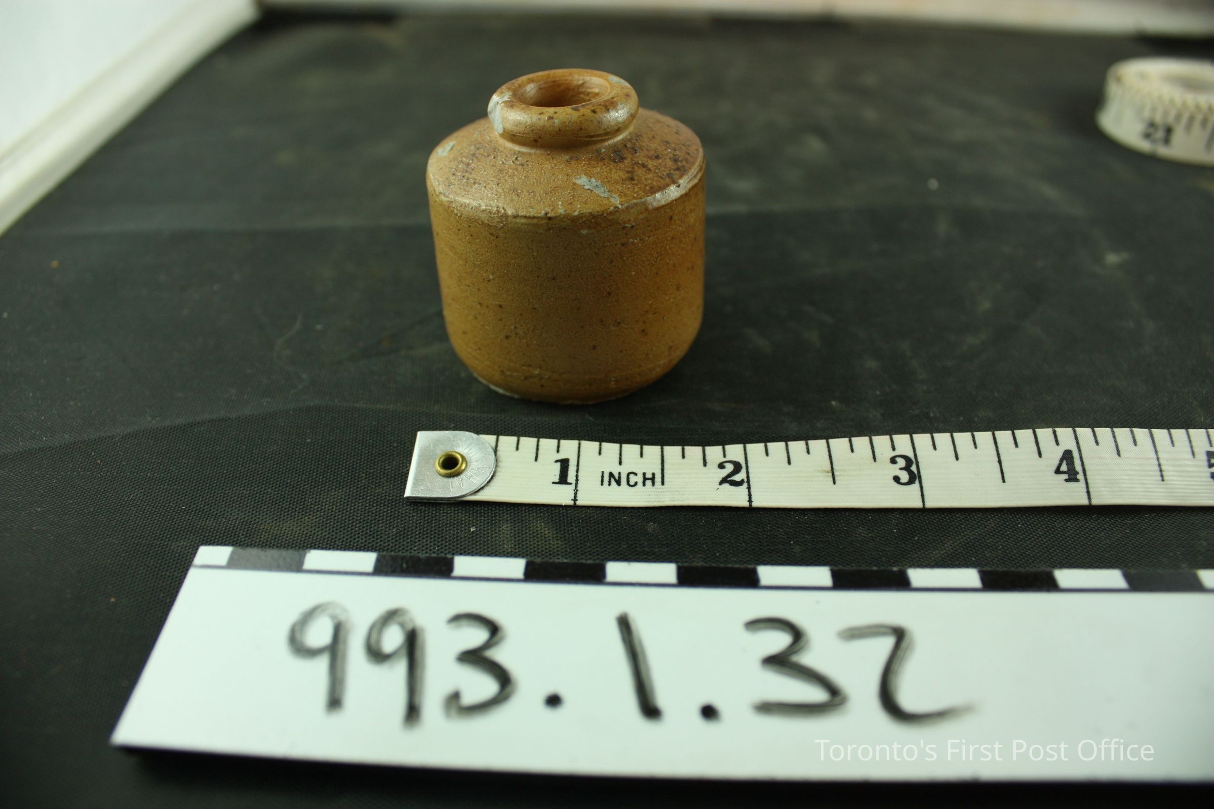 Inkwell; pottery; light brown glaze; circa 1830s.