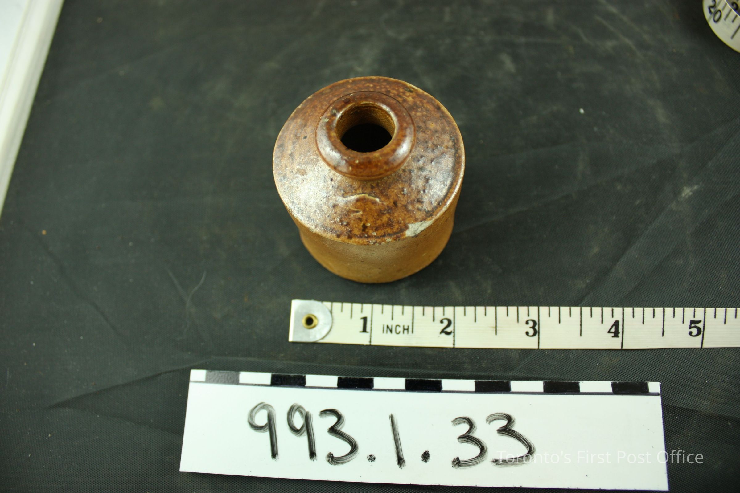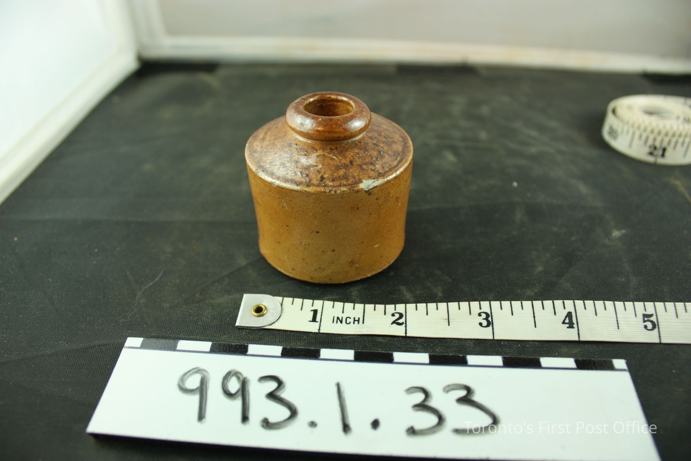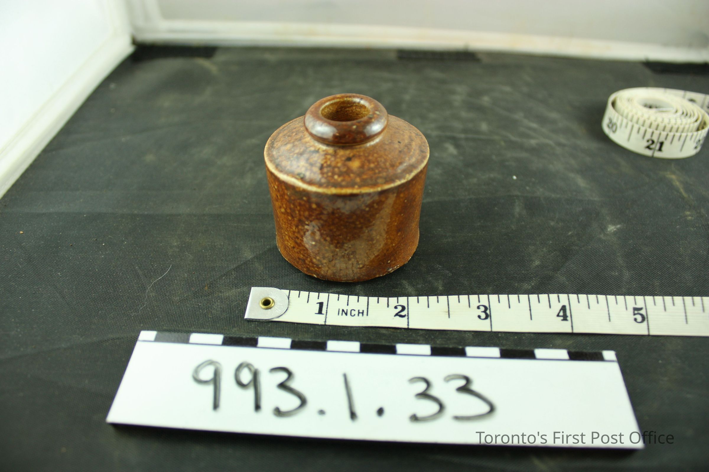 Inkwell; pottery; stoneware; light brown glaze; circa 1830s.