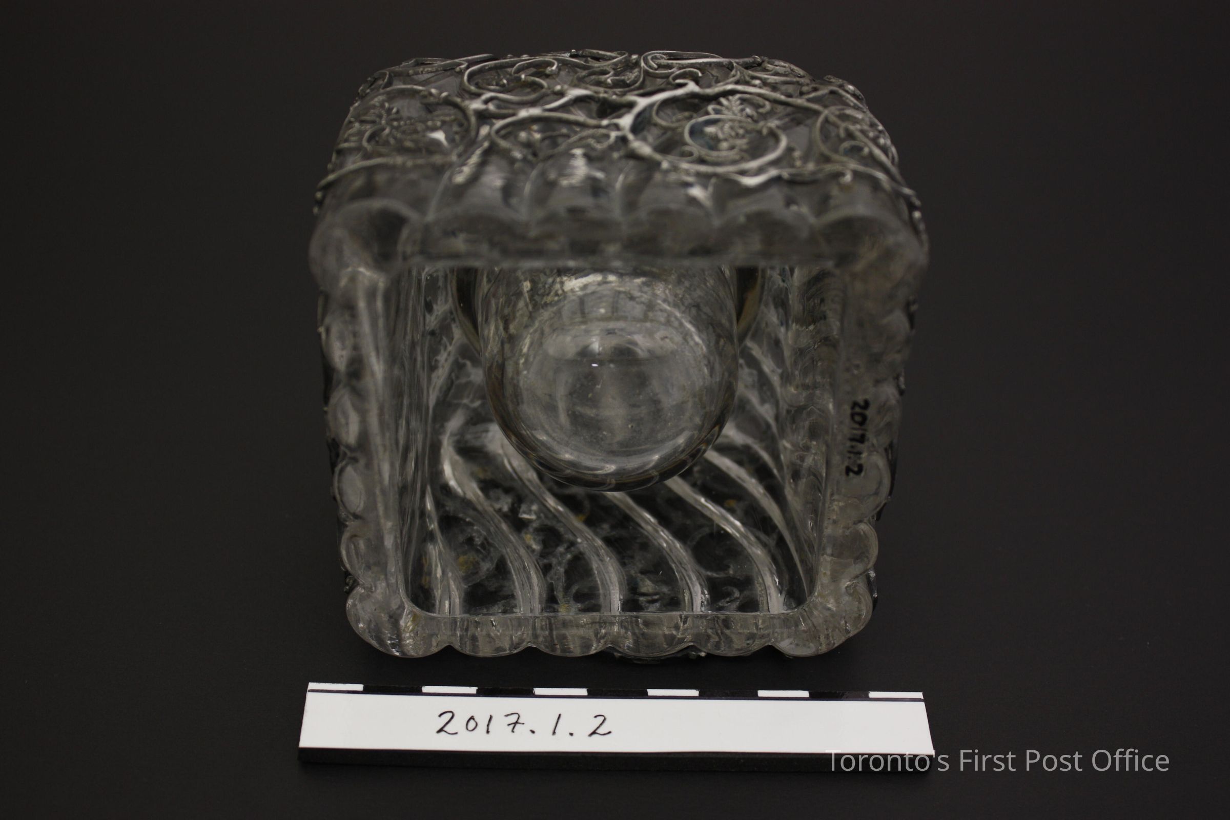 Glass square inkwell. Covered with fine metal scrollwork, with floral/leaf design. Missing the top cap.Dimensions