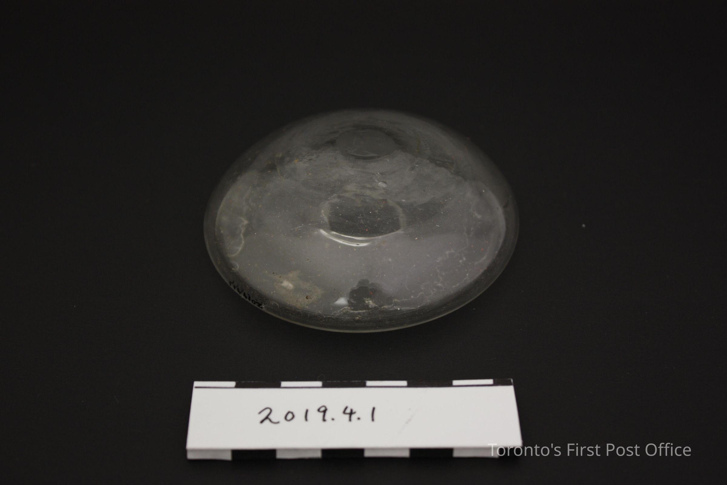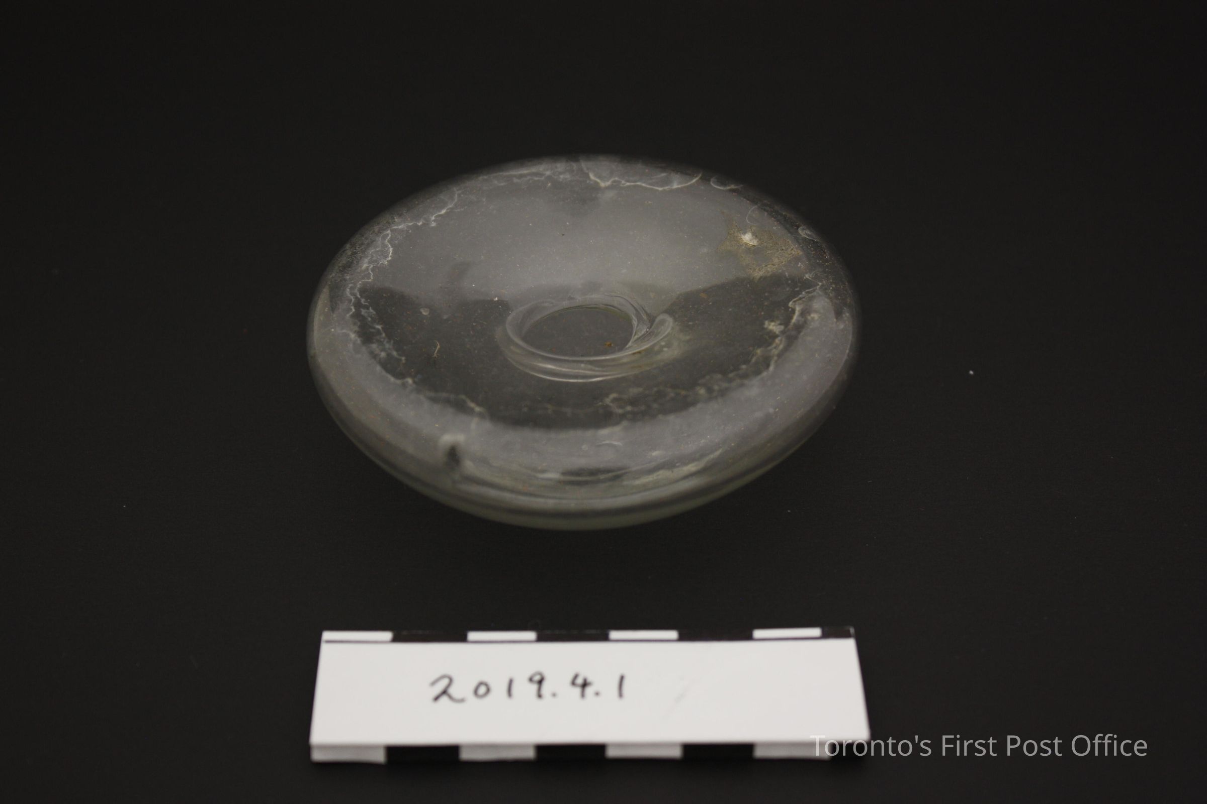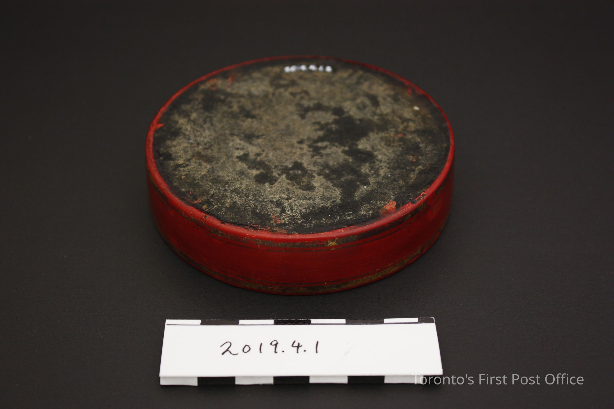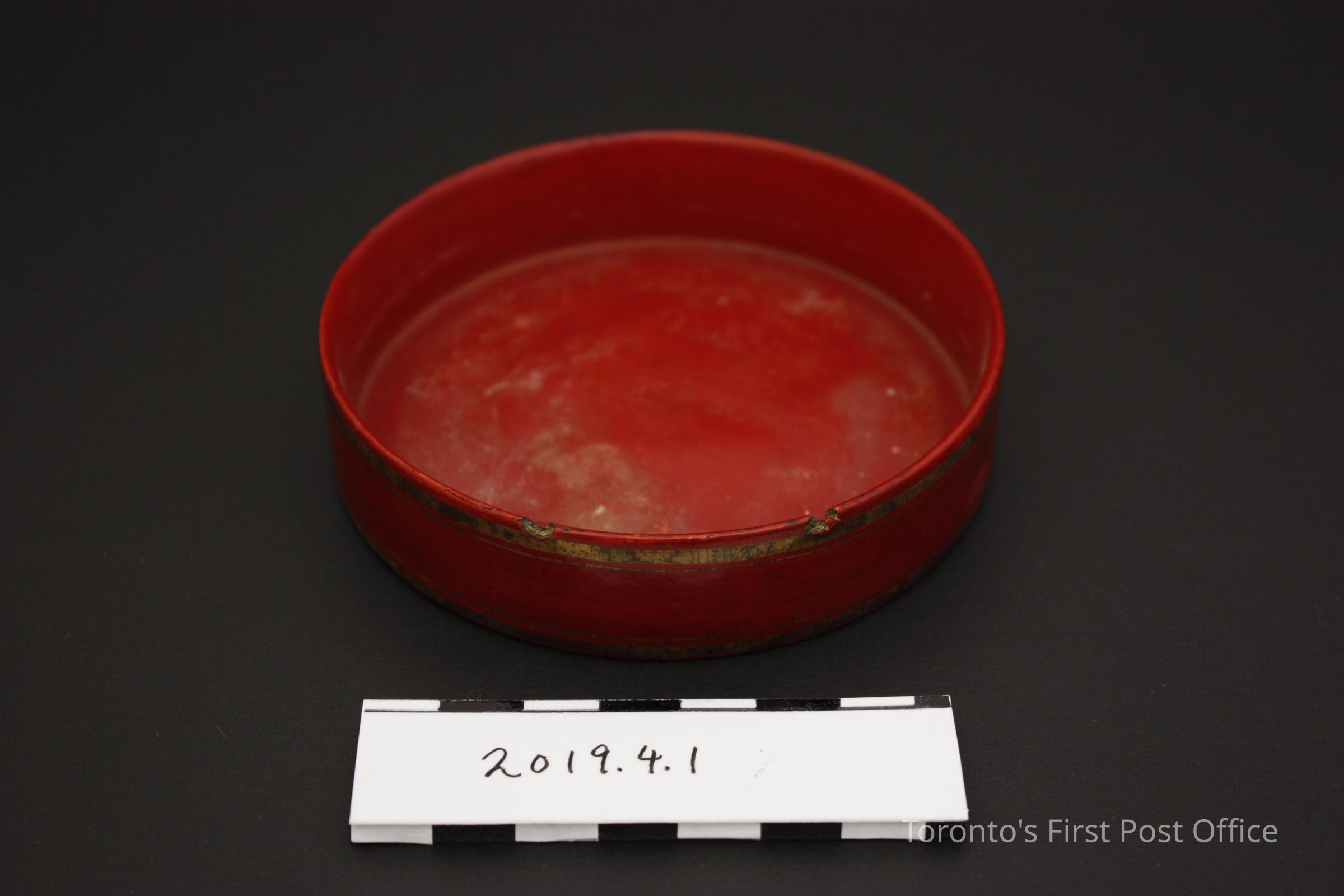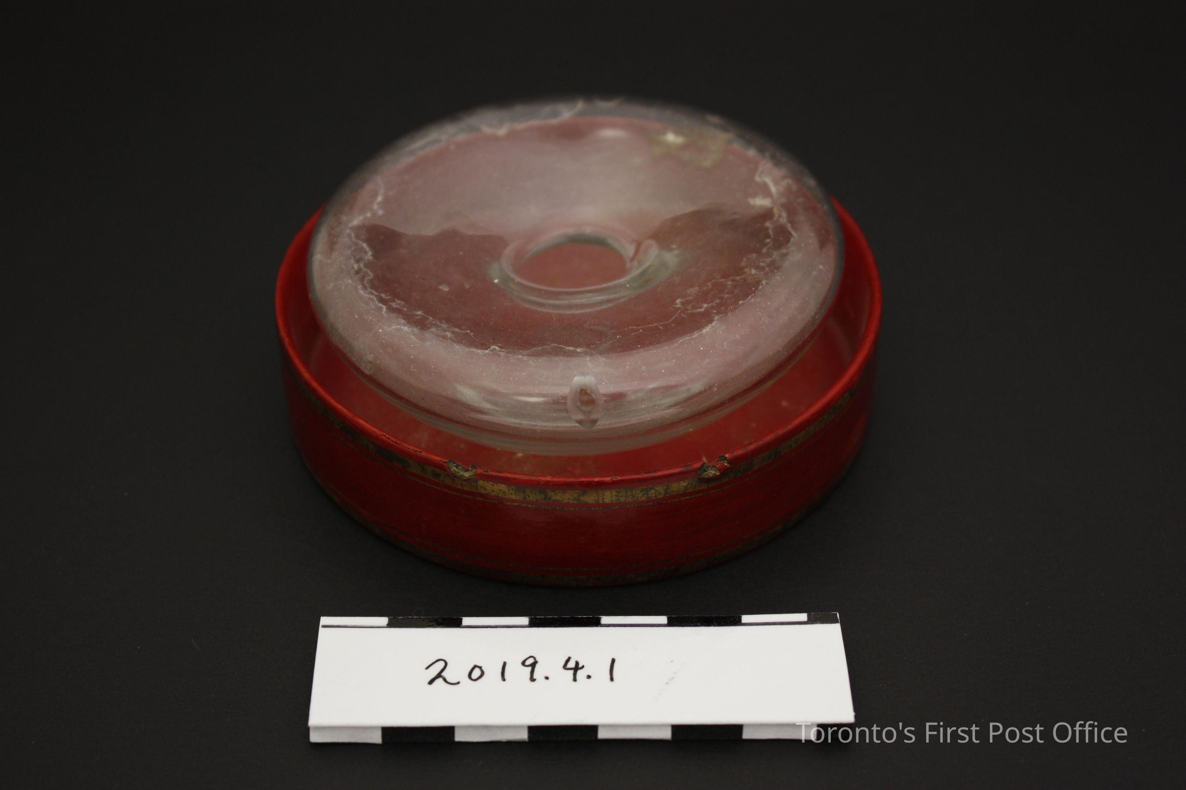 Handblown glass inkwell with lacquered (red, gold) paper mache tray. Inkwell has an "overflowing" opening on the side, with few visible bubbles in glass. Possibly part of larger set (see object research).Dimensions