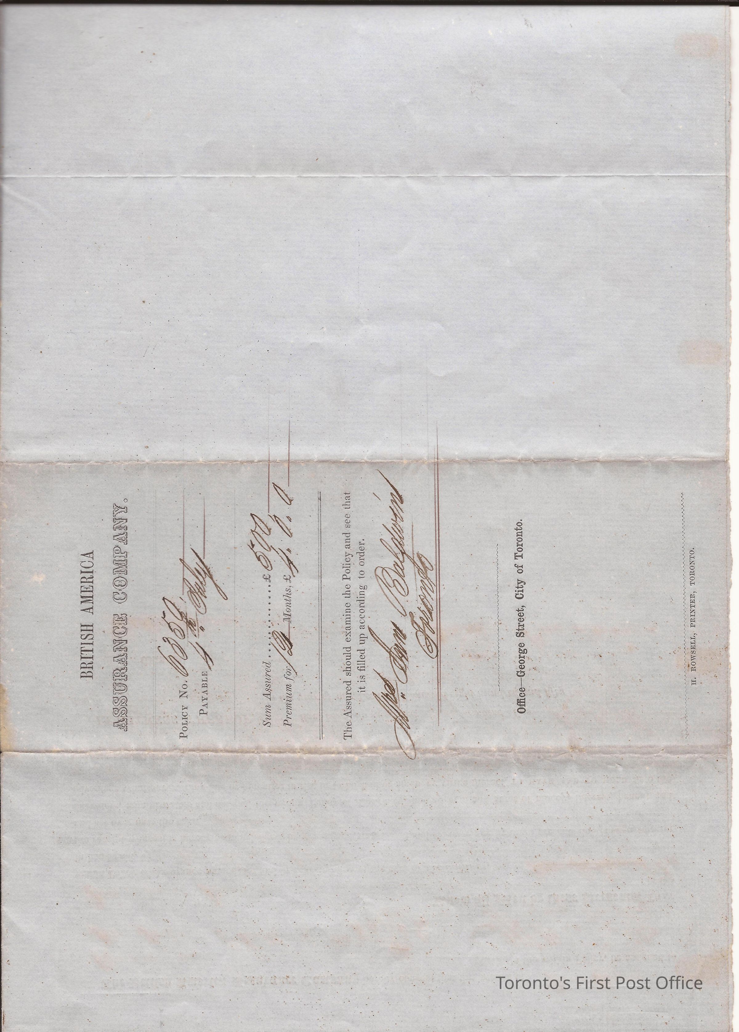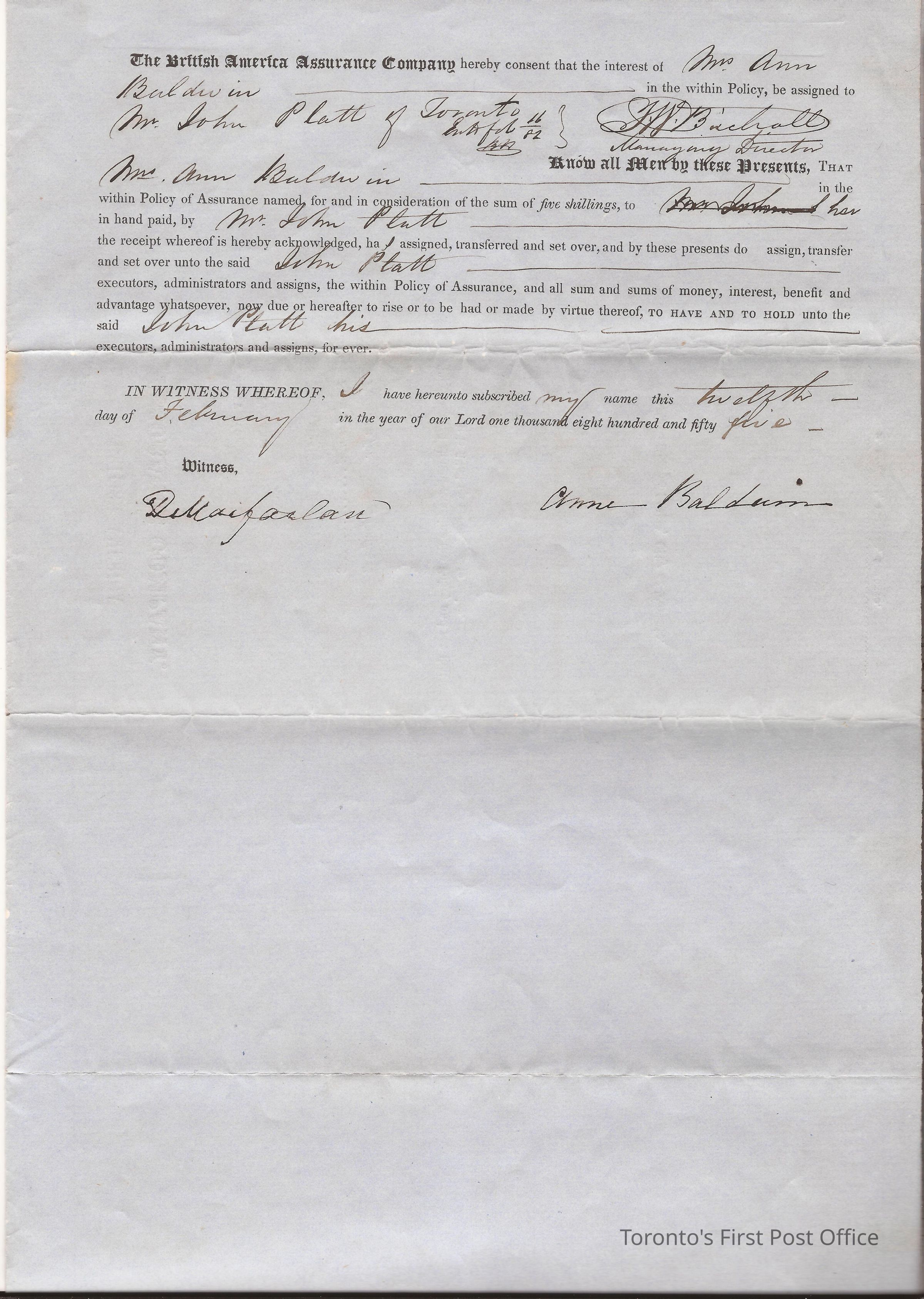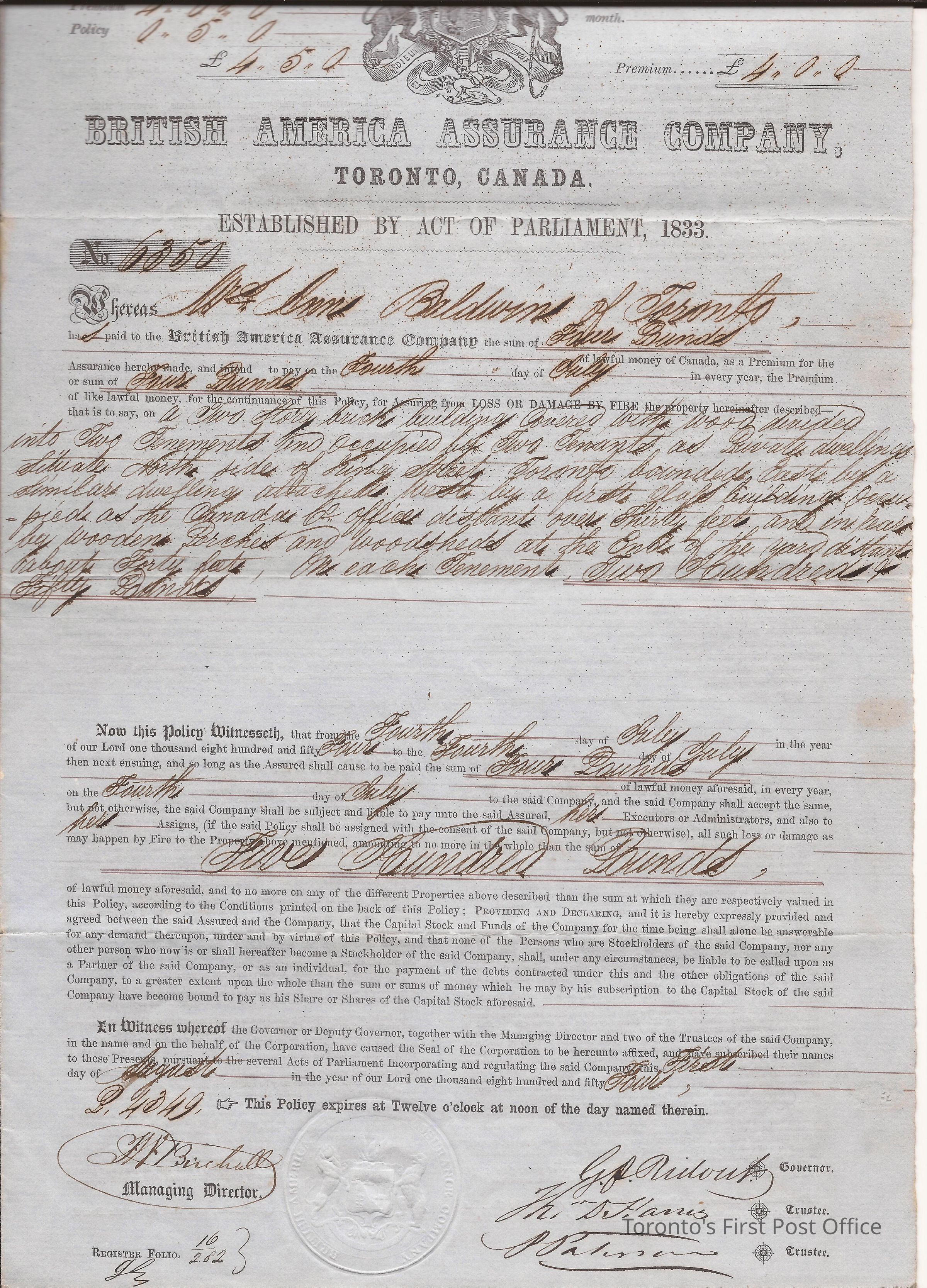 Fire insurance policy for Mrs. Ann Baldwin for $500 under the British America Assurance Company; signed by J.W. Birchall, G.F. Ridout, Th.D. Harris, D. McFarlan, Ann Baldwin; circa 4 July 1854.Update Date