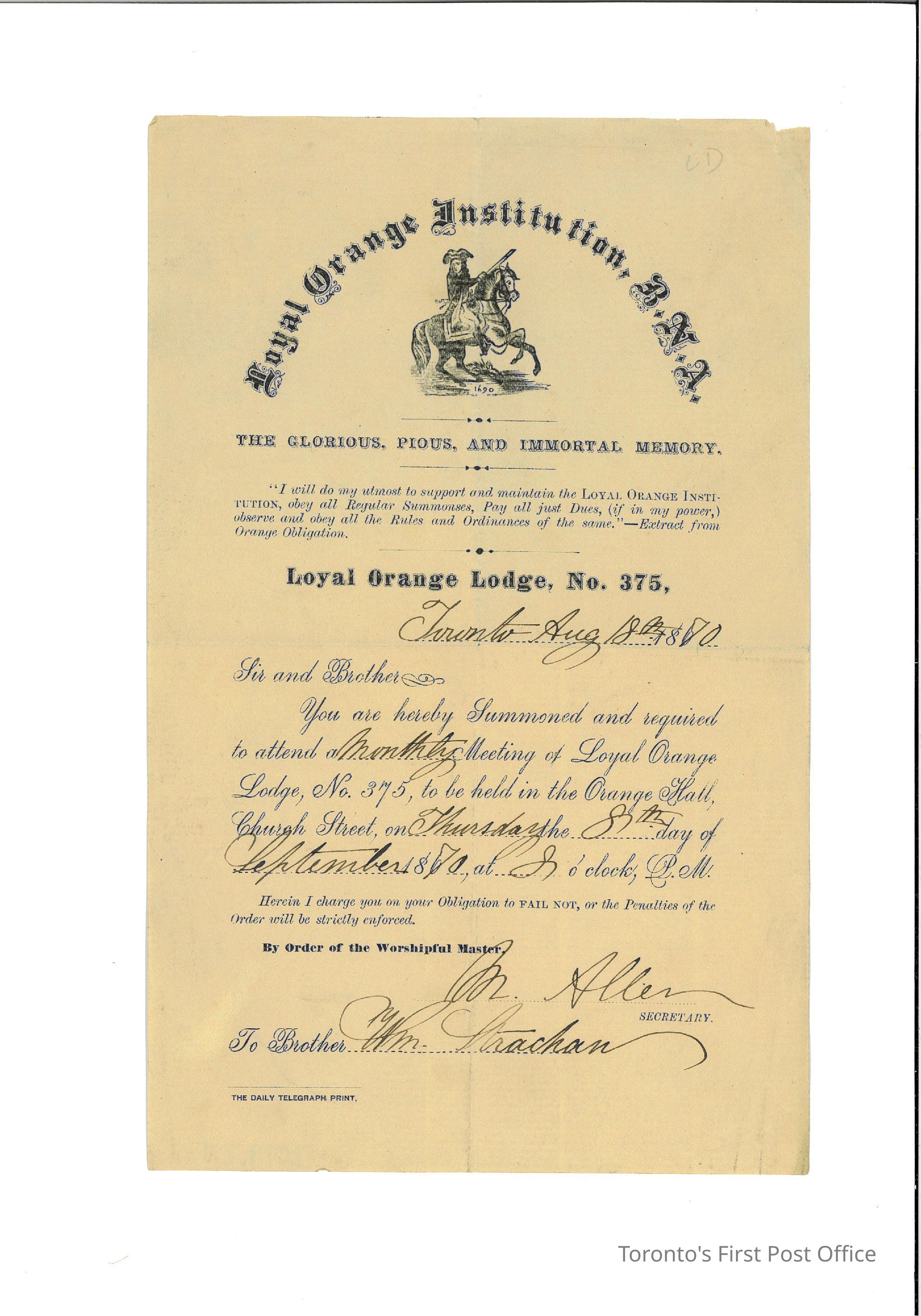 Invitation letter from Royal Orange Institution to Mr. Strachan, a member of the Loyal Orange Lodge No. 375. Written by Secretary M. Allen in Toronto on August 18th, 1870. The letter asks Mr. Strachan to attend a monthly meeting at Orange Hall, Church Street on Thursday September 8th, 1870 at 8:00. At the top of the invitation has title "Loyal Orange Institution, B.N.A." and under it has a print of a man on a horse and 1690 date. At the upper right corner, "LD" is written in pencil. At the bottom left corner, states "The Daily Telegraph Print", possbily can be the printing company of the invitation. A note came with the invitation, with the readable part saying "1870 M. Allen composition 19 James".Dimensions
