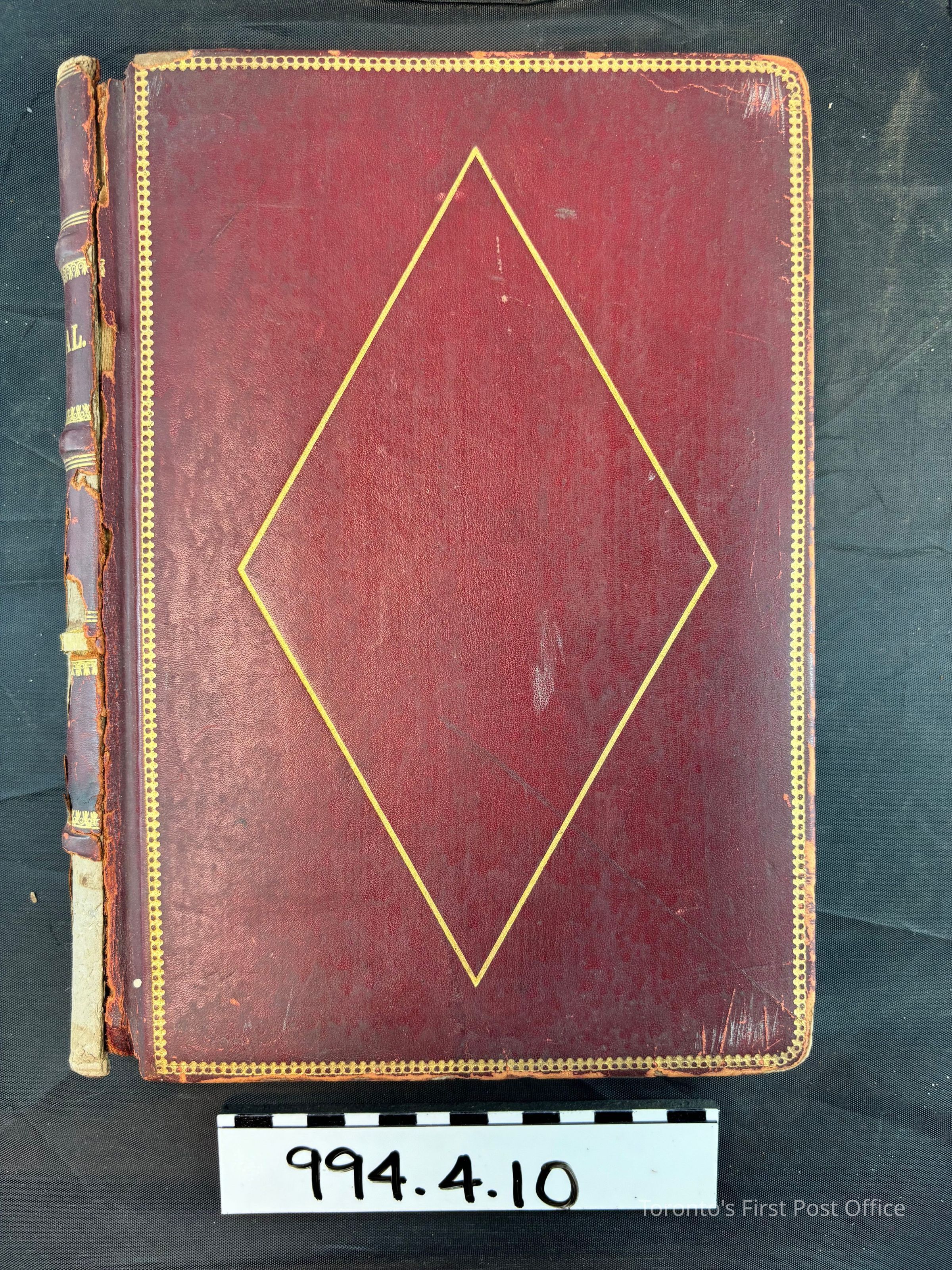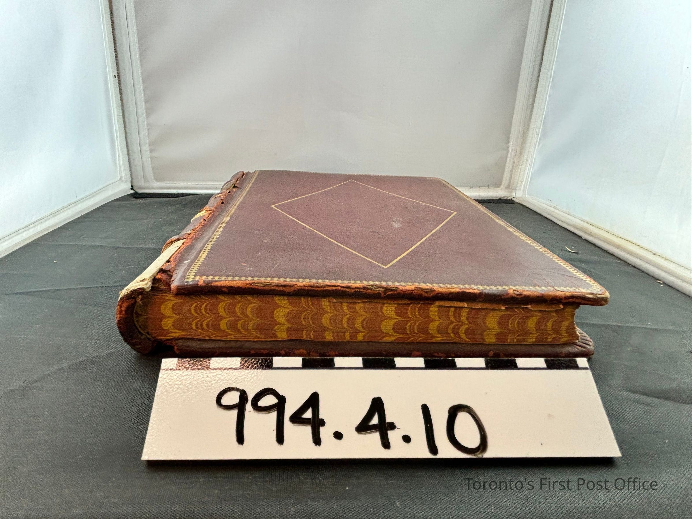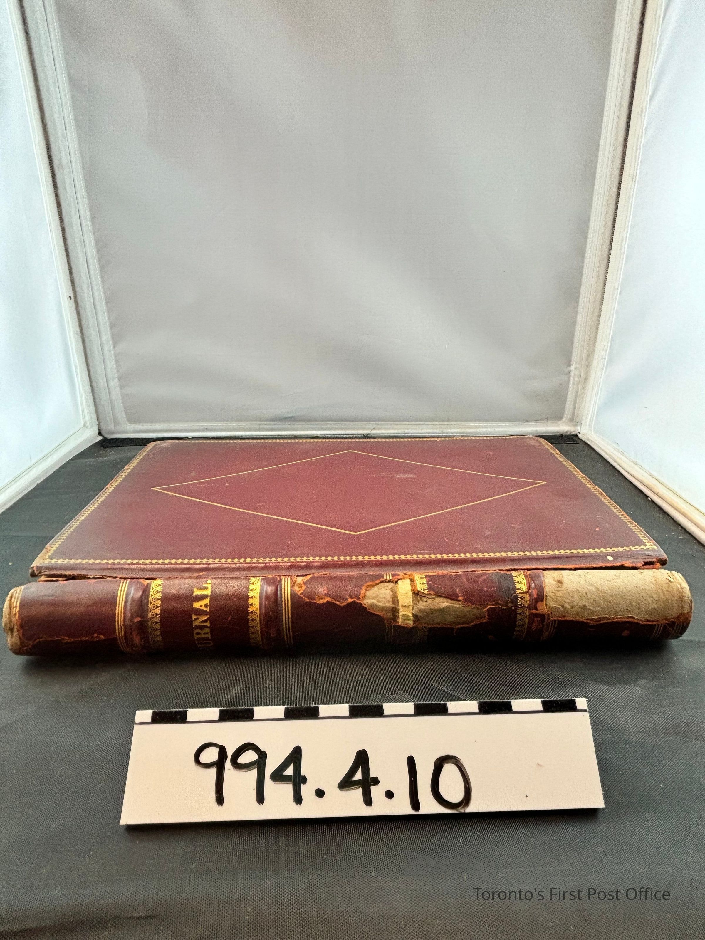 Journal; burgundy leather cover decorated with gold diamond; on spine: "JOURNAL"; lined in red and blue; pages numbered in blue ink 21-289; marbled inside covers in brown, gray, black, and white.Dimensions