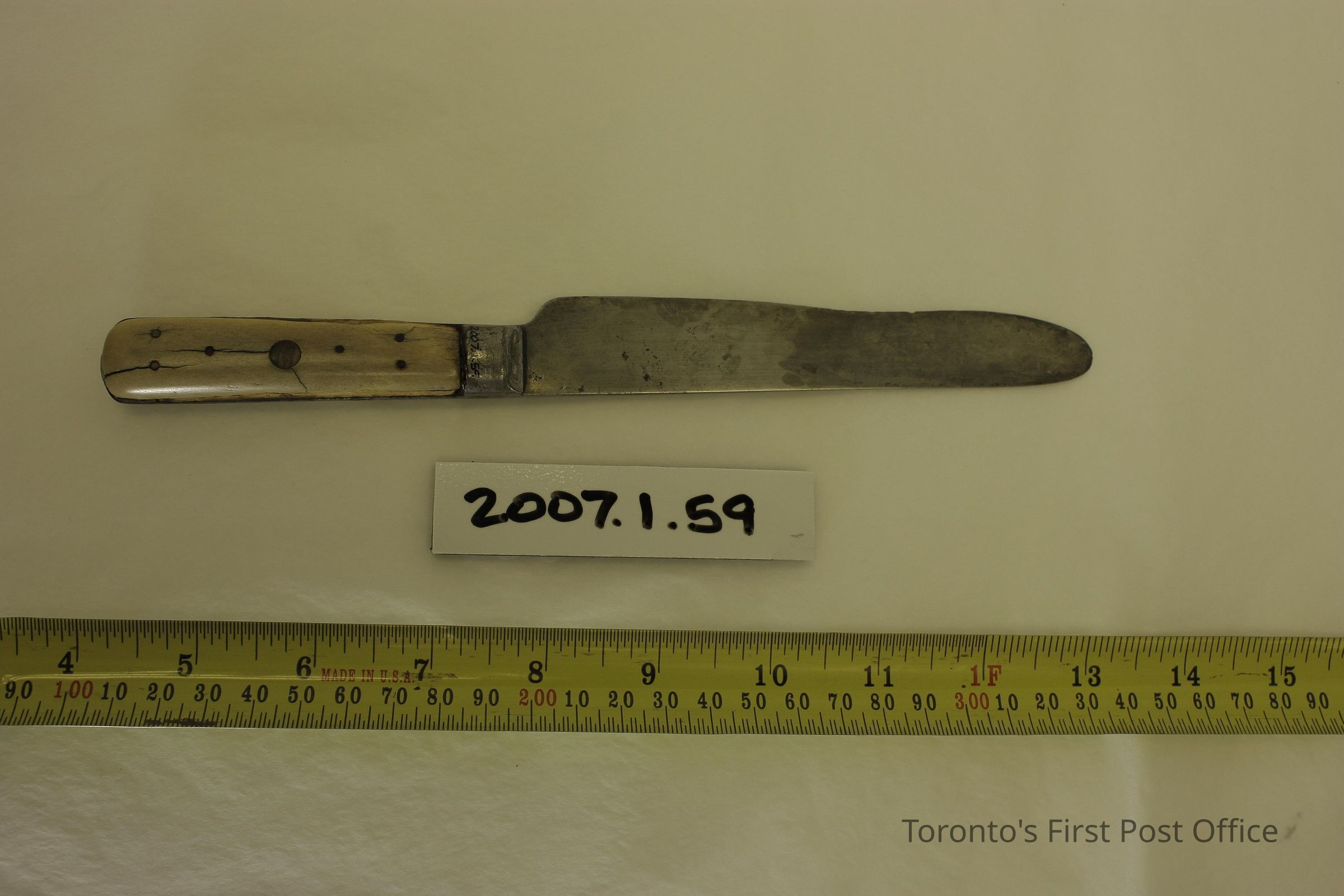 One dinner knife with steel blade with rounded tip; bone handle with six pins on each side; one large bone or wooden pin in one side of handle; possibly Ridout family possession; dug up from South wall (front) of Bank of Upper Canada Building by Sheldon Godfrey Sept. 1981.Update Date