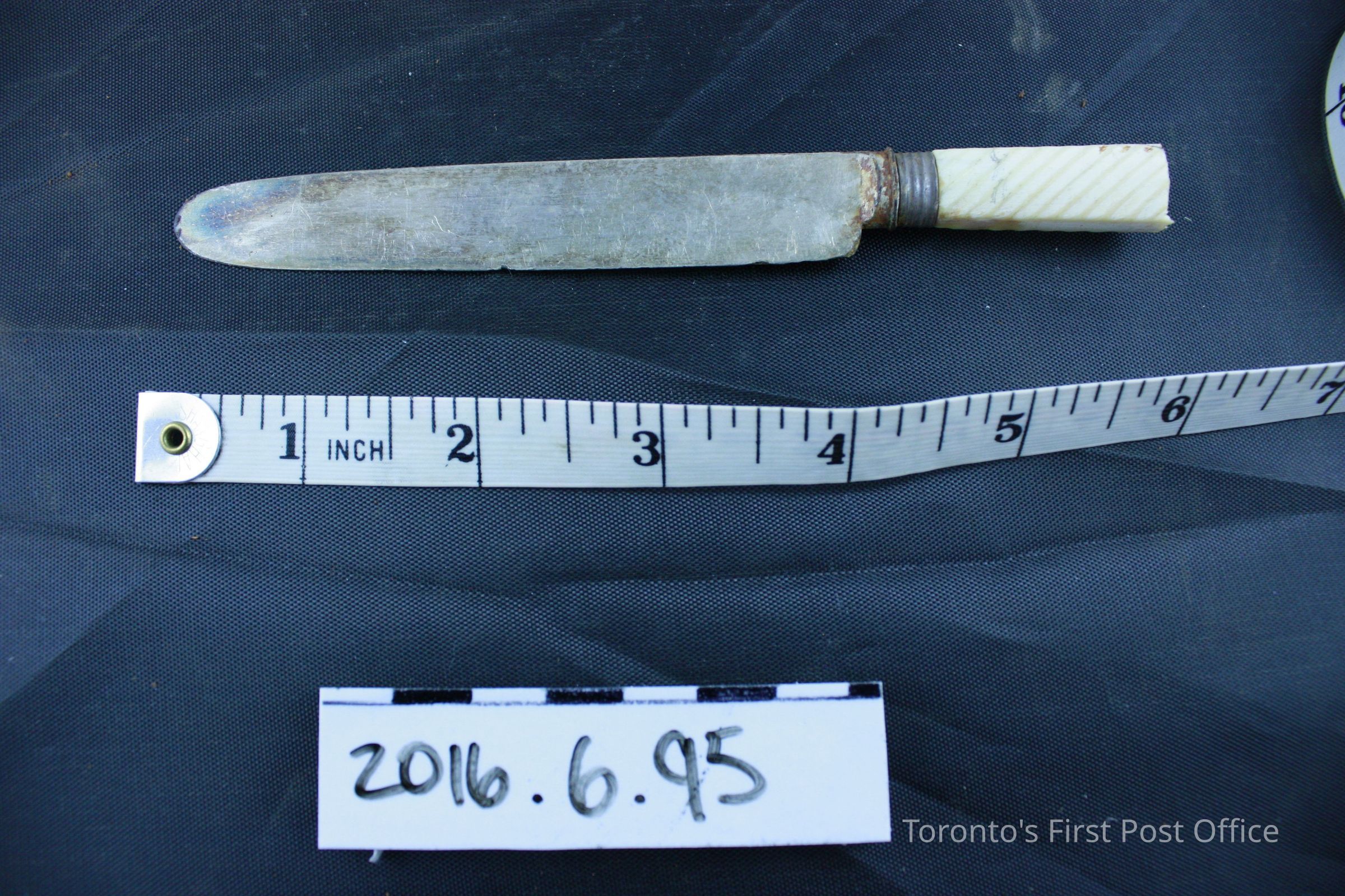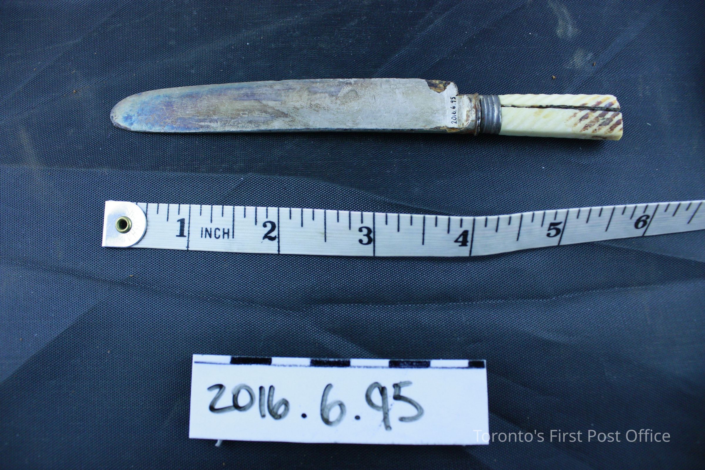 Nickel silver dinner knife, missing part of ivory handle. The obverse of the blade is faintly stamped three (3) times 'MD' closer to the neck. Attached to the neck of the blade by a darker nickel band is a portion of the original ivory handle. Where the handle has been cut of broken off, a wooden rod which is then inlaid with a nickel (?) rod is in the center, that would have kept the handle in place. The handle is marked by diagonal ridges as ornamentation.Dimensions