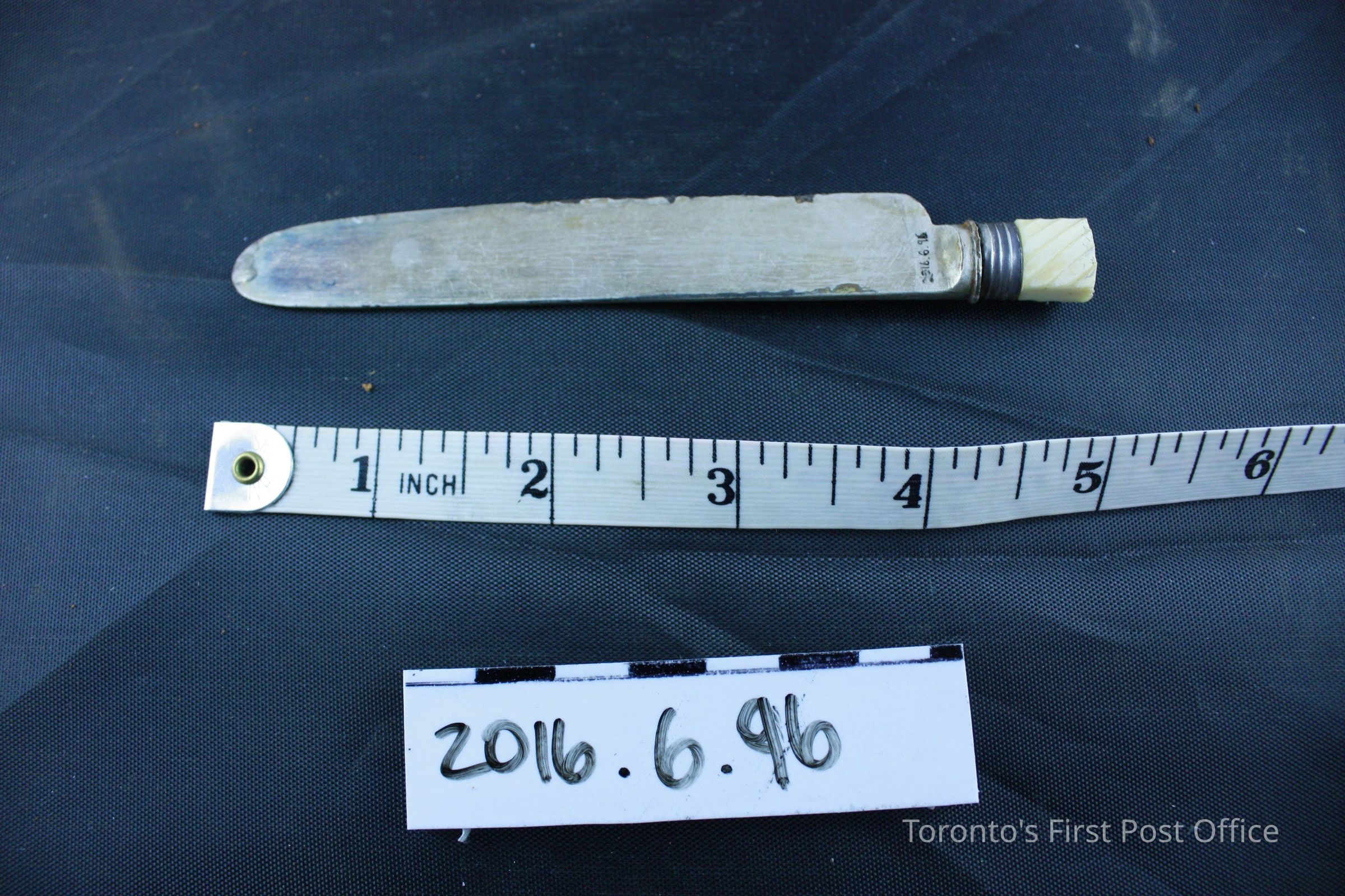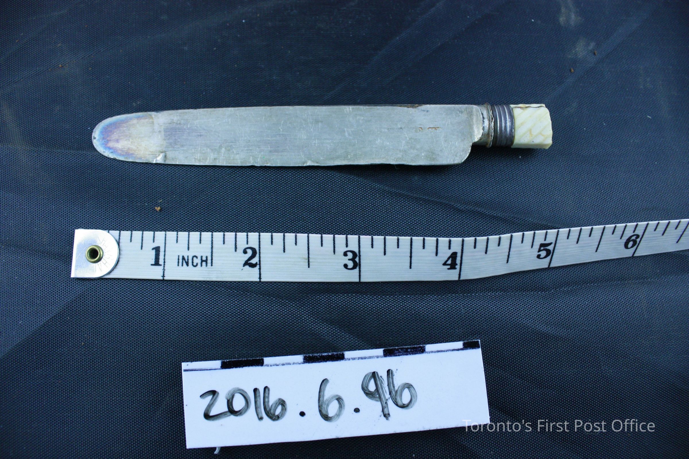 Nickel silver dinner knife, missing part of ivory handle. The obverse of the blade is faintly stamped three (3) times 'MD' closer to the neck. Attached to the neck of the blade by a darker nickel band is a portion of the original ivory handle. Where the handle has been cut of broken off, a wooden rod which is then inlaid with a nickel (?) rod is in the center, that would have kept the handle in place. The handle is marked by diagonal ridges as ornamentation.Dimensions