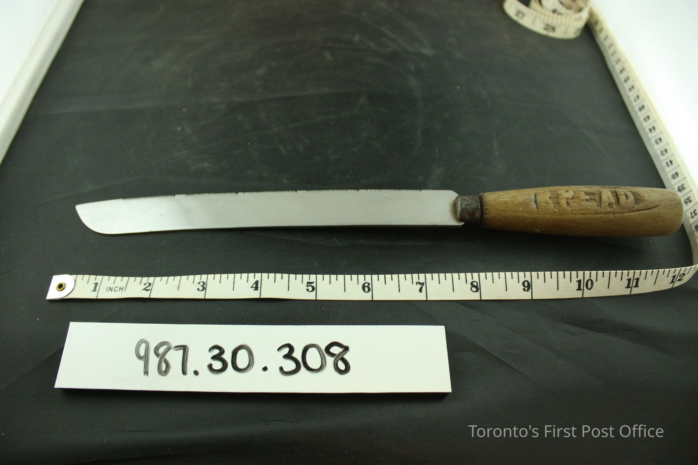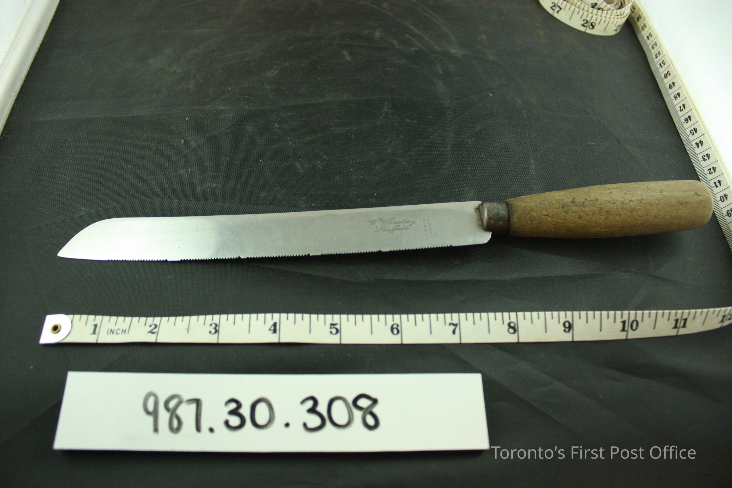 Bread knife; serrated cutting edge imprinted with "Wheatley Sheffield FIRTH'S STAINLESS"; wooden handle with carved "BREAD".Dimensions