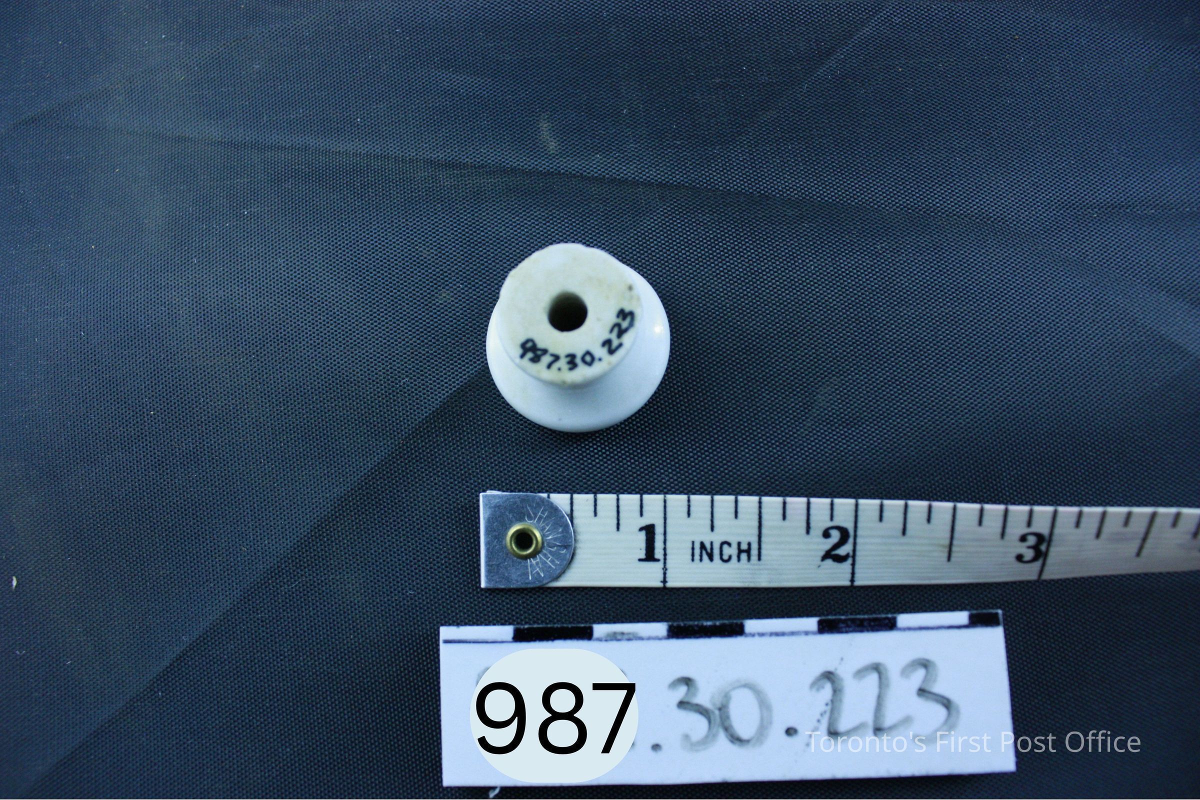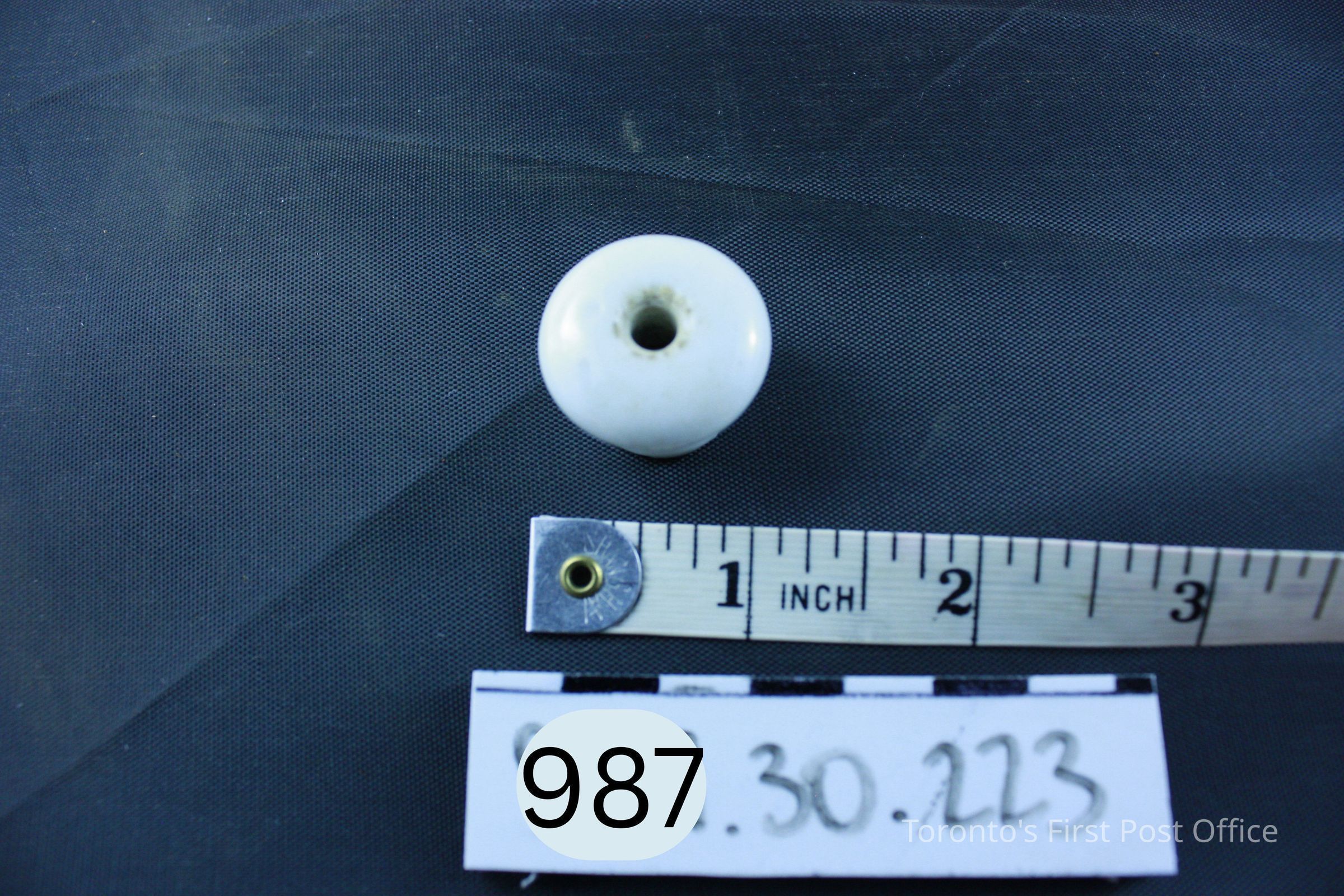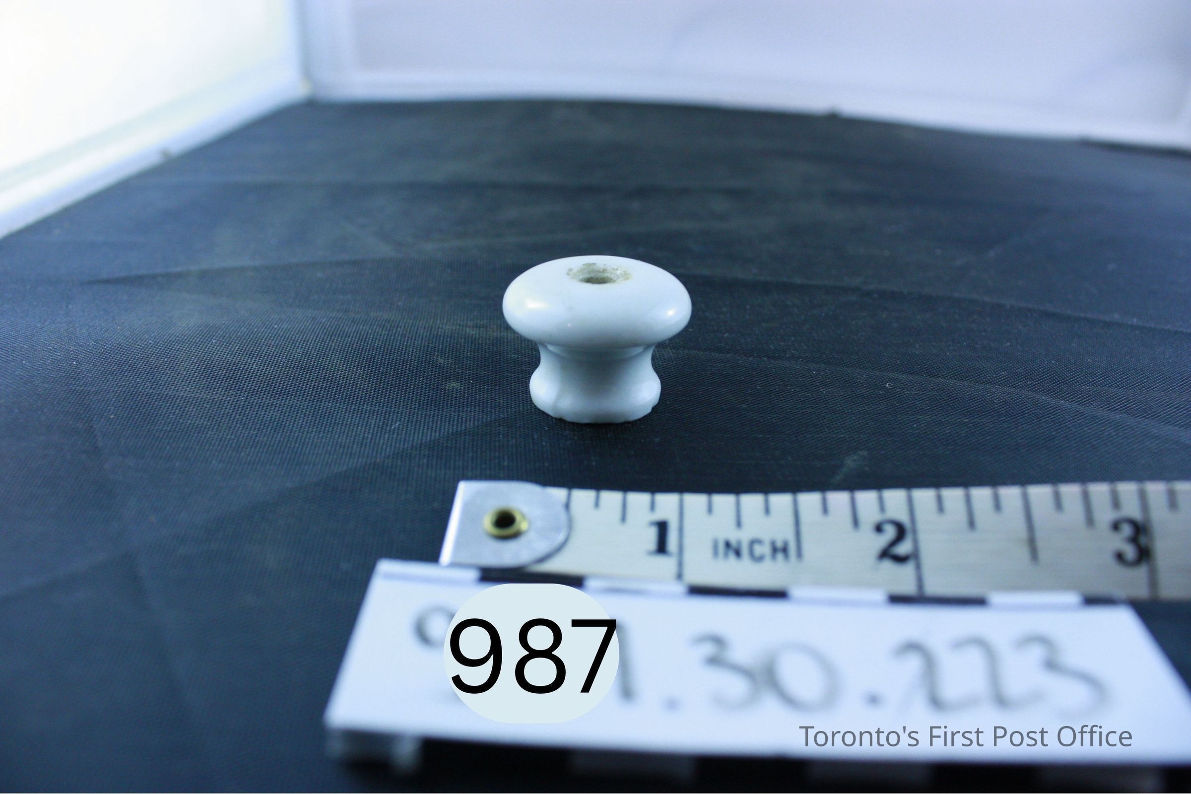 Knob; white porcelain; hole in centre with screw; circa 1890; removed from interior shutter on first floor of Bank of Upper Canada building, 1981.Dimensions