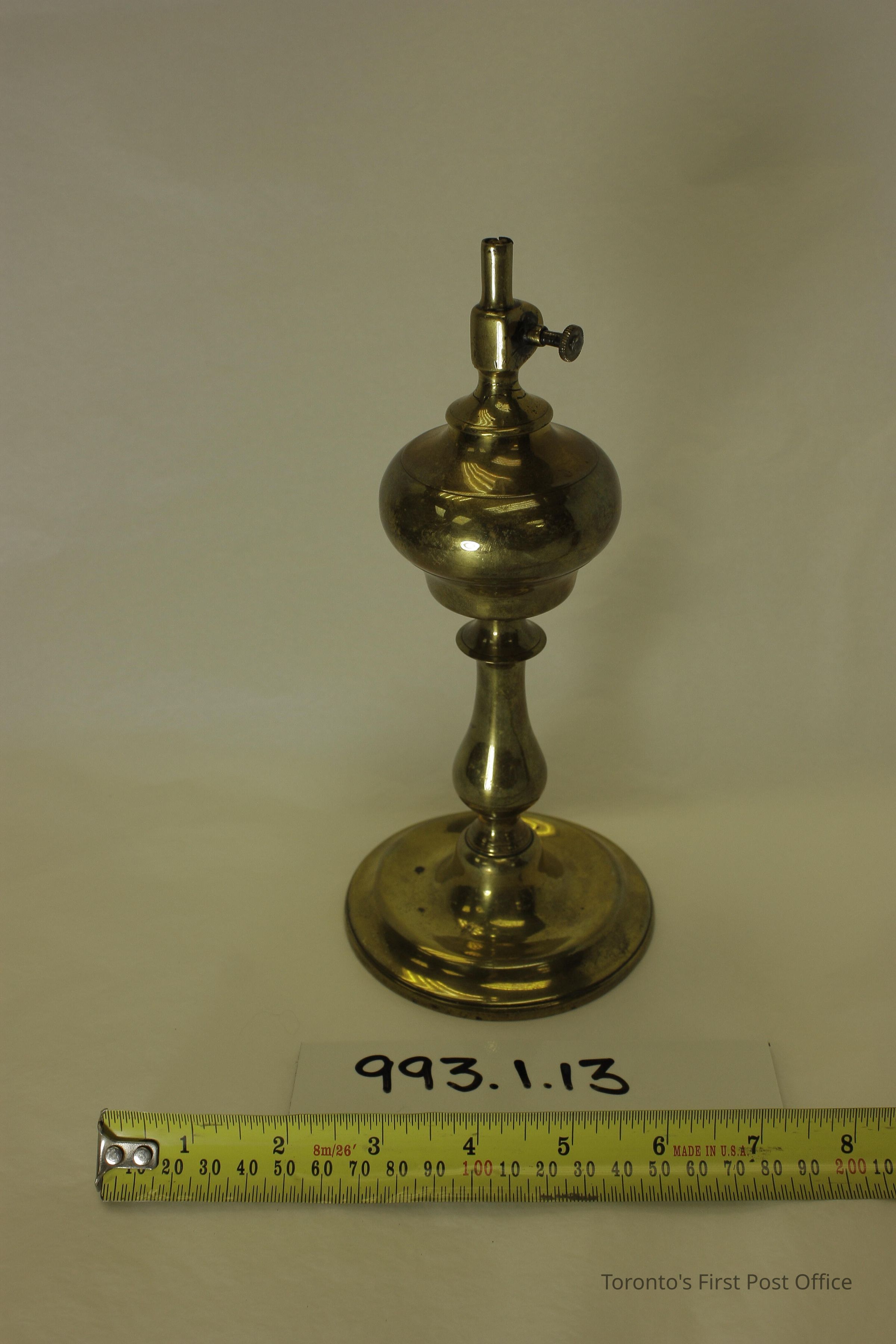 Whale oil lamp; brass; screw top lid holds wick; globular font as oil container on a vase shaped standard base; circa 1830.Dimensions