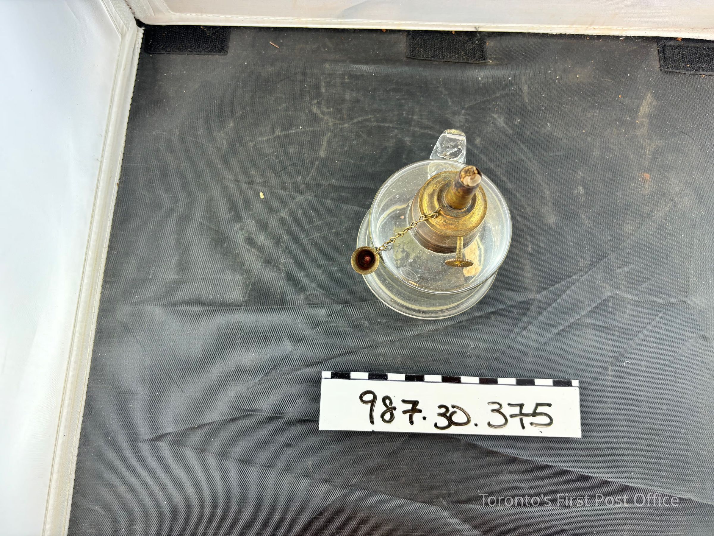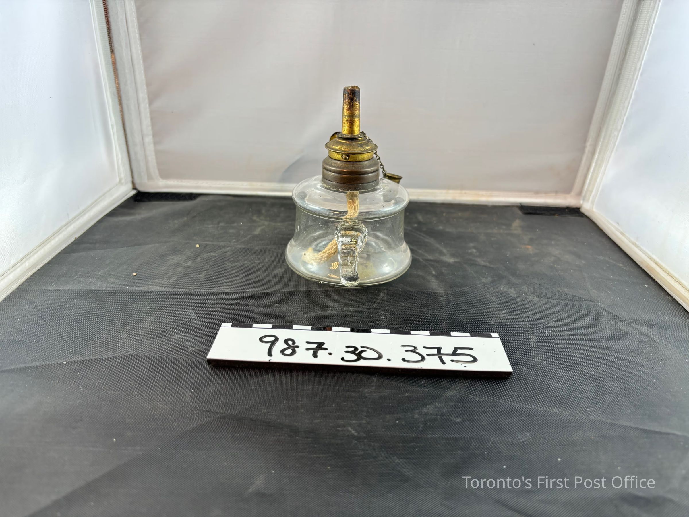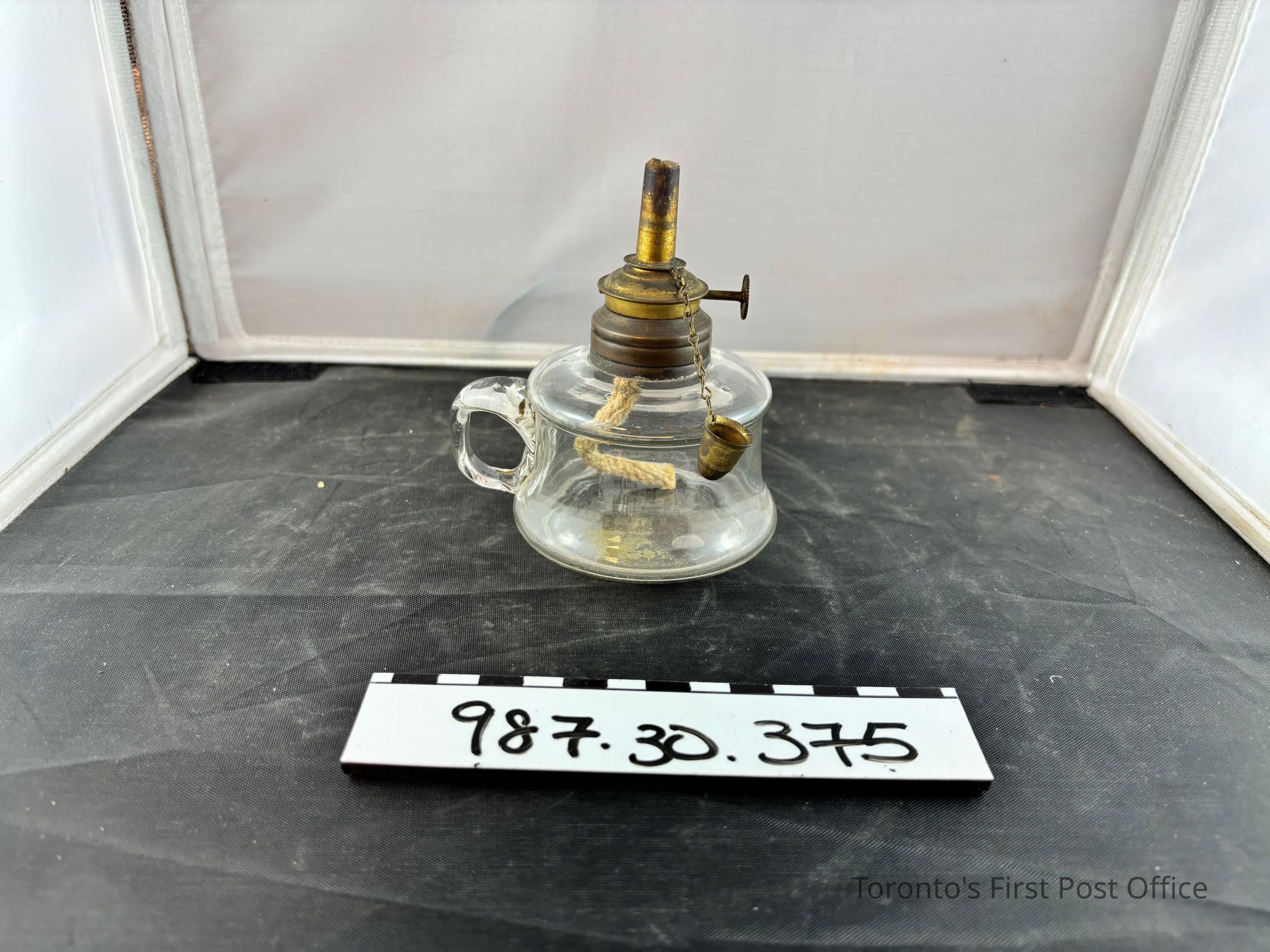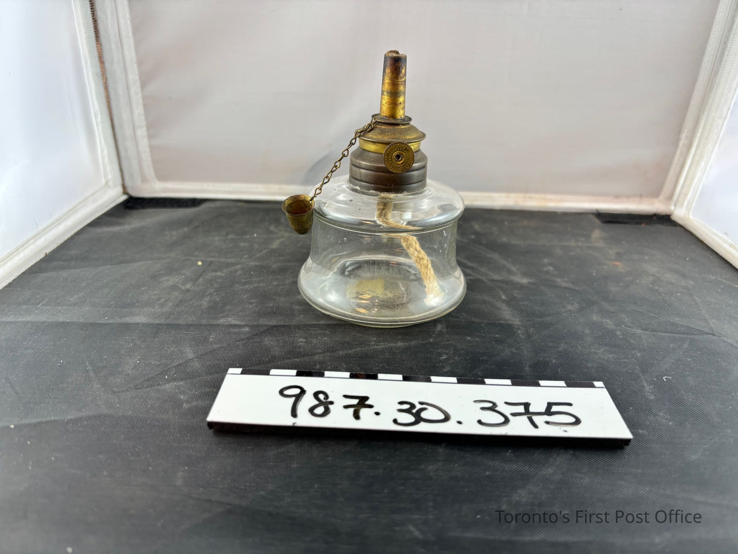 Whale oil lamp; mid 19th C. blown glass reservoir with applied handle has brass collar and wick holder with lever to push up the wick, extinguisher secured by fine chain.Dimensions