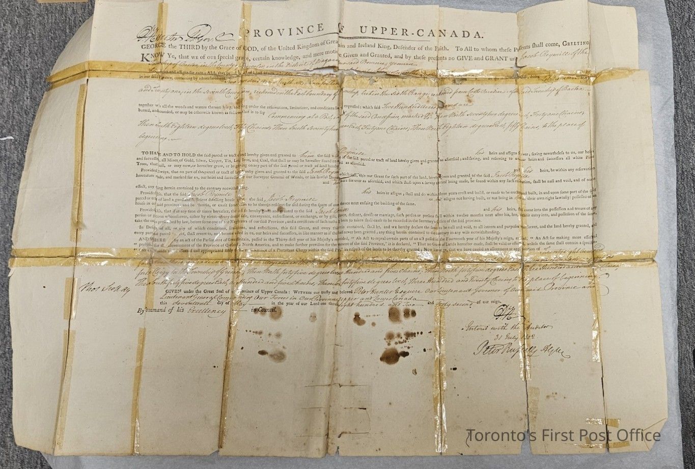 Manuscript, Crown patent for grant of Upper Canada land in the township of Barton, in the county of Lincoln, District of Niagara. Printed on laid paper with blank spaces, hand written in blank spaces. Grant of land to Jacob Reymill, signed and initialed by Peter Hunter, Lieutenant Governor, and by Peter Russell, Auditor. Dated July 31 1802Update Date