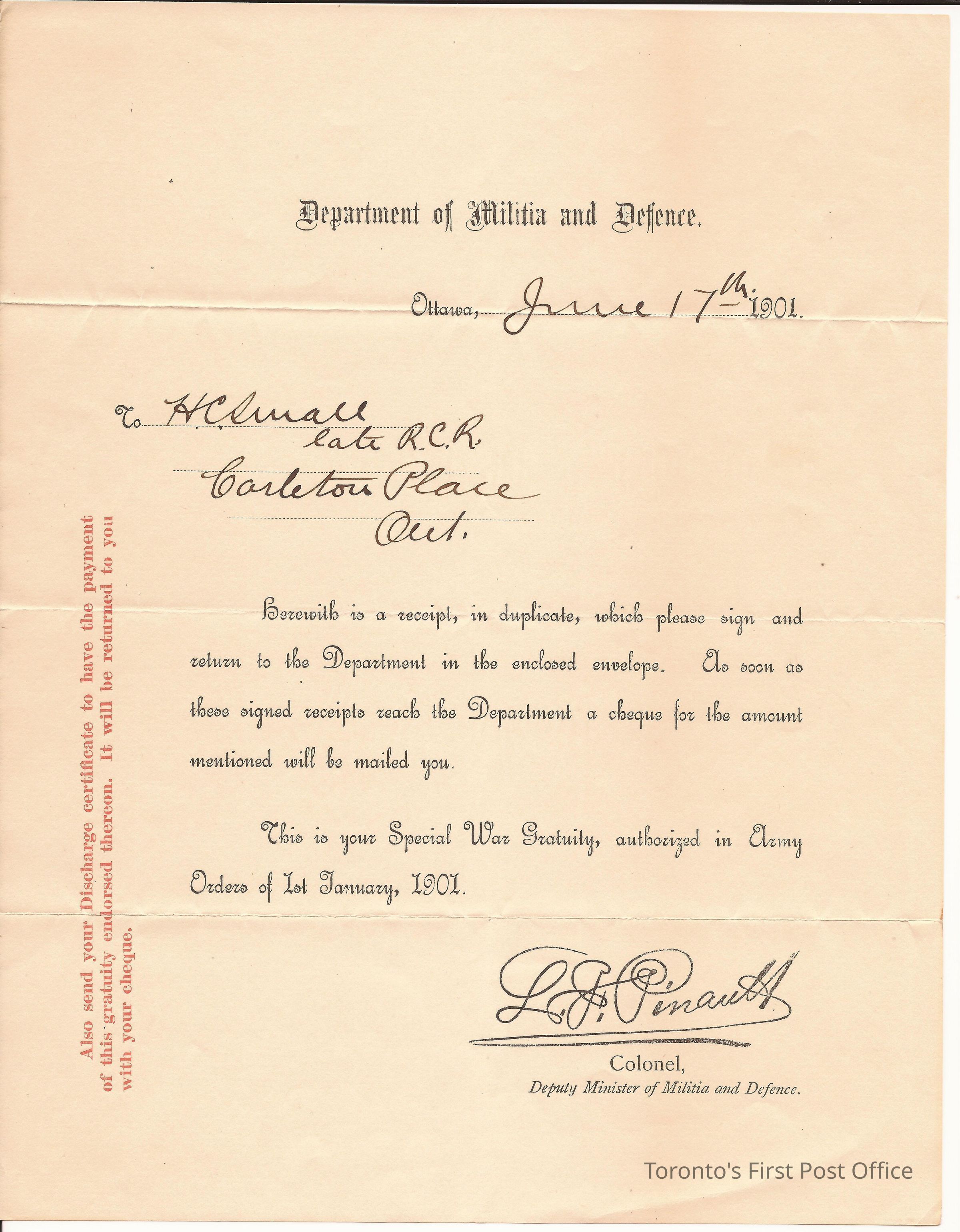 Letter; to H.C. Small, late RCR Carlton Place, Ont.; from L.G. Pinault, Colonel Deputy Minister of Militia and Defense; re: enclosed receipt to be signed and returned for Special War Gratuity; dated Ottawa, June 17, 1907; watermark: crown surmounting "CROWN LINEN"; typed on laid paper; red print on left side.Dimensions