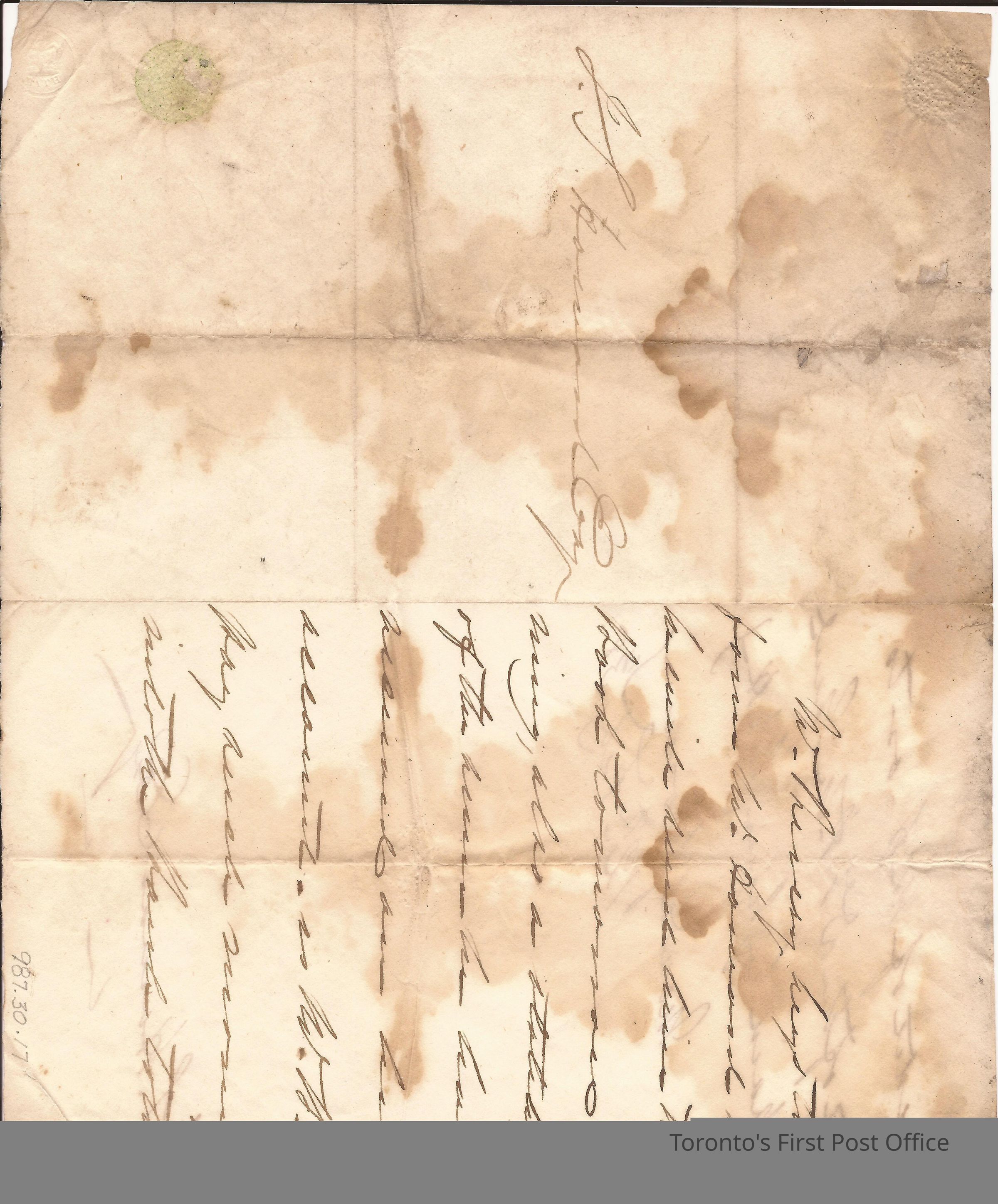 Letter from clerk for Charles Berczy to J.S. Howard, Esq.; Monday Morning, 12 Feby 1838; water-stained, yellowed paper; folded with seal; no postmarks; circular crown impression in bottom left corner.Update Date