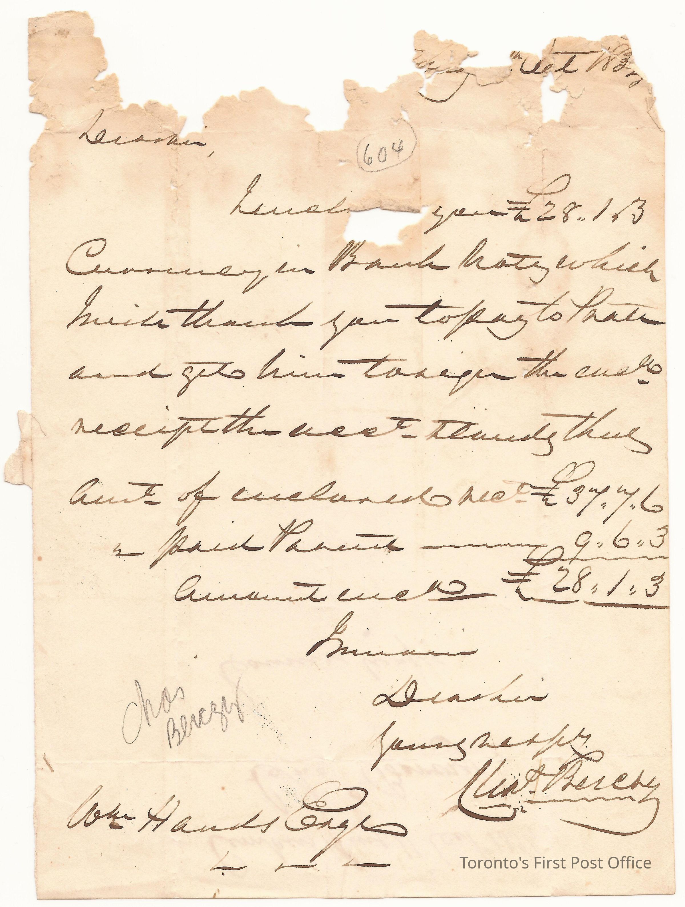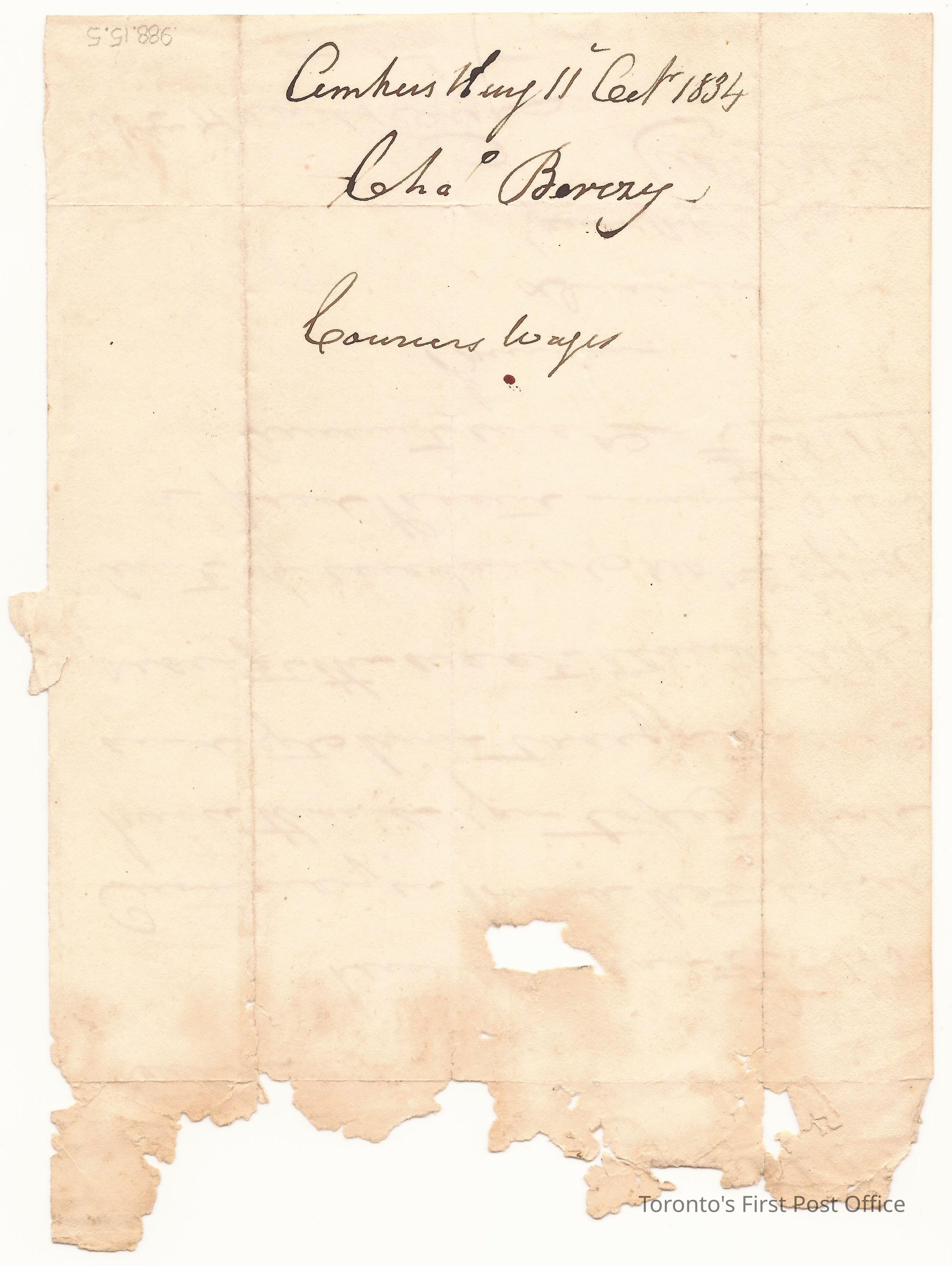 Manuscript letter from Charles Albert Berczy, Amherstburg, U.C.; to Wm. Hands, Sandwich, U.C.; 11 October 1834; two-sided; browned paper; folded as an envelope; re: couriers' wages.Update Date