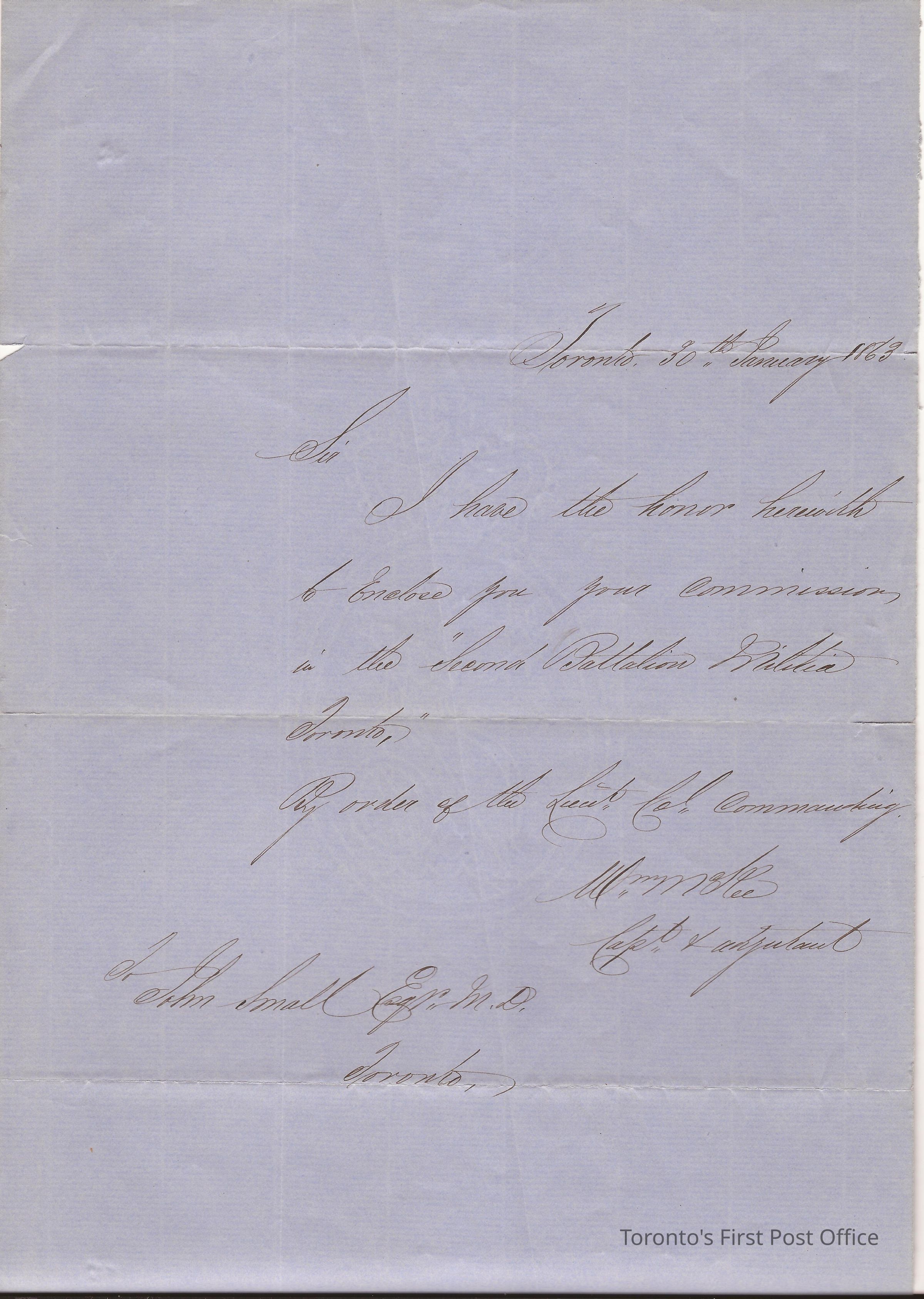 Letter; to John Small, Esquire MD; from William McFee(?) Captain and Adjutant; dated: Toronto 30th Jan 1863; black ink; blue paper; watermark: "Britannia" in oval.; re: stating enclosure and commission in the "Second Battalion Militia Toronto".Update Date