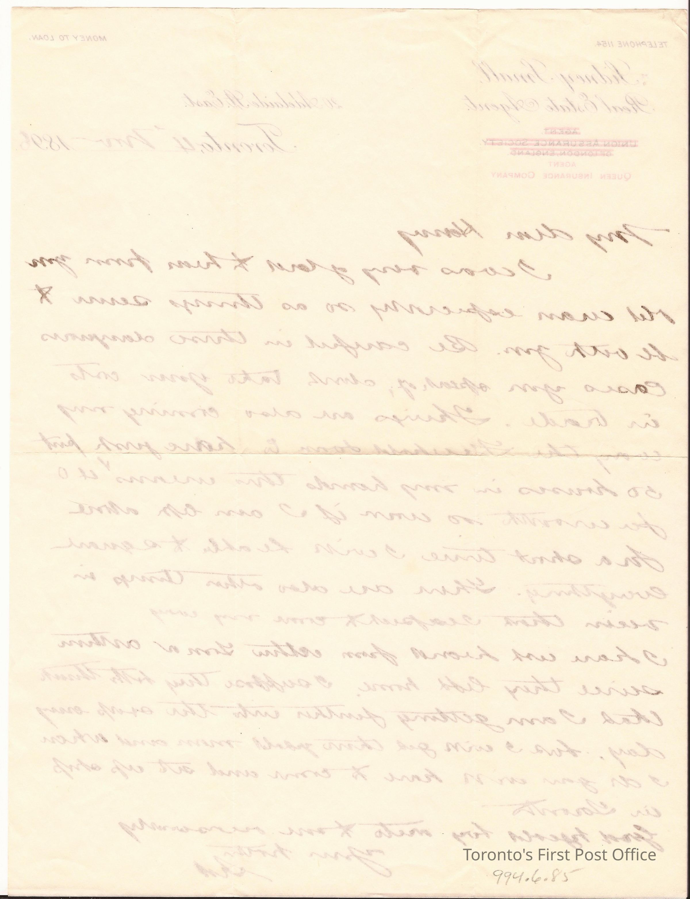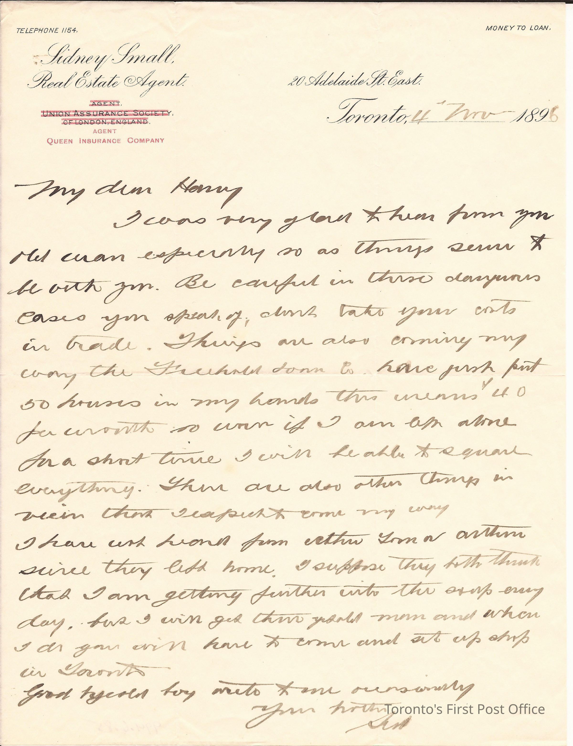 Letter; to Harry; from Sid; re: deals/business advice; black ink; letterhead of Sidney Small, Real Estate Agent, 20 Adelaide St. E. Toronto 4 Nov 1896; London England branch stroked through in black.Update Date