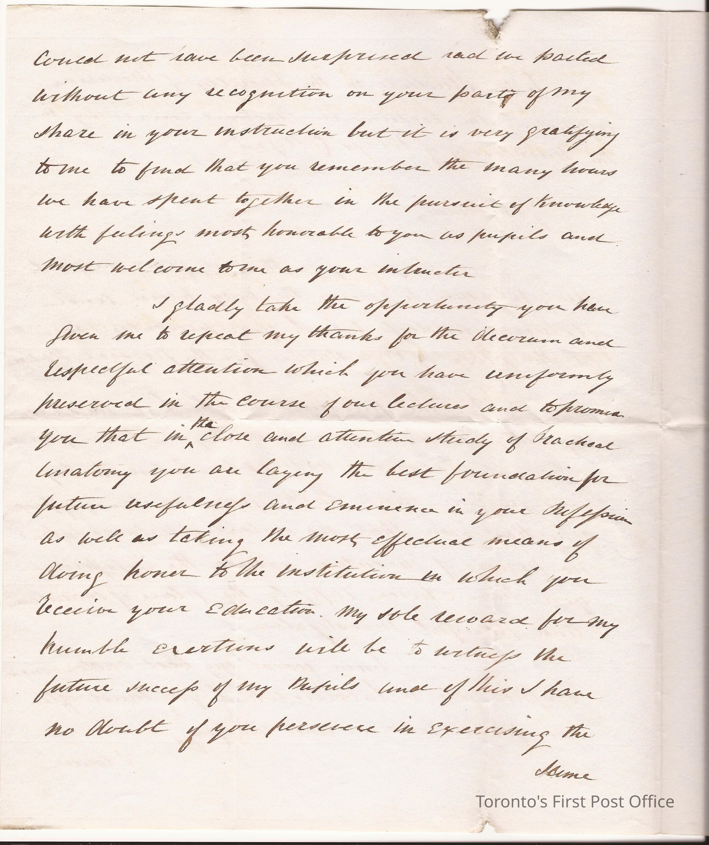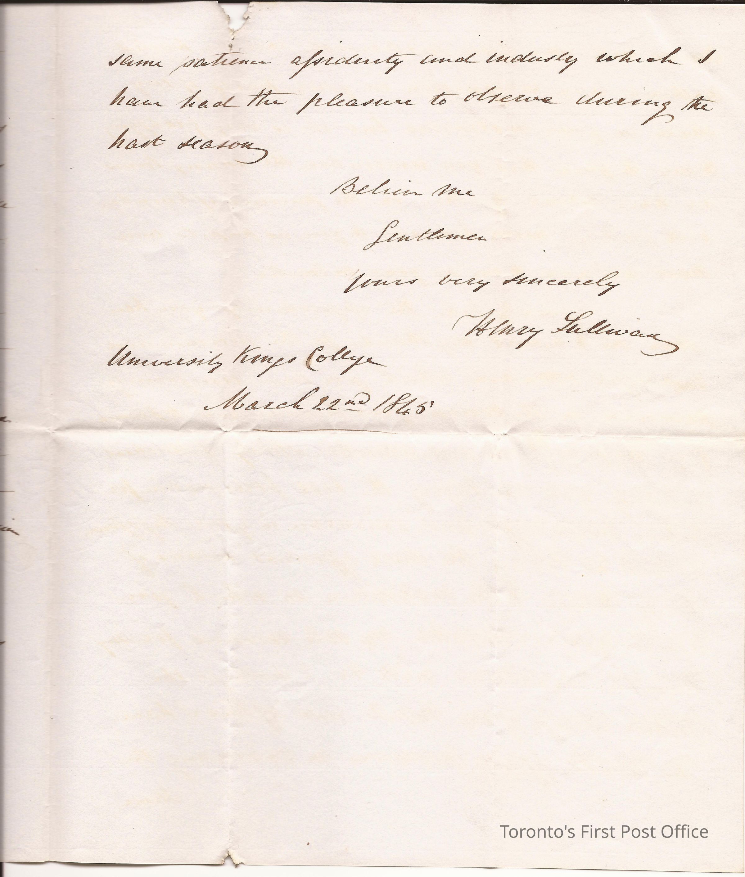 Open letter to Faculty of Medicine students in Anatomy at King's College thanking them for the kind and flattering address presented J.H.S.; dated University of Toronto, King's College, Mar 22 1845; black ink.Update Date