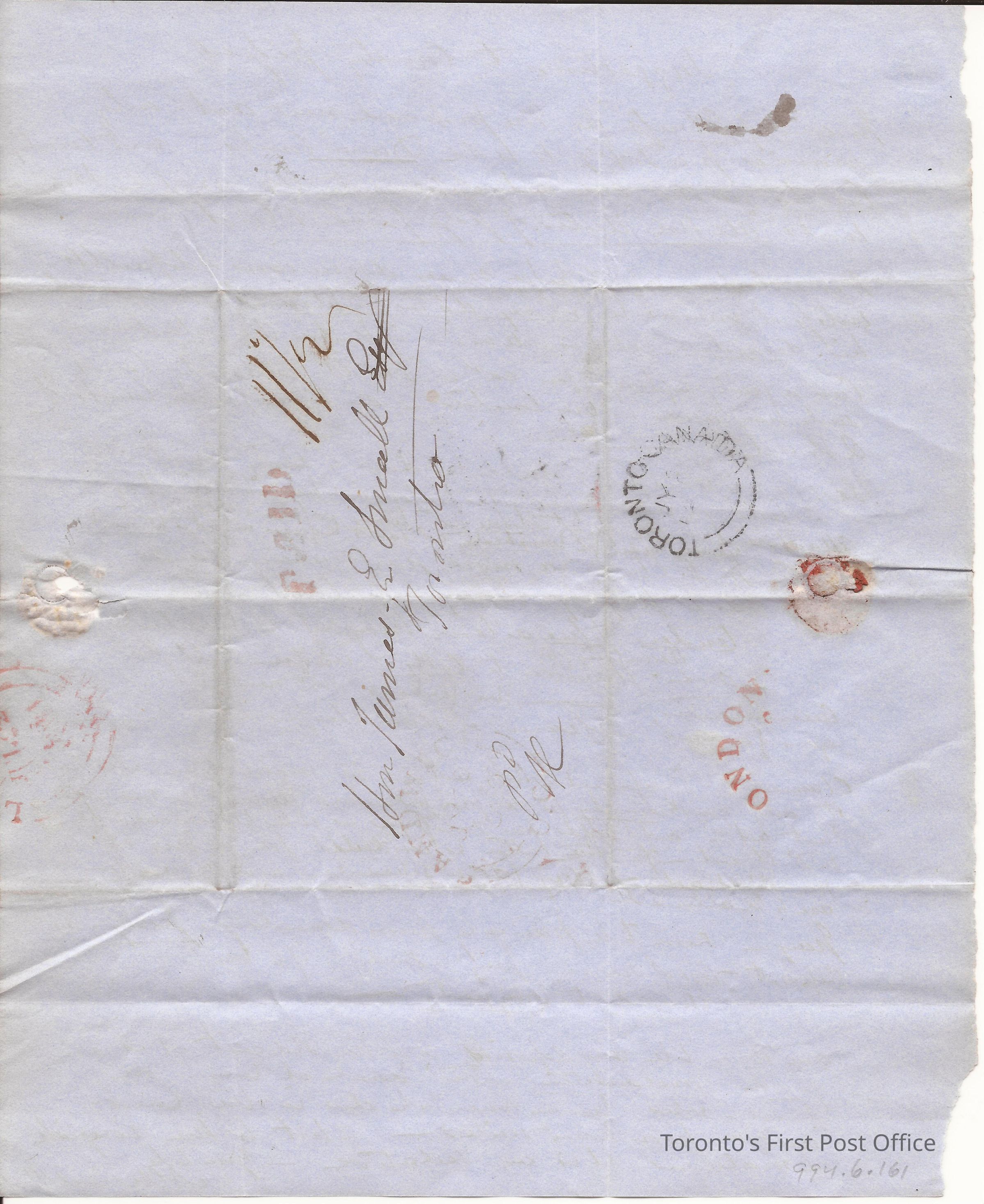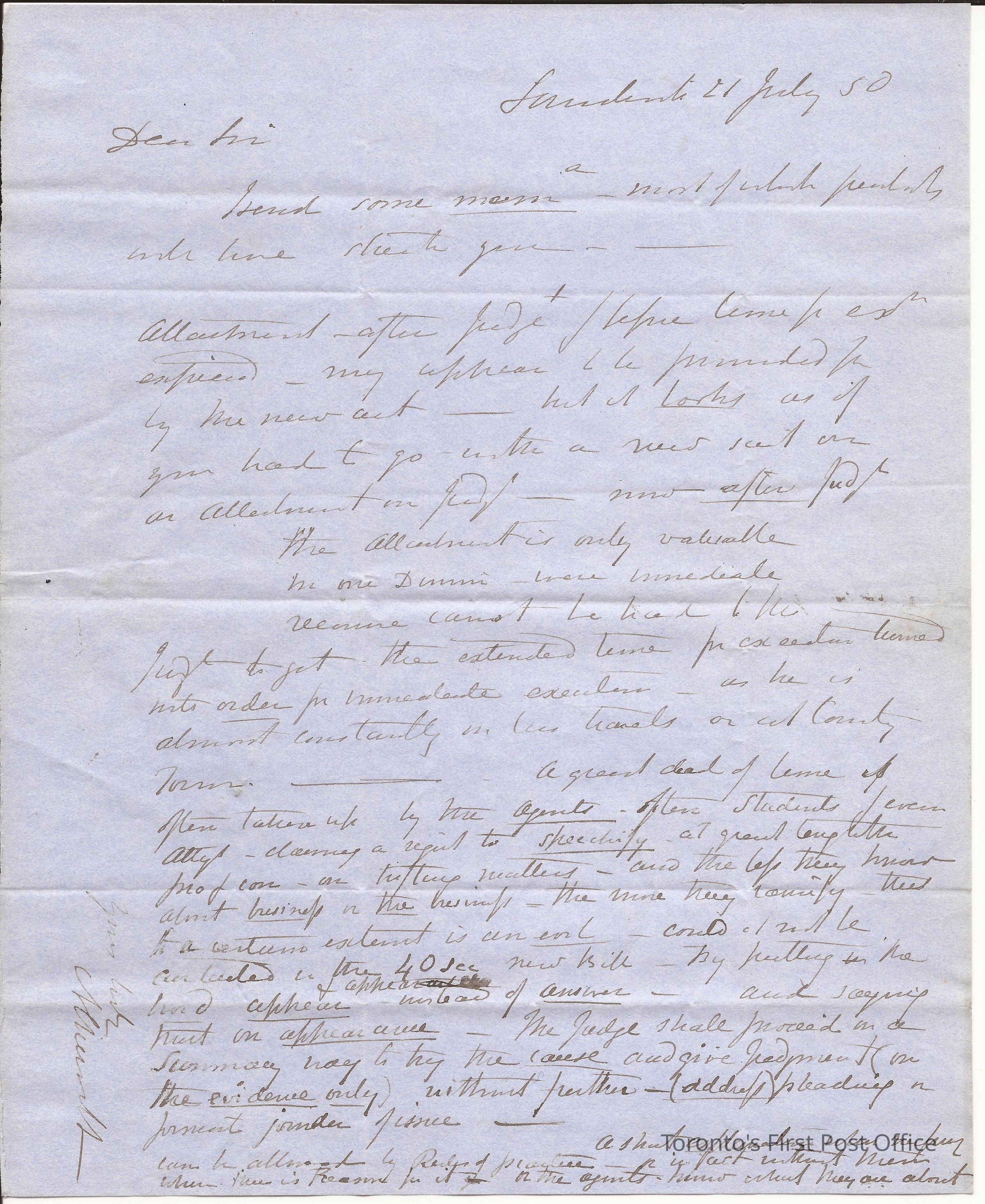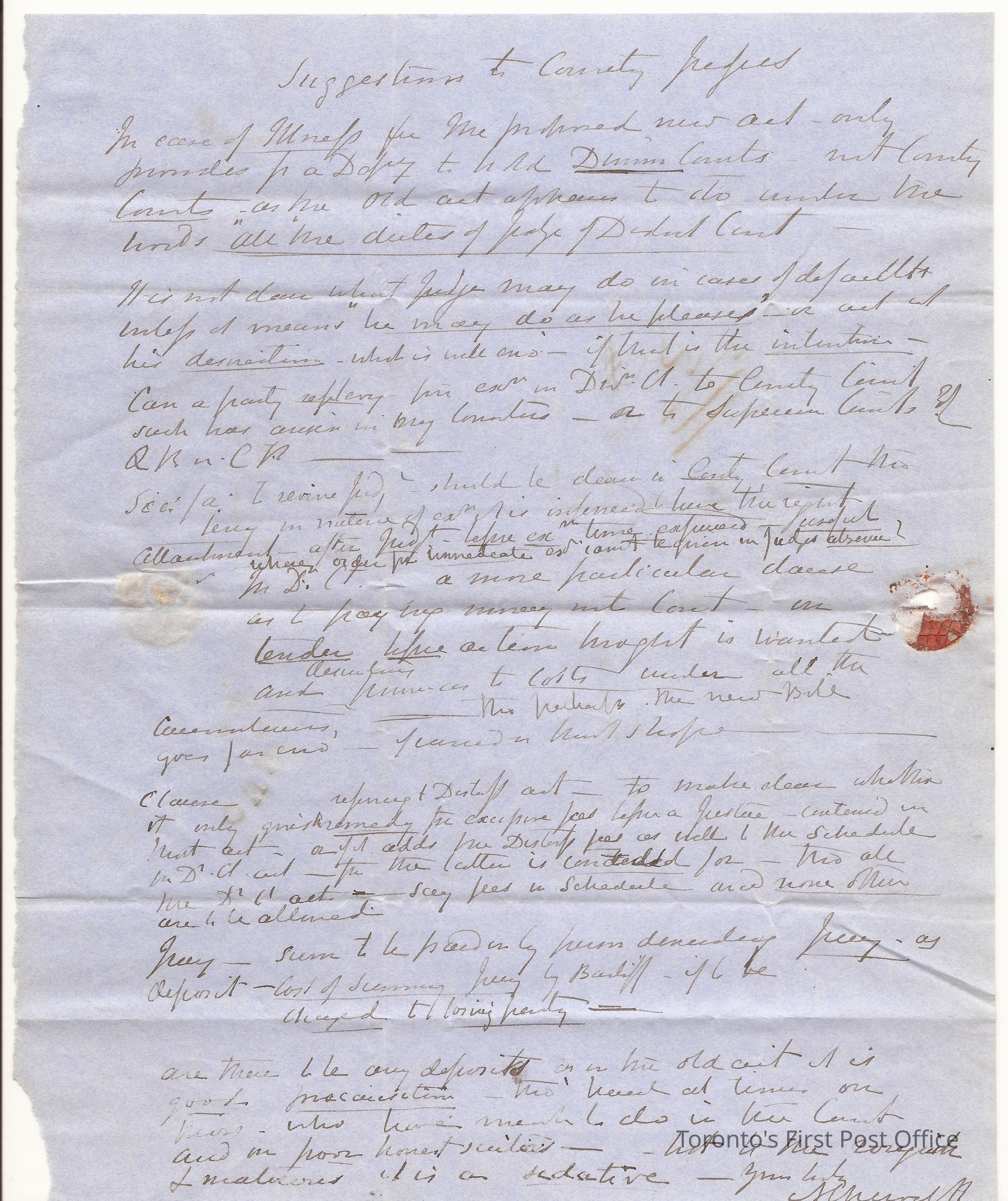 Letter; to Hon. James E. Small; from A.C. Chervett; dated: Sandwich 21 July 50; re: rules of practice for County Court; postmarks: red "PAID", "LONDON", black broken double "TORONTO CANADA JY…", red broken double "L… JUL 22 1850 CW"; red broken double "SANDWICH JY... U.C."; red wax seal remnant; edited; black ink on blue paper; 2 pp.Update Date