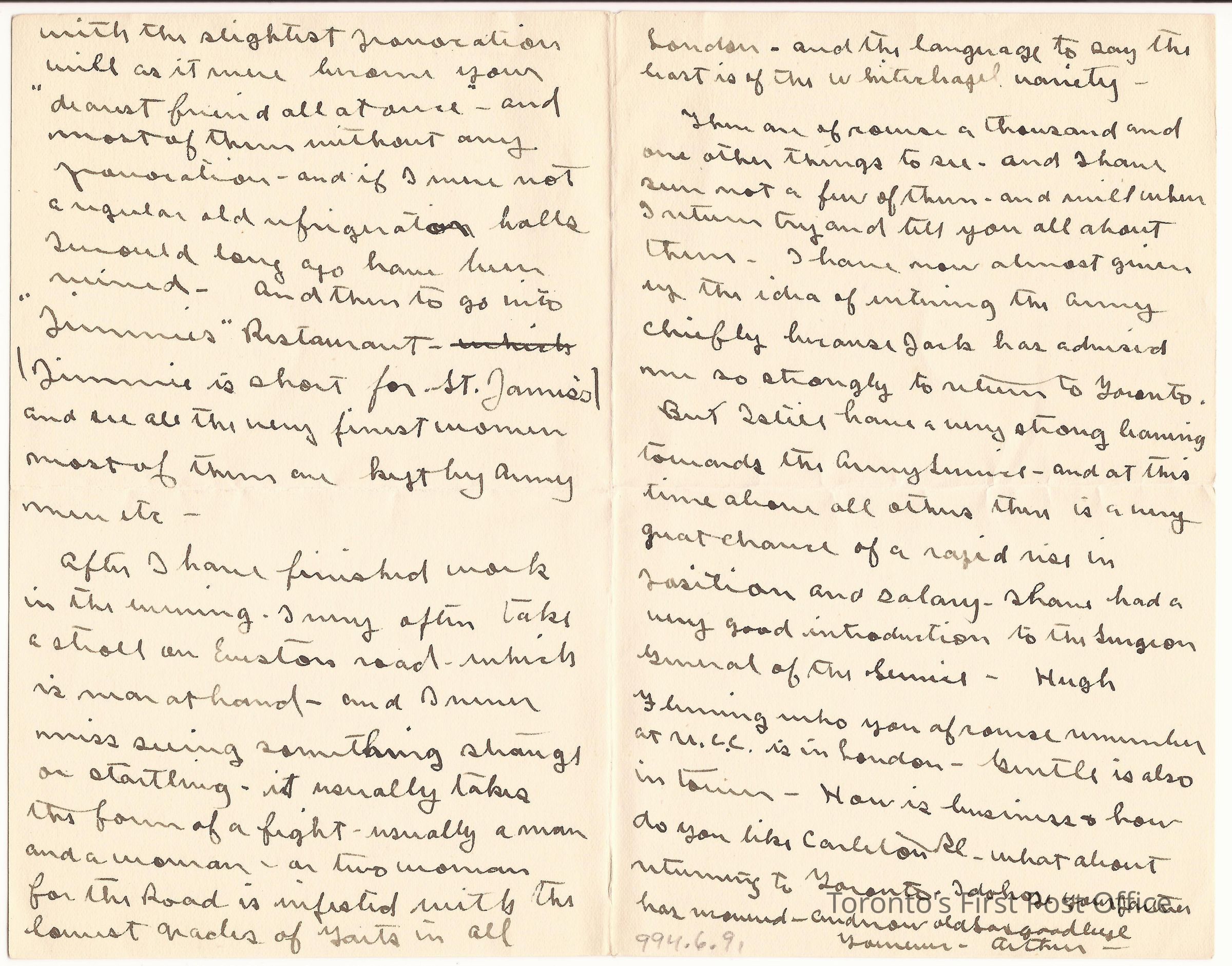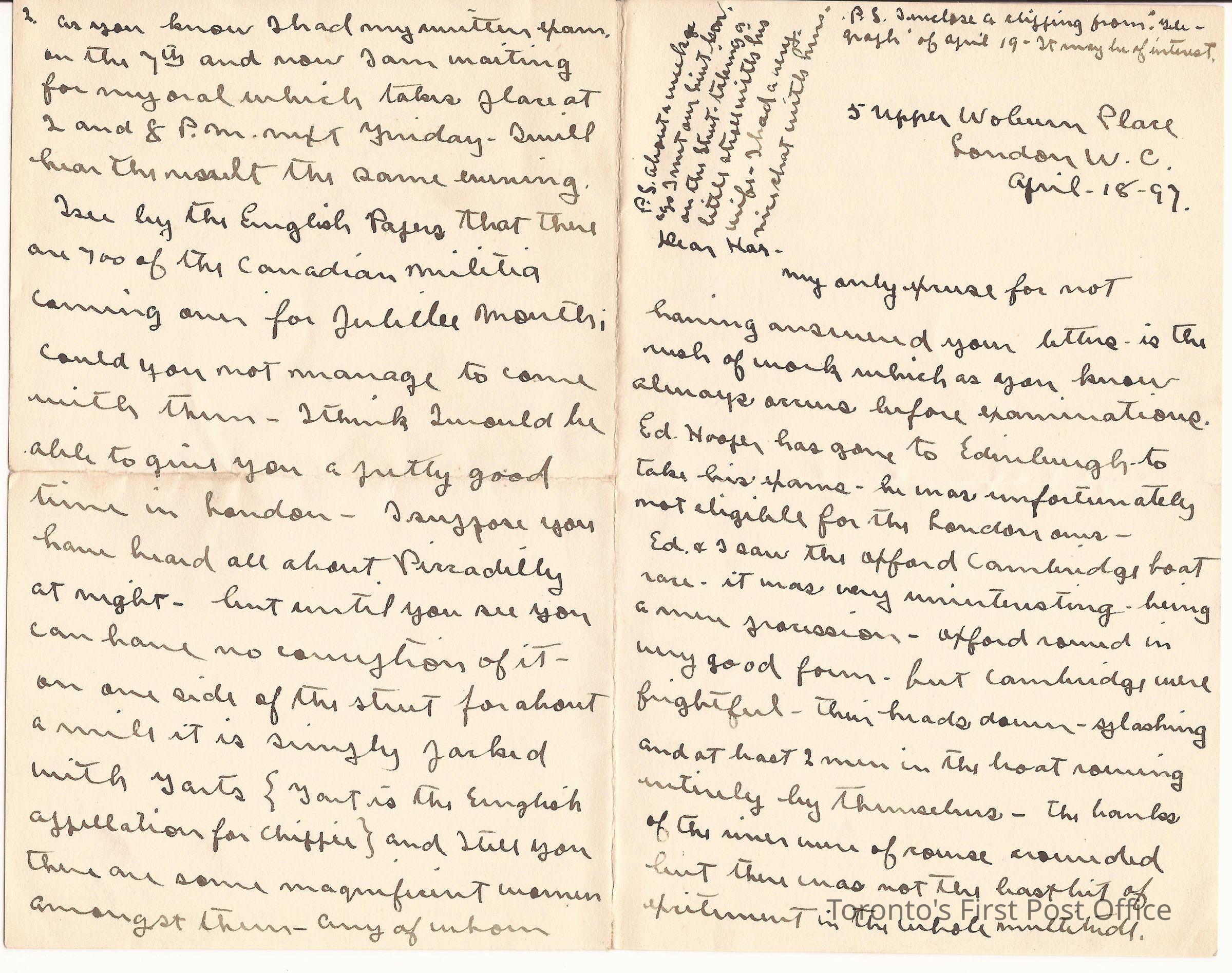 Letter; to Har; from Arthur; dated: 5 Upper Woburn Place London W.C. April-18-97; re: about Arthur's studies; not entering the army (see 994.6.89), rowing regatta, street life, low life, women; black ink; watermark: "VATICAN * VELLUM".Update Date