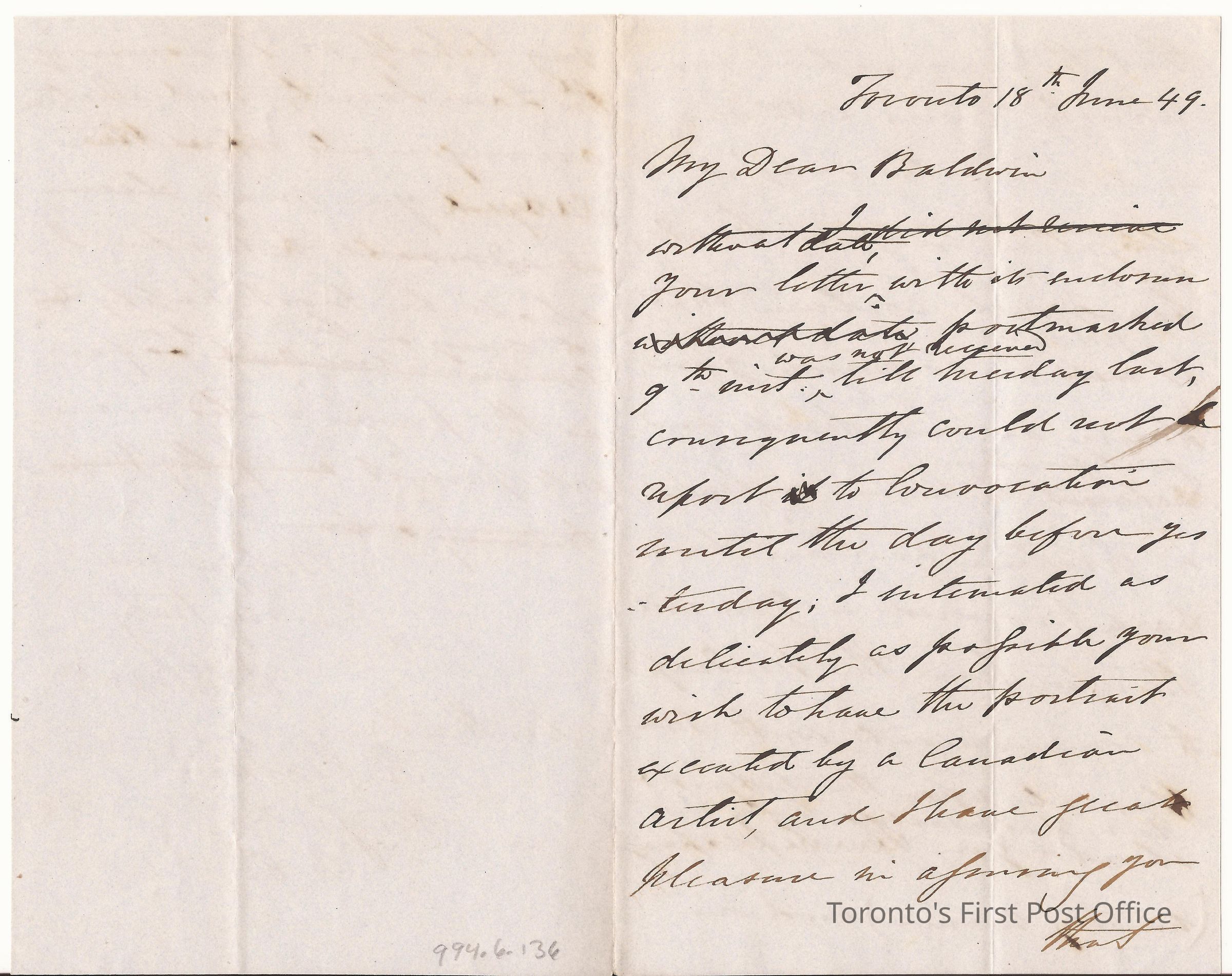 Letter: to the Honbl. R. Baldwin Attorney General U.C.; from J.E. Small; re: J.E. Small is leaving the painting of the portrait entirely in Baldwin's hands (ie artist, cost, etc.); black ink on heavy grey paper.Dimensions