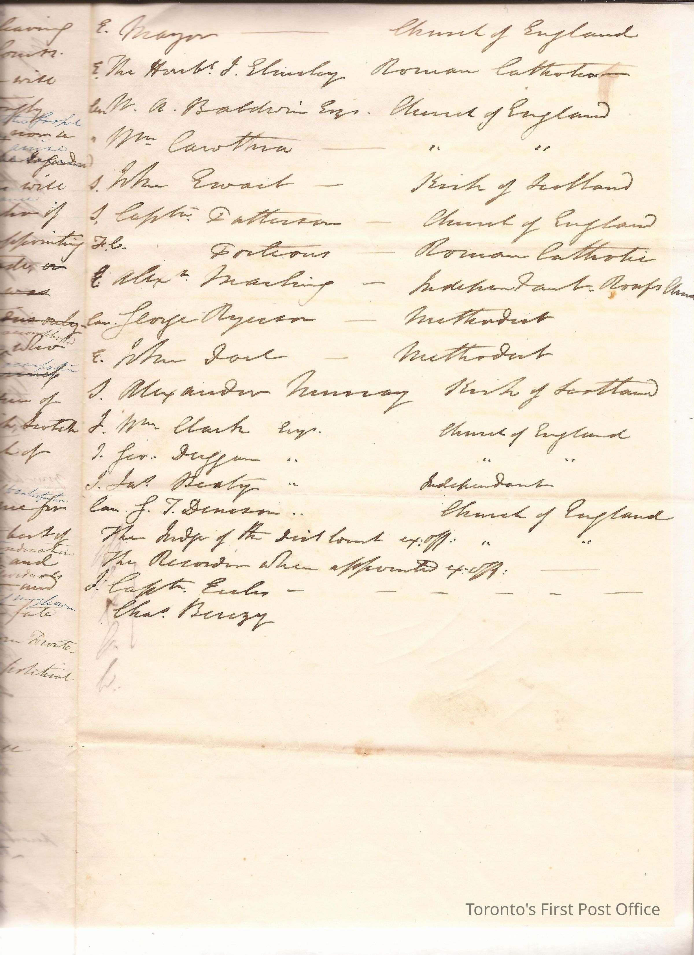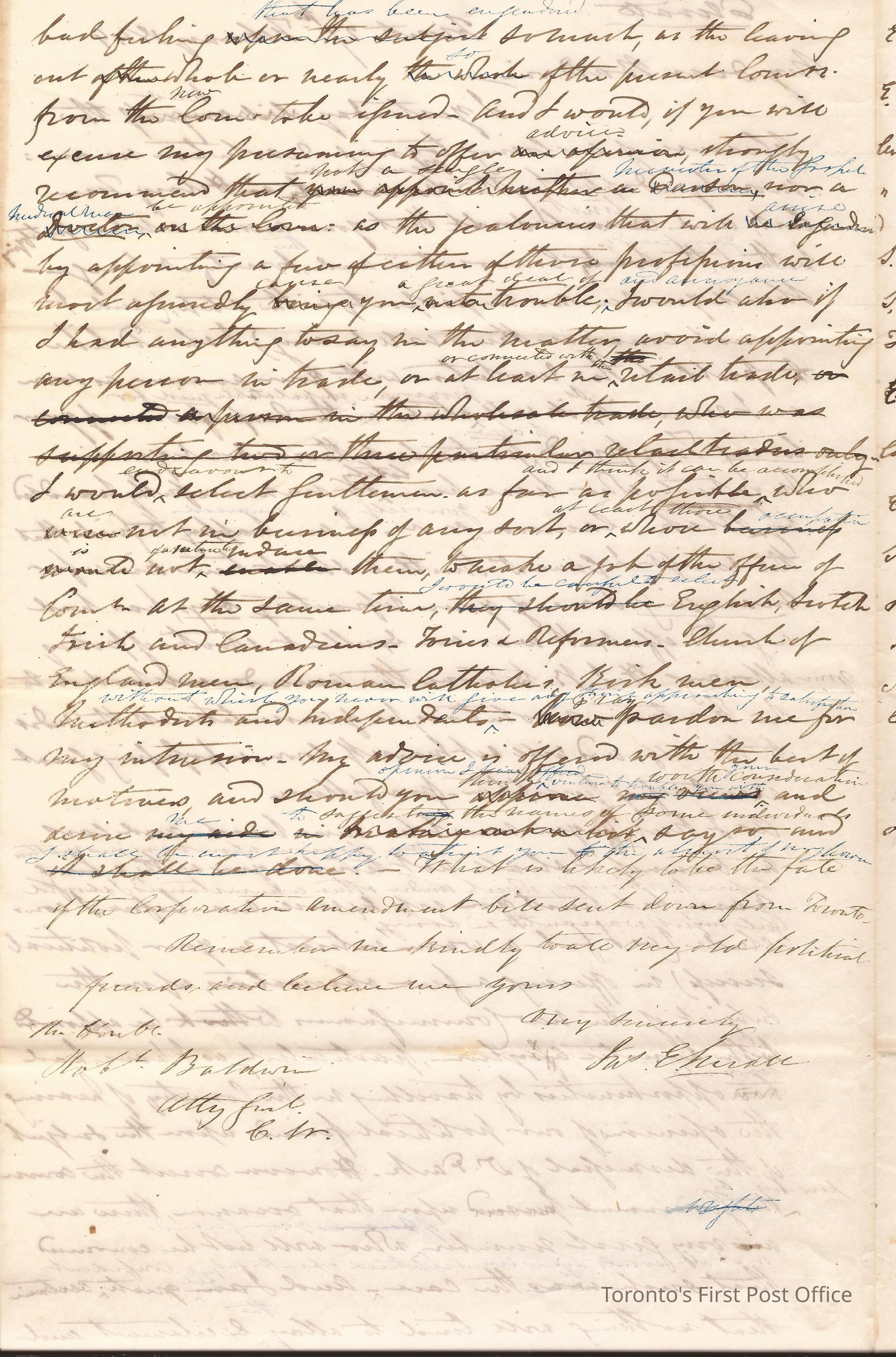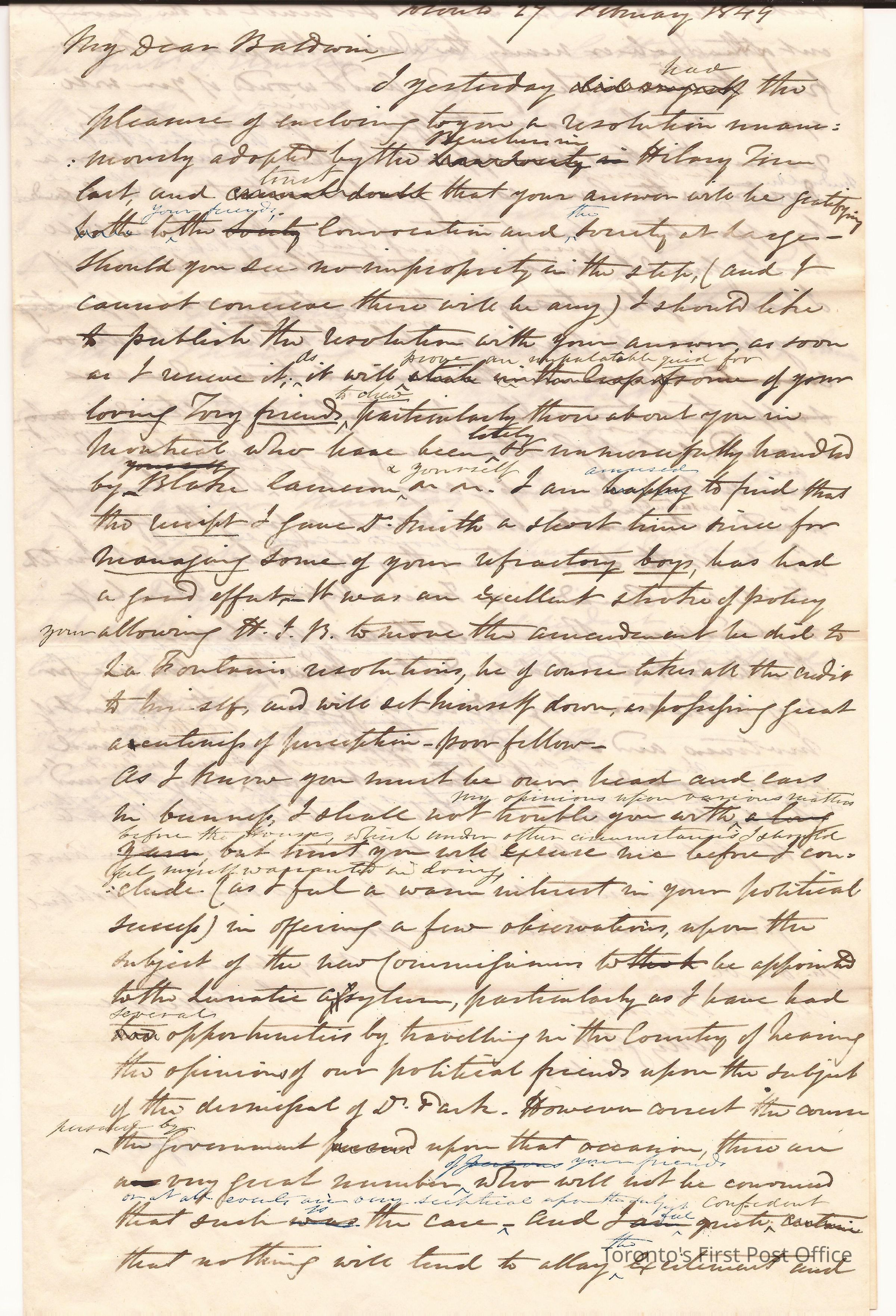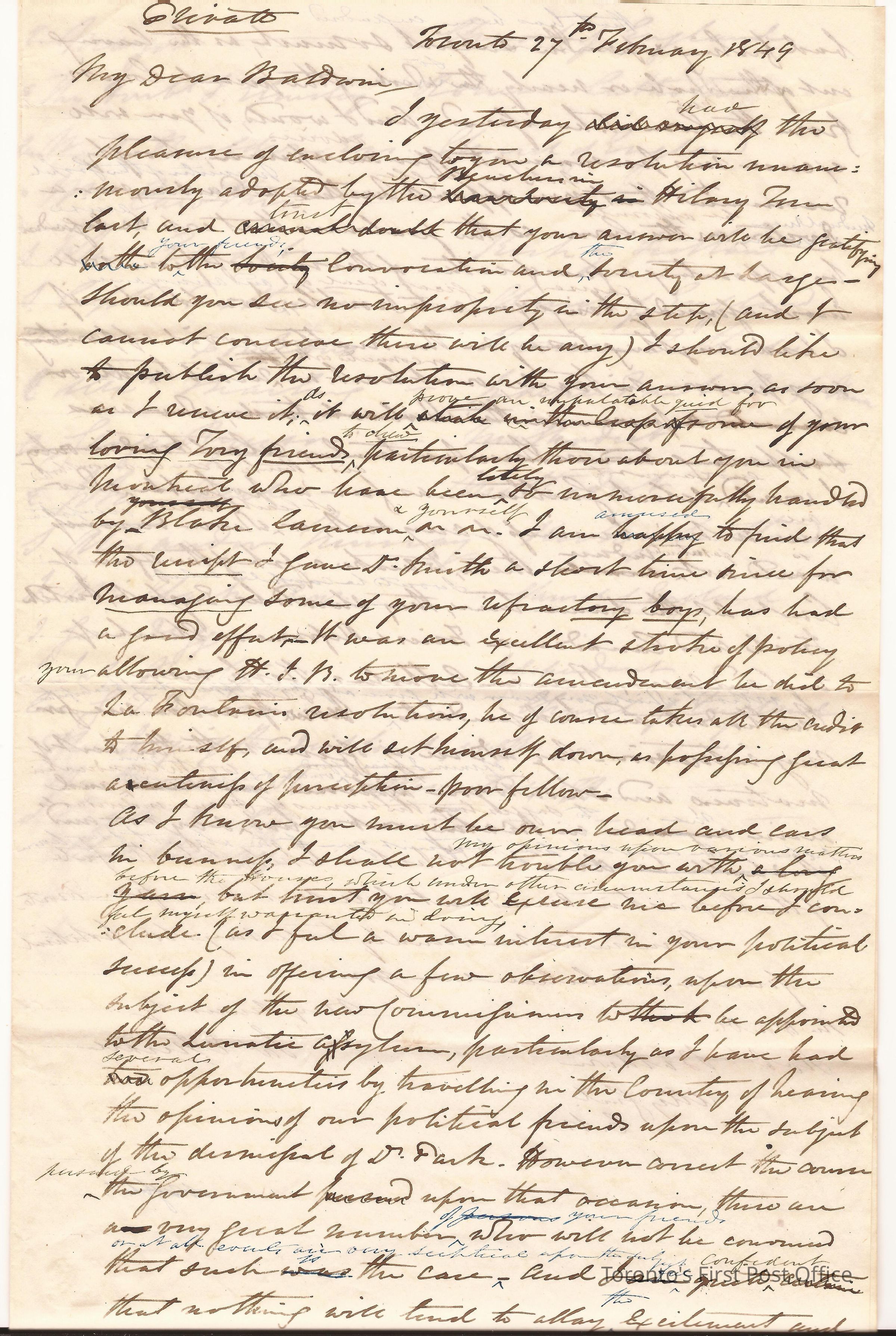 Letter; from Jas. E. Small; from R. Baldwin; dated Toronto 27th Feb. 1849; re: appointment of commission to insane asylum should be Catholic, Methodist, etc. not a tradesperson with the retail sector, list of possible candidates; edited; black ink.Dimensions