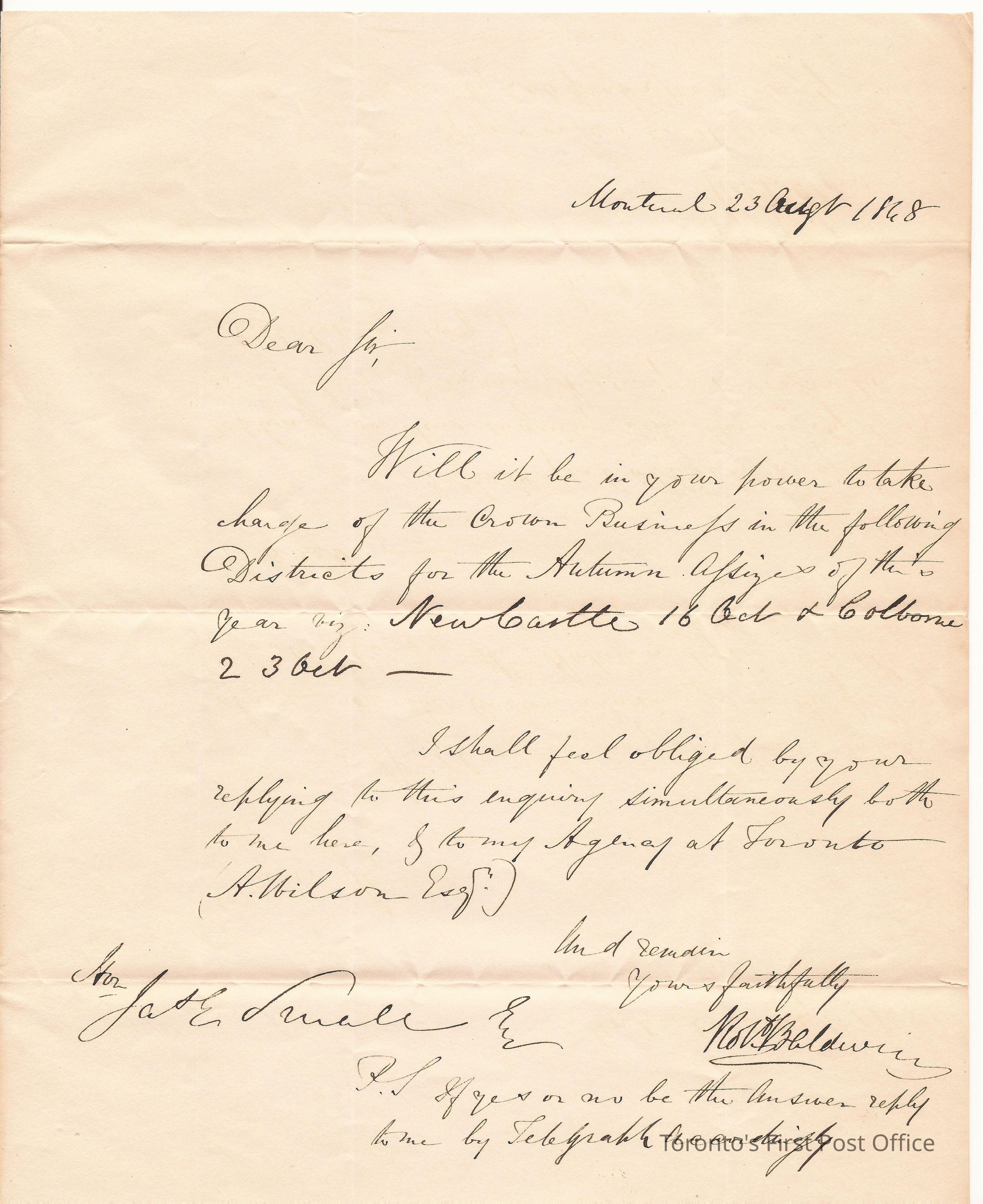 Letter; to Jas. E. Small; from Robt Baldwin; re: Baldwin is asking to take charge of Crown business for autumn assizes; watermark: "J WHITMAN TURKEY MILL 1845".Dimensions