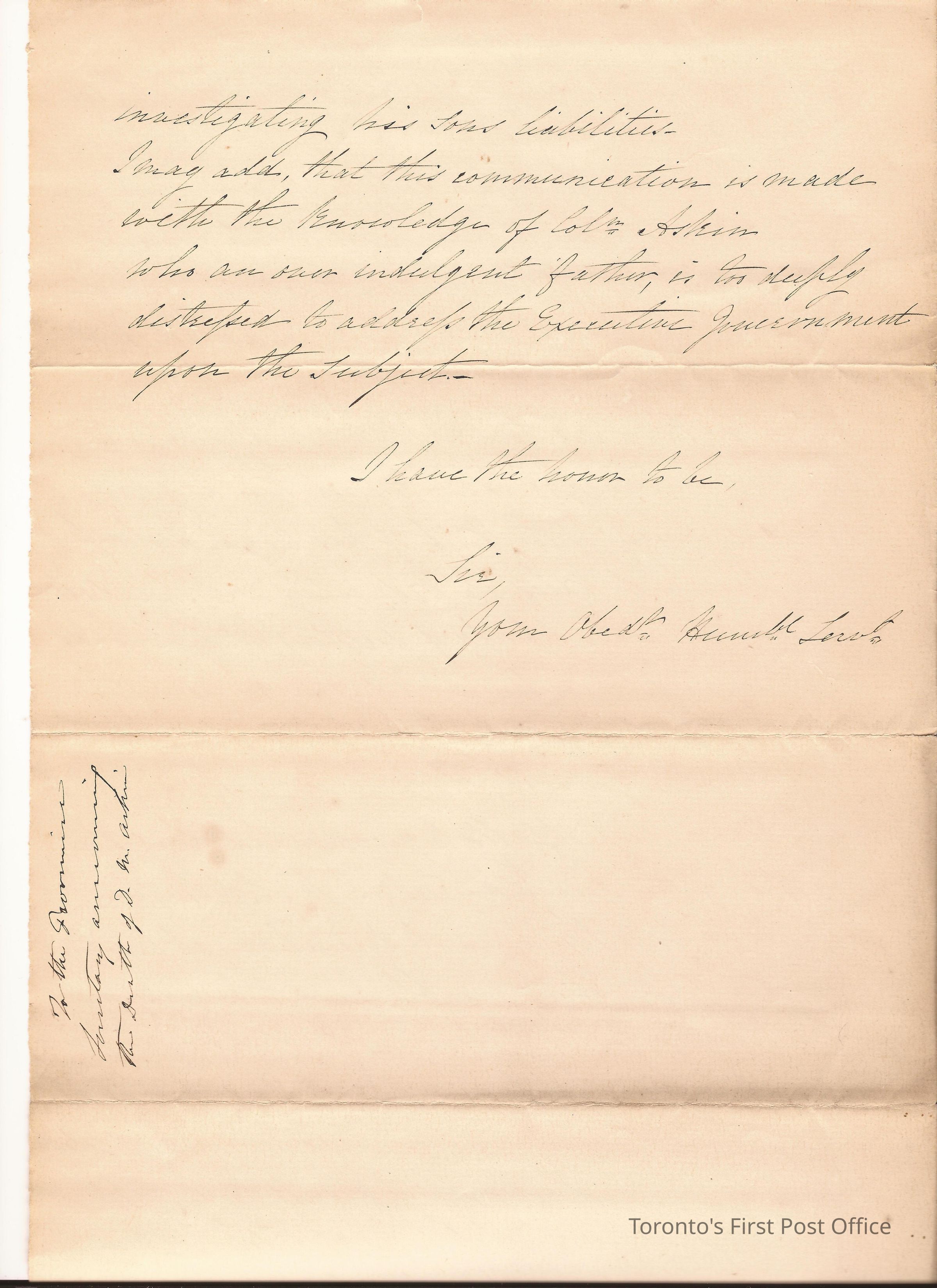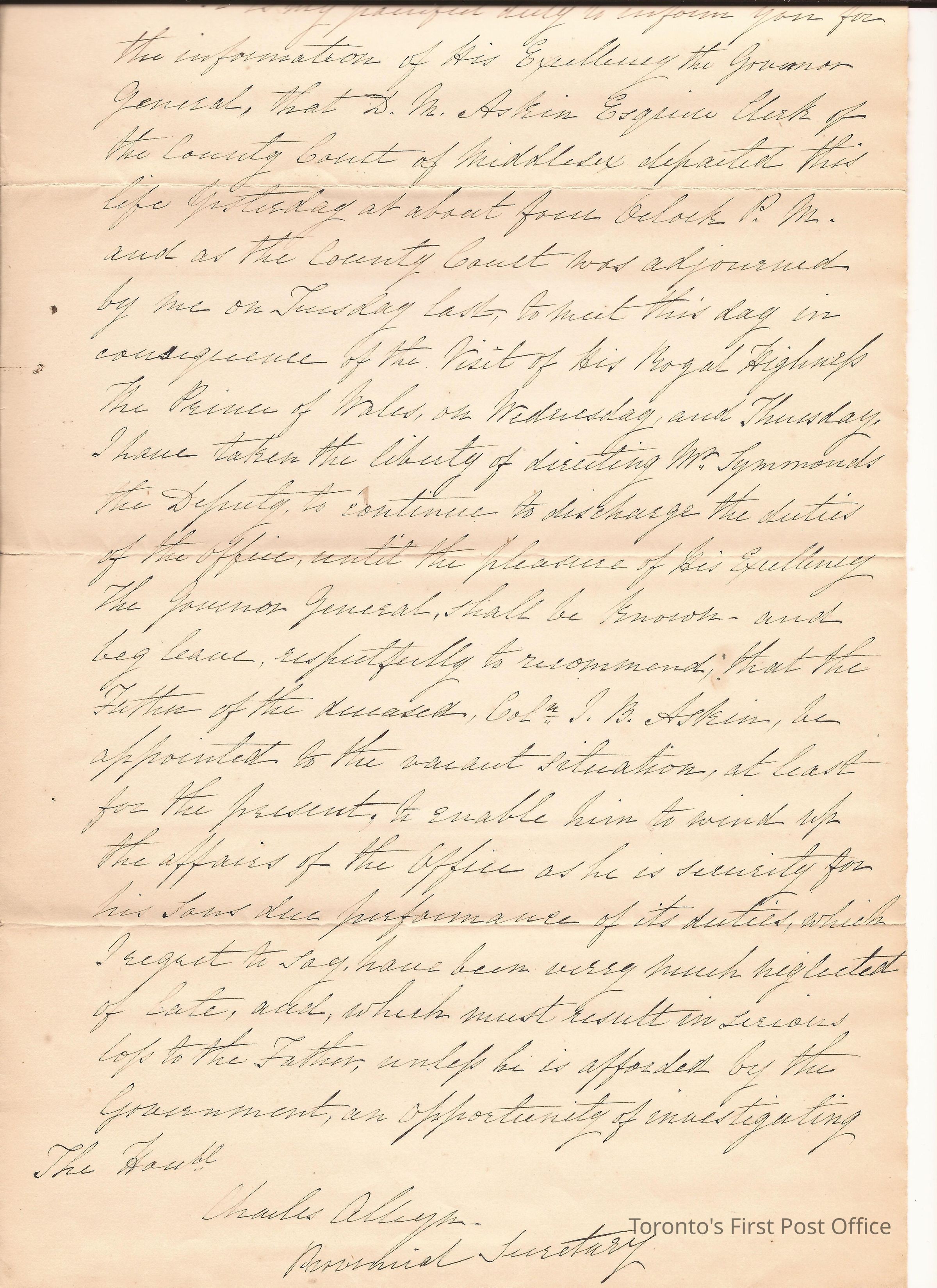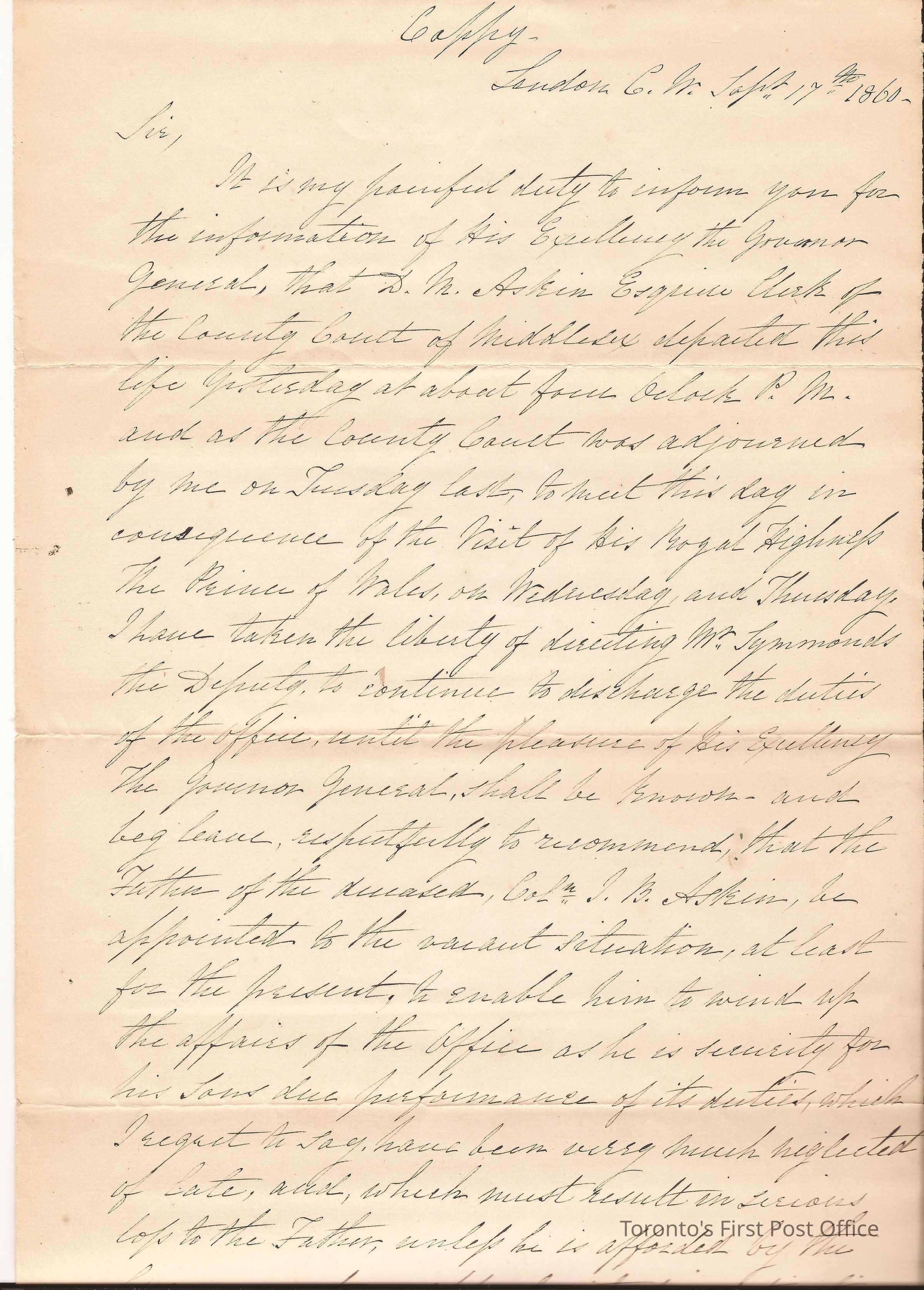 Letter; from Charles Alleyn, Provincial Secretary; dated London C.W. Sept. 17th 1860; re: announcing death of A.M. Askin, Clerk of the Court of Middlesex and the temporary appointment of Mr. Symmonds, the Deputy and to appoint the father of Askin to enable him to investigate his sons liabilities and to straighten out much neglected work; black ink on laid paper.Update Date