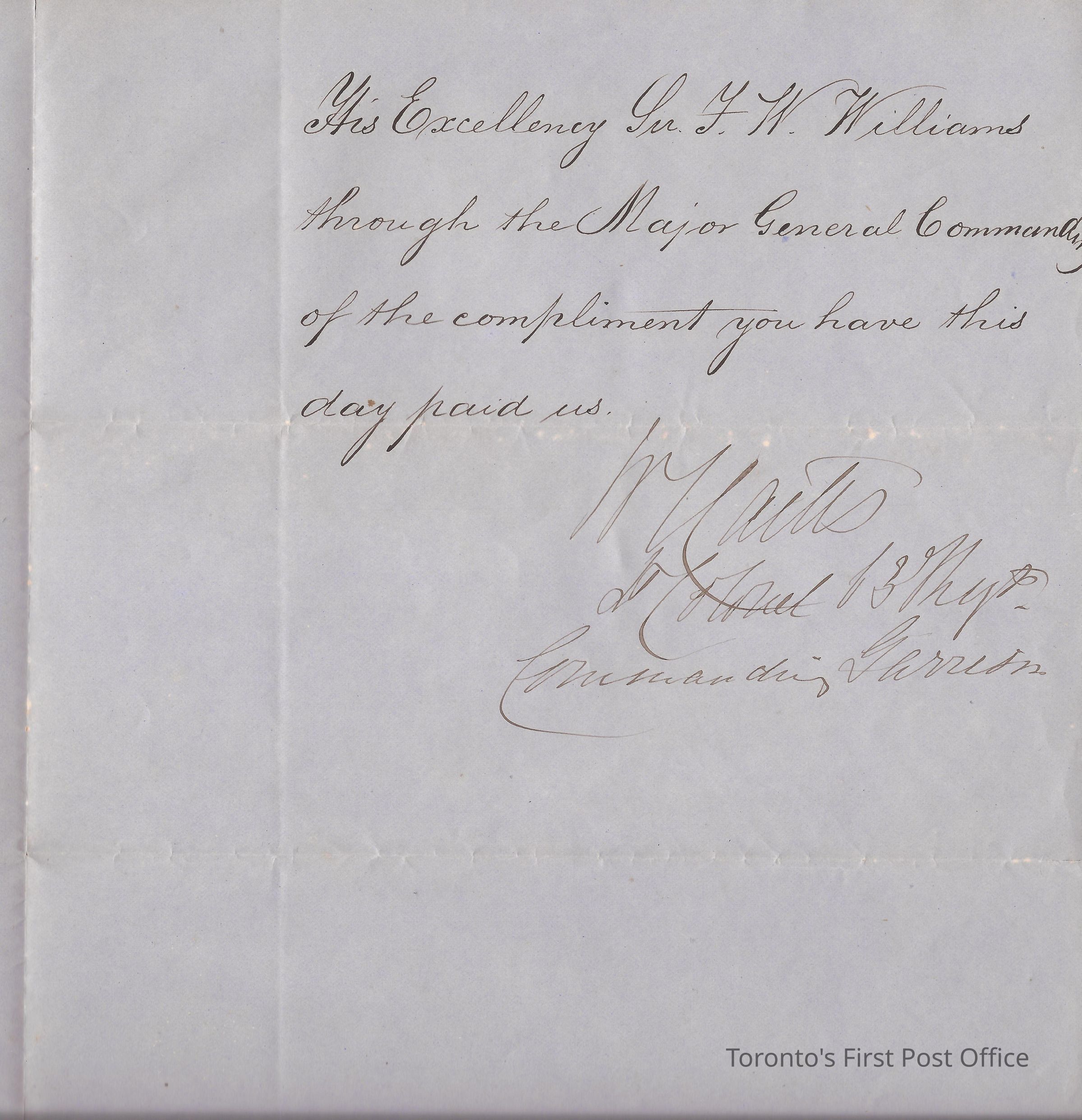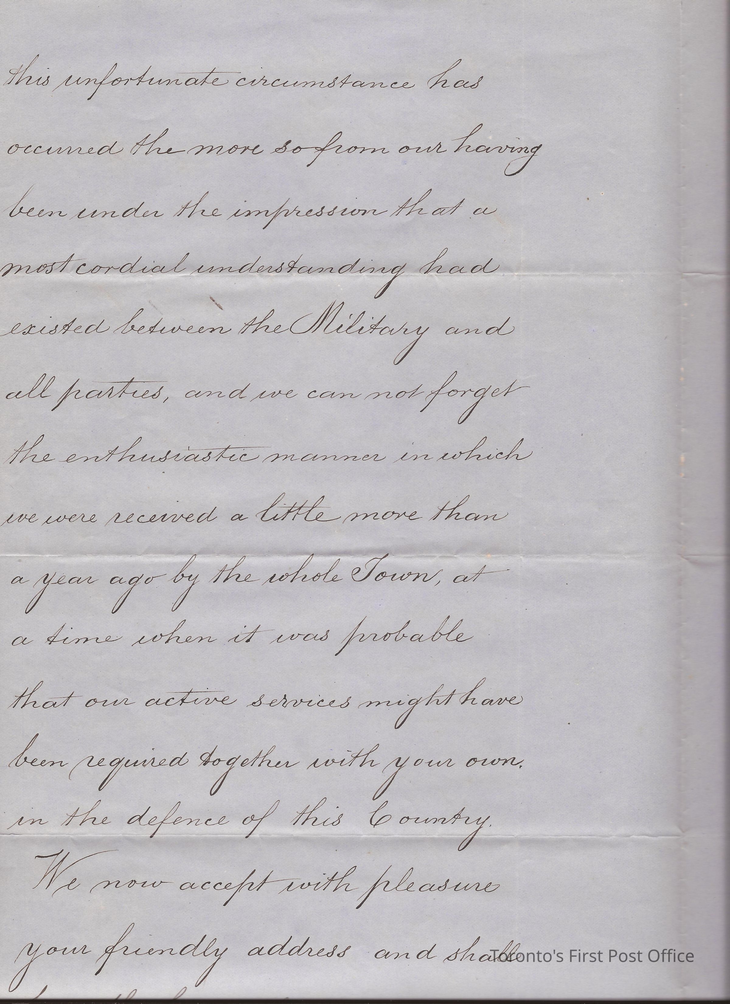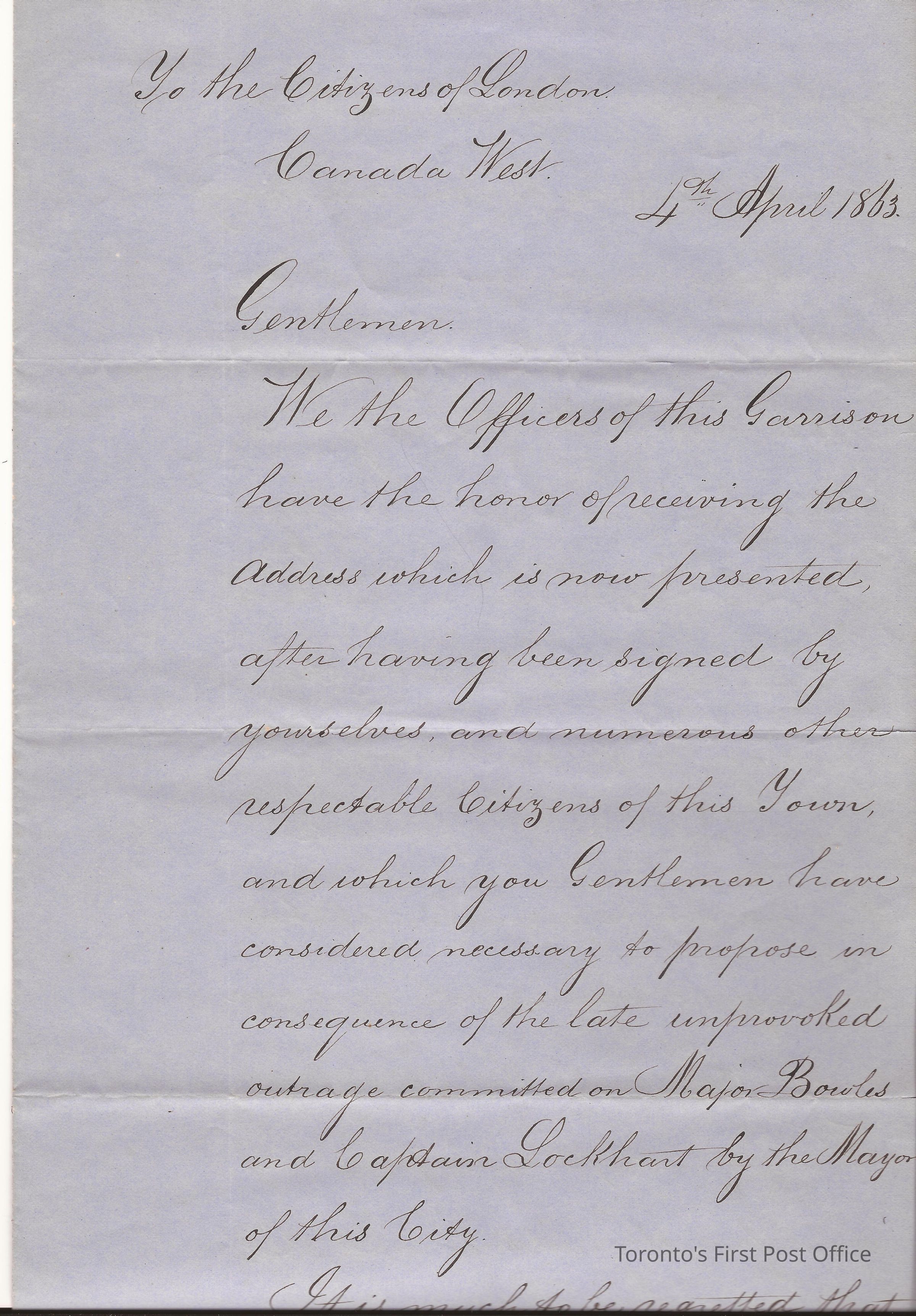 Letter; to the Citizens of London, Canada West; from W. Watts Lt. Colonel, 13th… Commanding Garrison; dated: London, Canada West 4th April 1863; re: thank you letter for support they gave to militia and Major Bowles and Captain Lockhart; black ink on heavy blue paper.Update Date
