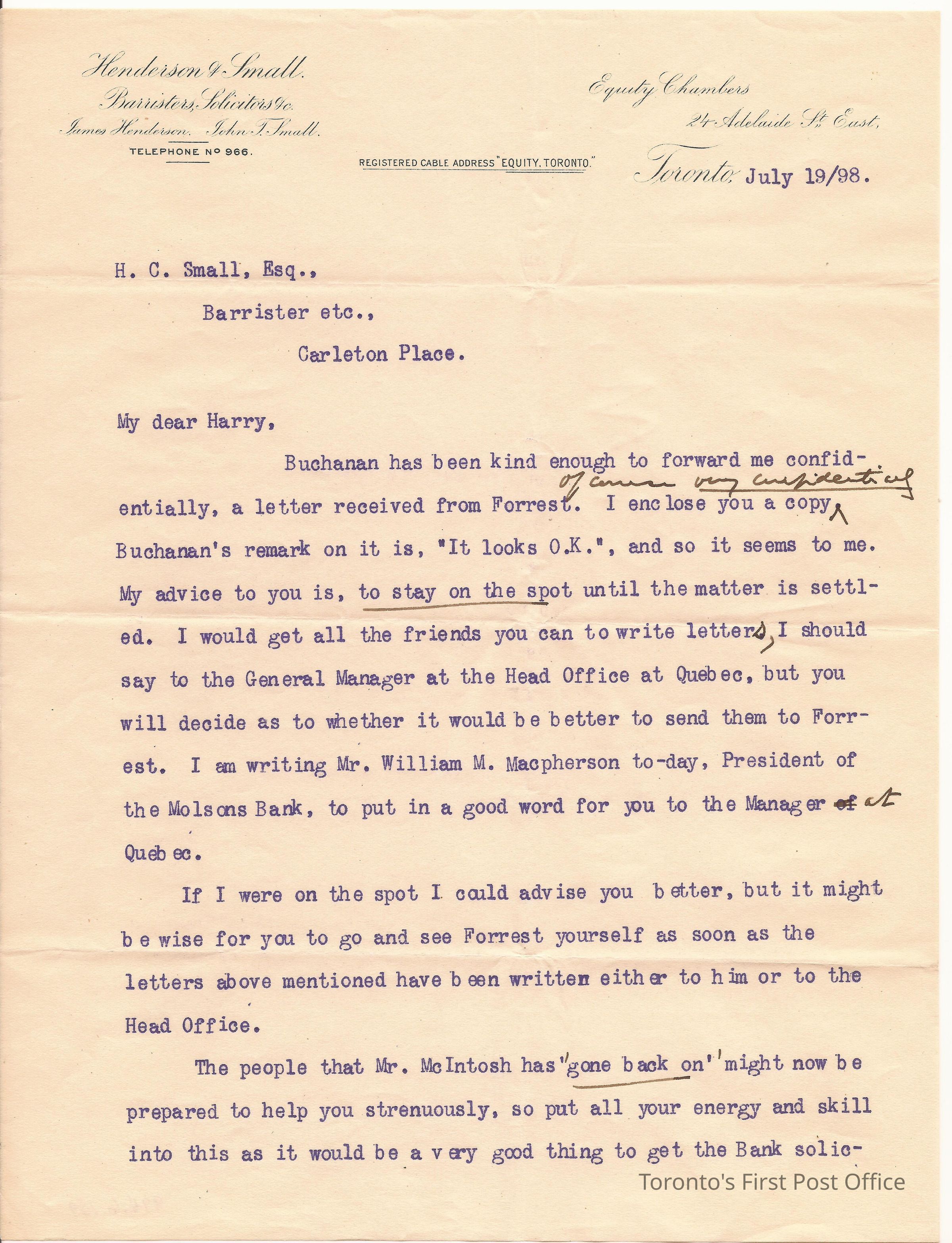 Letter; from Deputy Chambers, 24 Adelaide St. E.; to Harry; dated July 19 /98; on "Henderson & Small Barristers, Solicitors etc." letterhead; re: advice on how and when to apply as new solicitor for branch of Union Bank of Canada in Carlton Place; watermark: "BURMESE LINEN PARCHMENT"; black manuscript, purple print; 2 pp.Update Date