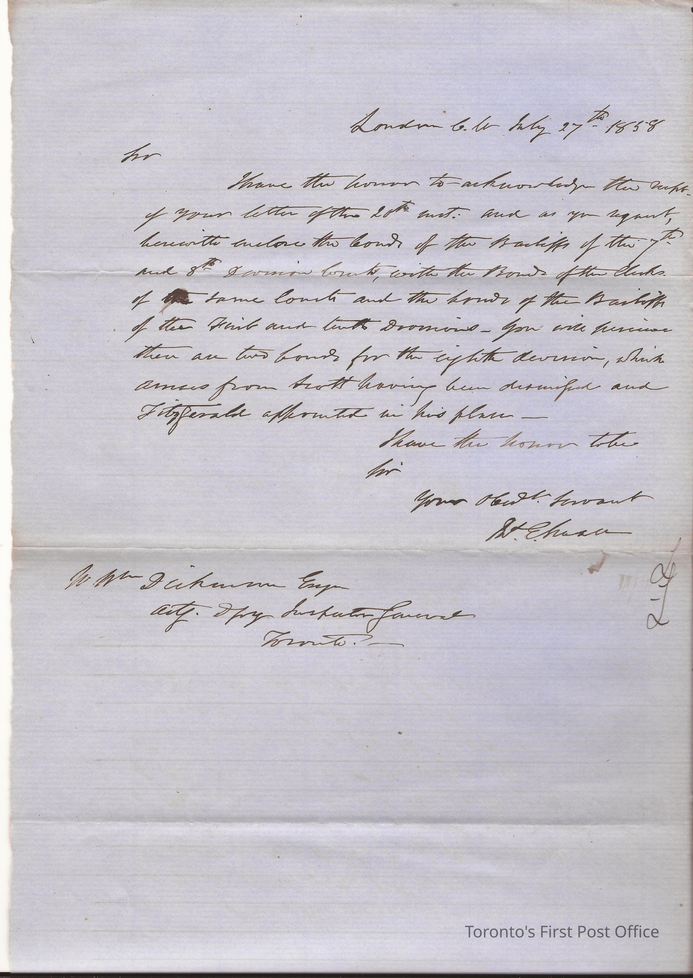 Letter; to W. Wm. Dickinson Esq., Actg Depy Inspector General Toronto; from Jas. E. Small, London; dated July 27th 1858; re: acknowledged receipt of letter requesting bonds of the Bailiffs of 7th and 8th Division and also bonds of Bailiffs of 1st and 10th Division; black ink on blue, pre-lined laid paper.Dimensions