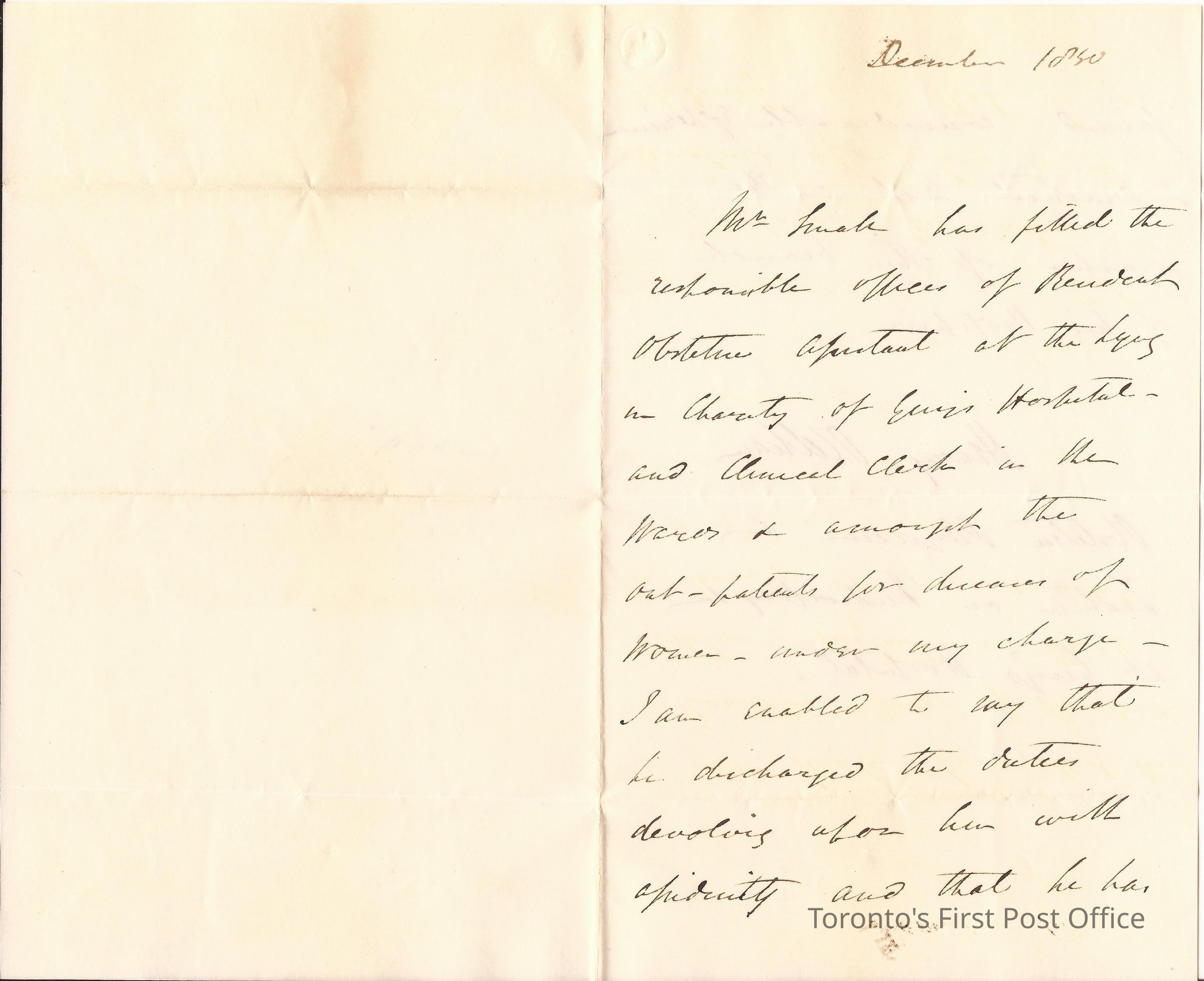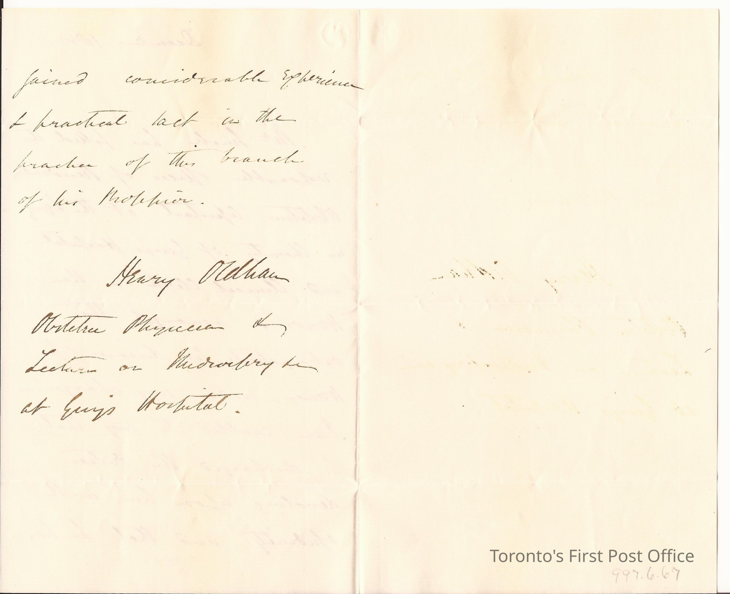 Letter from Henry Oldham, Obstetrician, Physician and Lecturer… Guy's Hospital; a letter of recommendation that Small completed his offices as Obstetric assistant at Guy's; laid paper; incomplete watermark.Dimensions