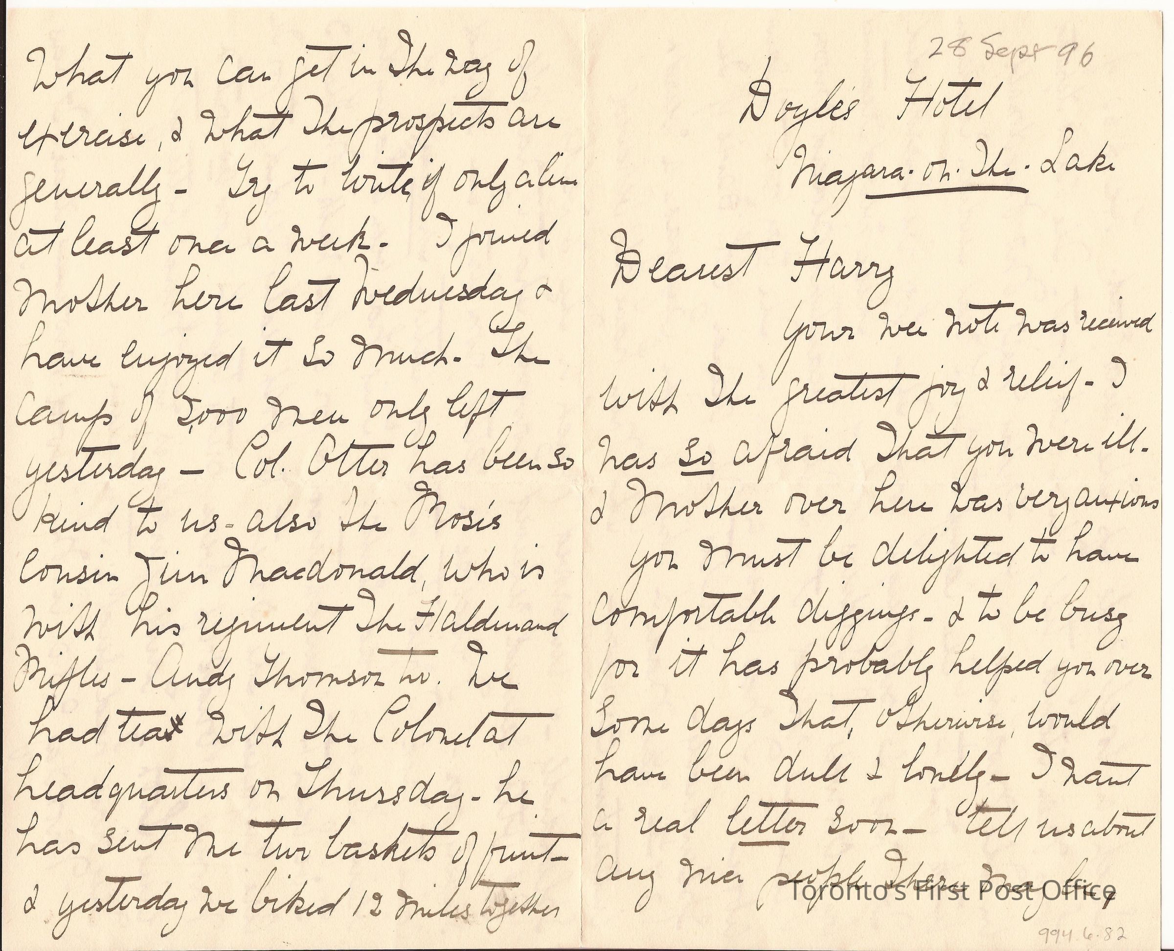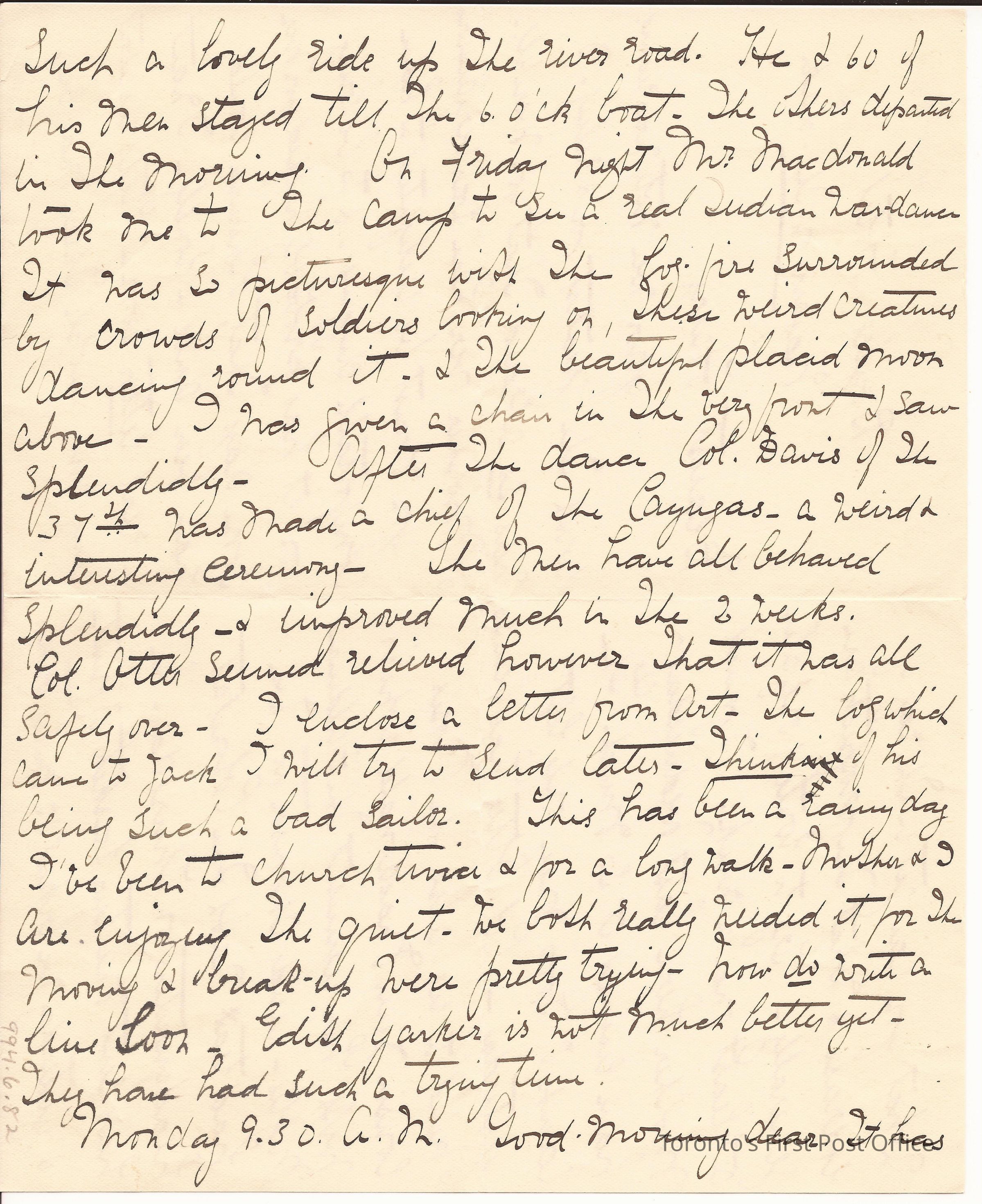 Letter; to Harry; from Fan; watermark: scrollwork, flowers, leaves, "VELLUM"; black ink; re: personal letter about mother, visits, neighbours, biking, Indian war dance.Update Date