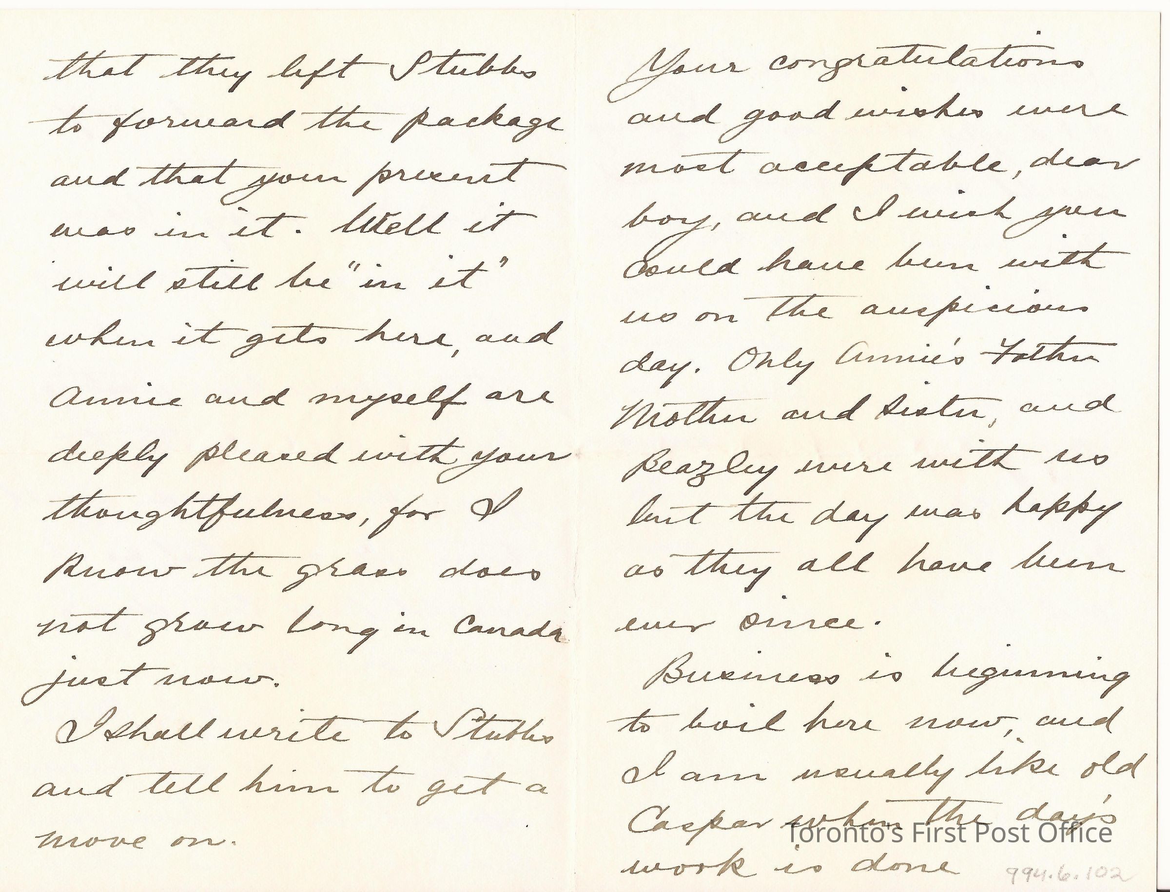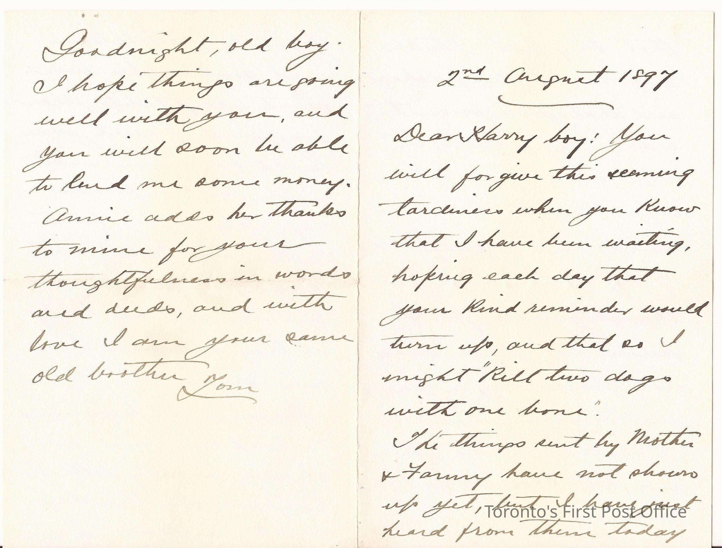 Letter; from Tom; to Harry; dated 2nd August 1897; re: congratulations to Harry, visitors for the celebration, and package not yet arrived; black ink on heavy paper.Dimensions