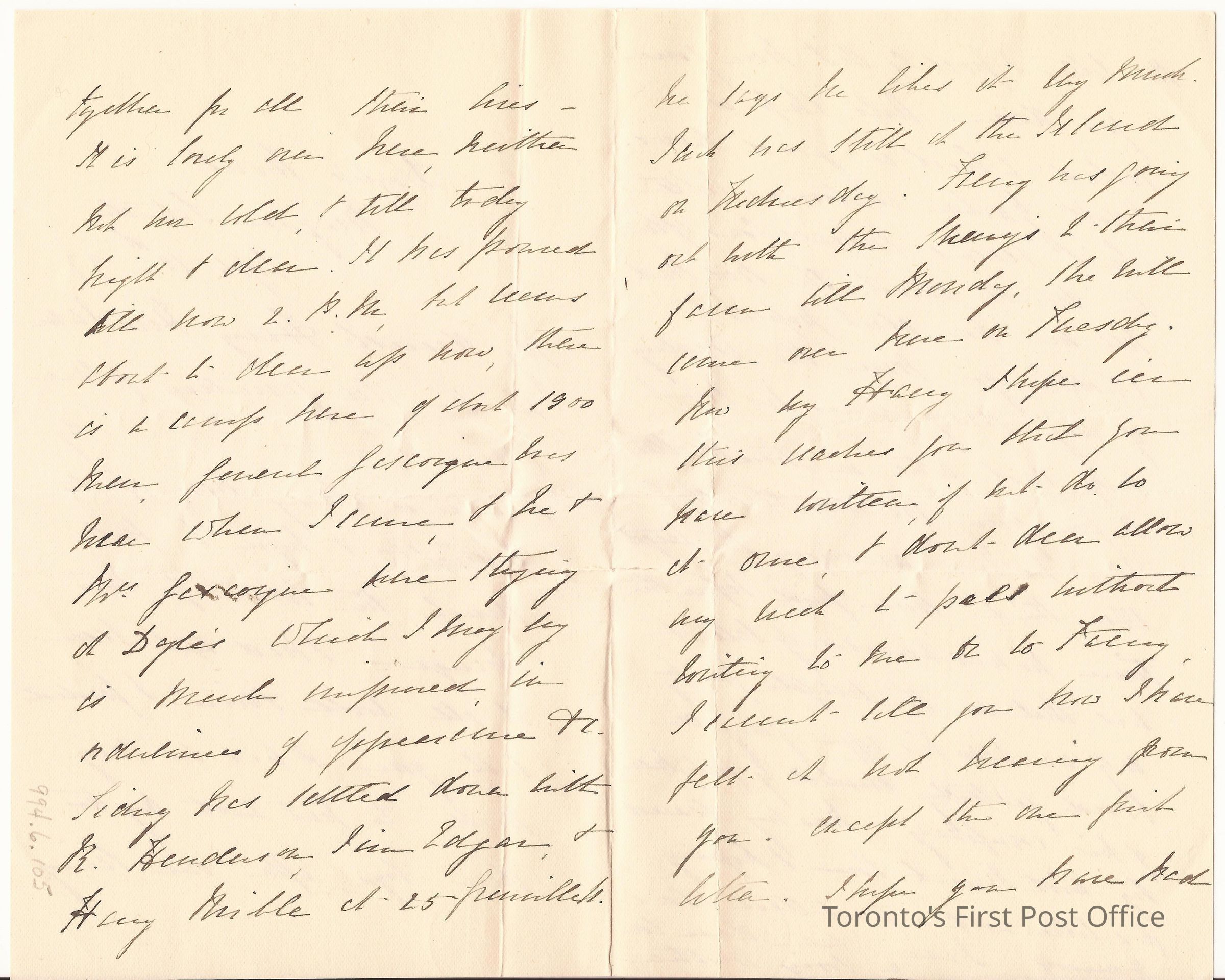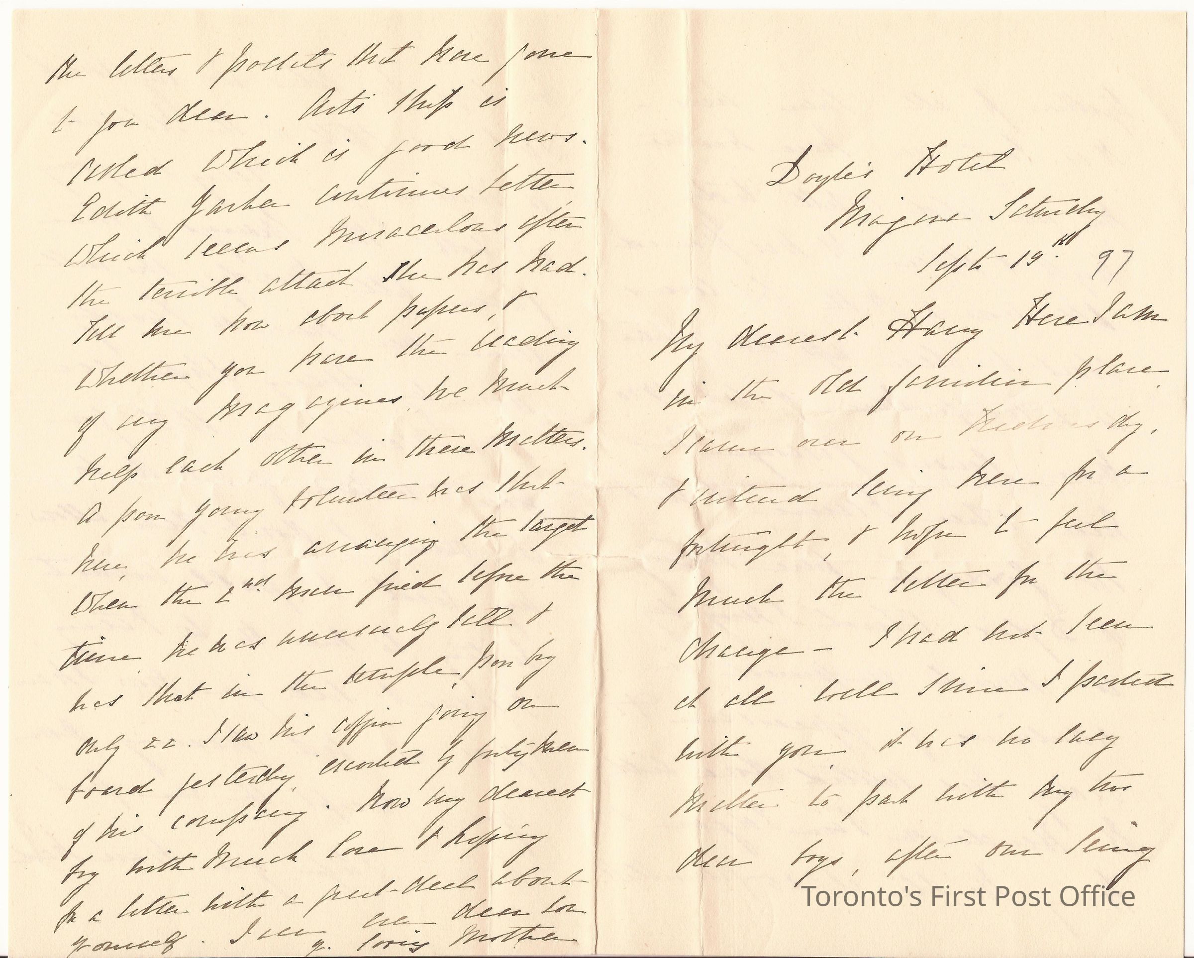 Letter; to Harry; from Mother; dated: Doyle's Hotel, Niagara, Saturday, Sept 19th 97; re: 2 weeks at Niagara; death of young volunteer via shotgun wound and burial; black ink; watermark: shield surmounting "VELLUM" on banner.Dimensions